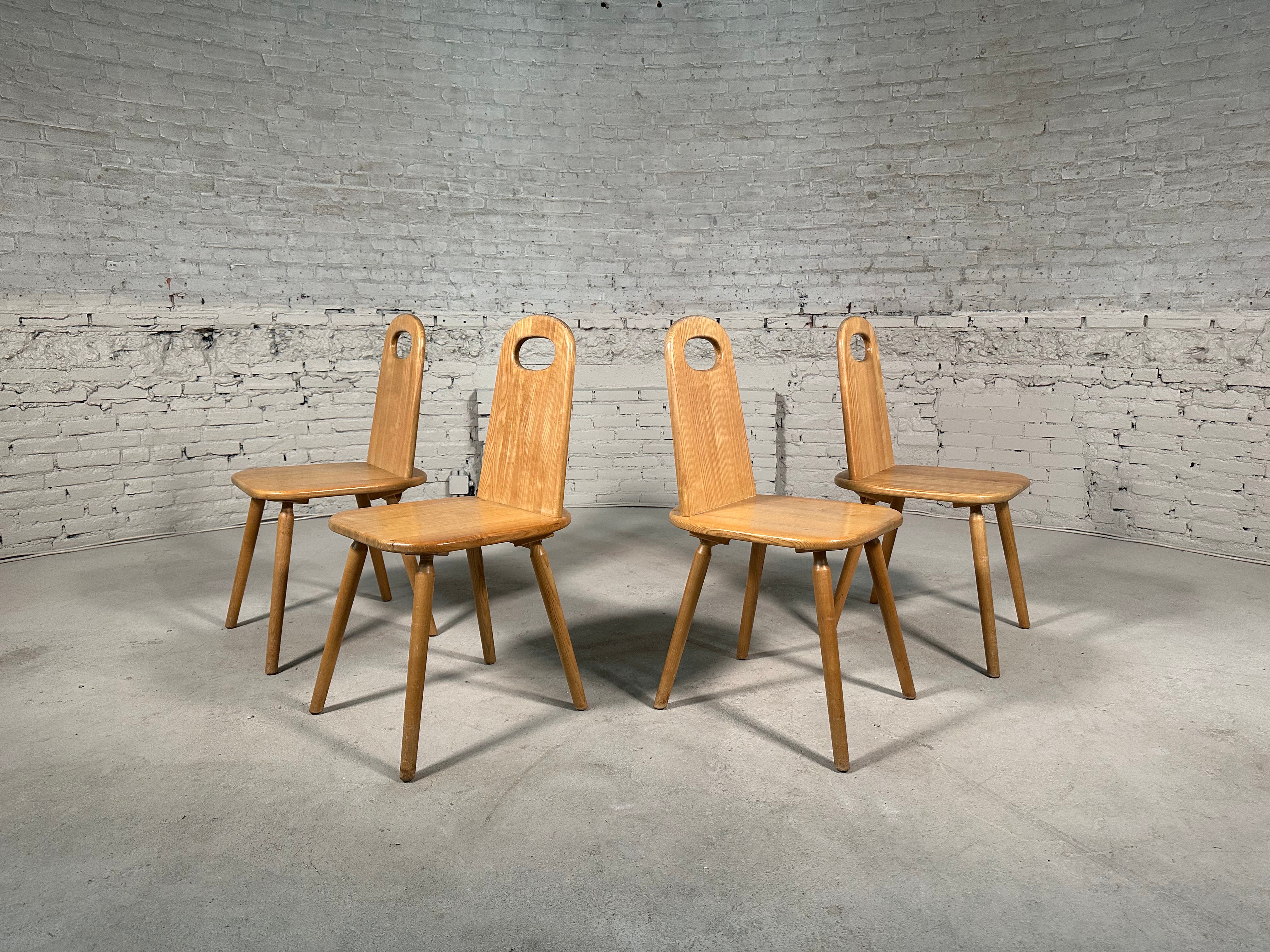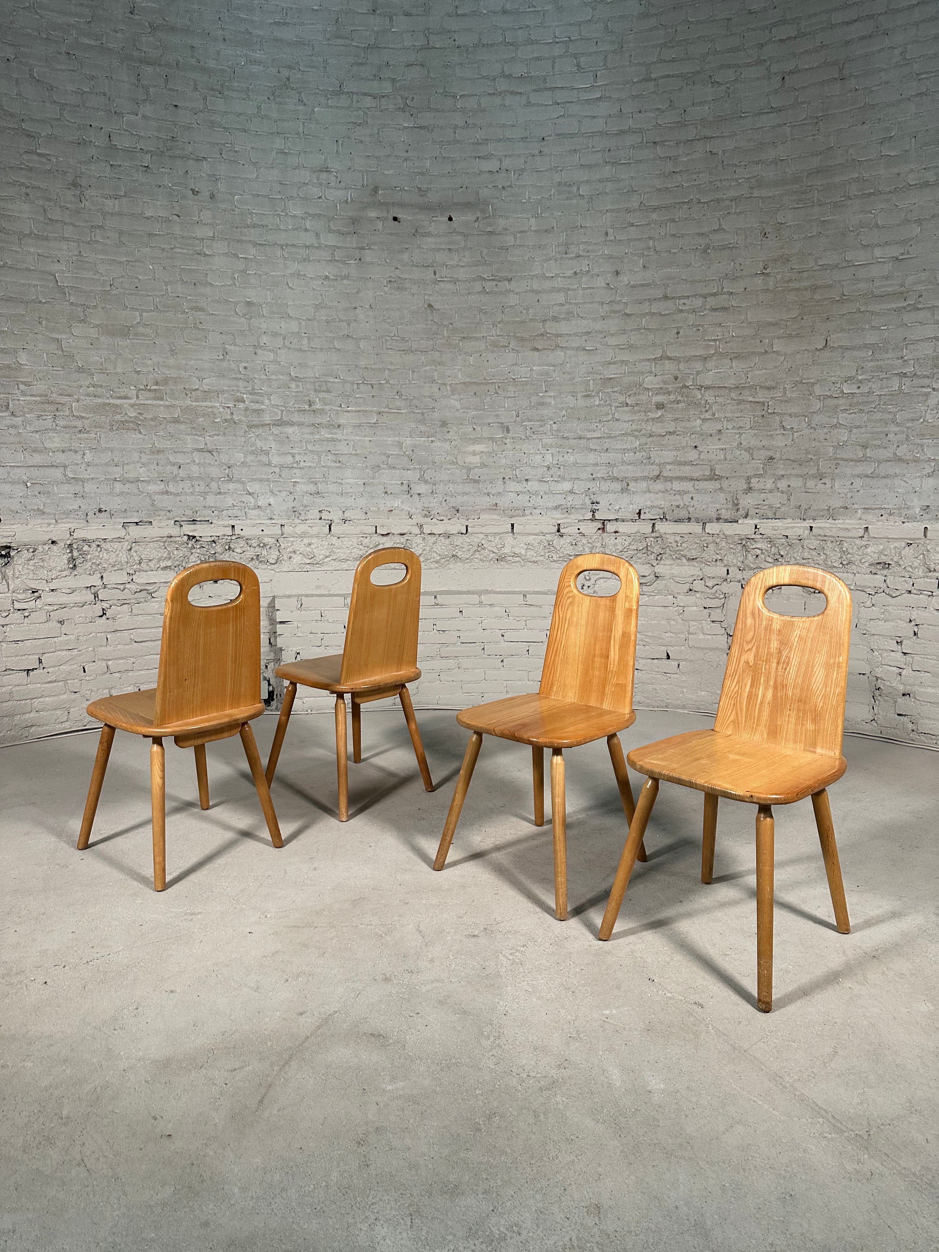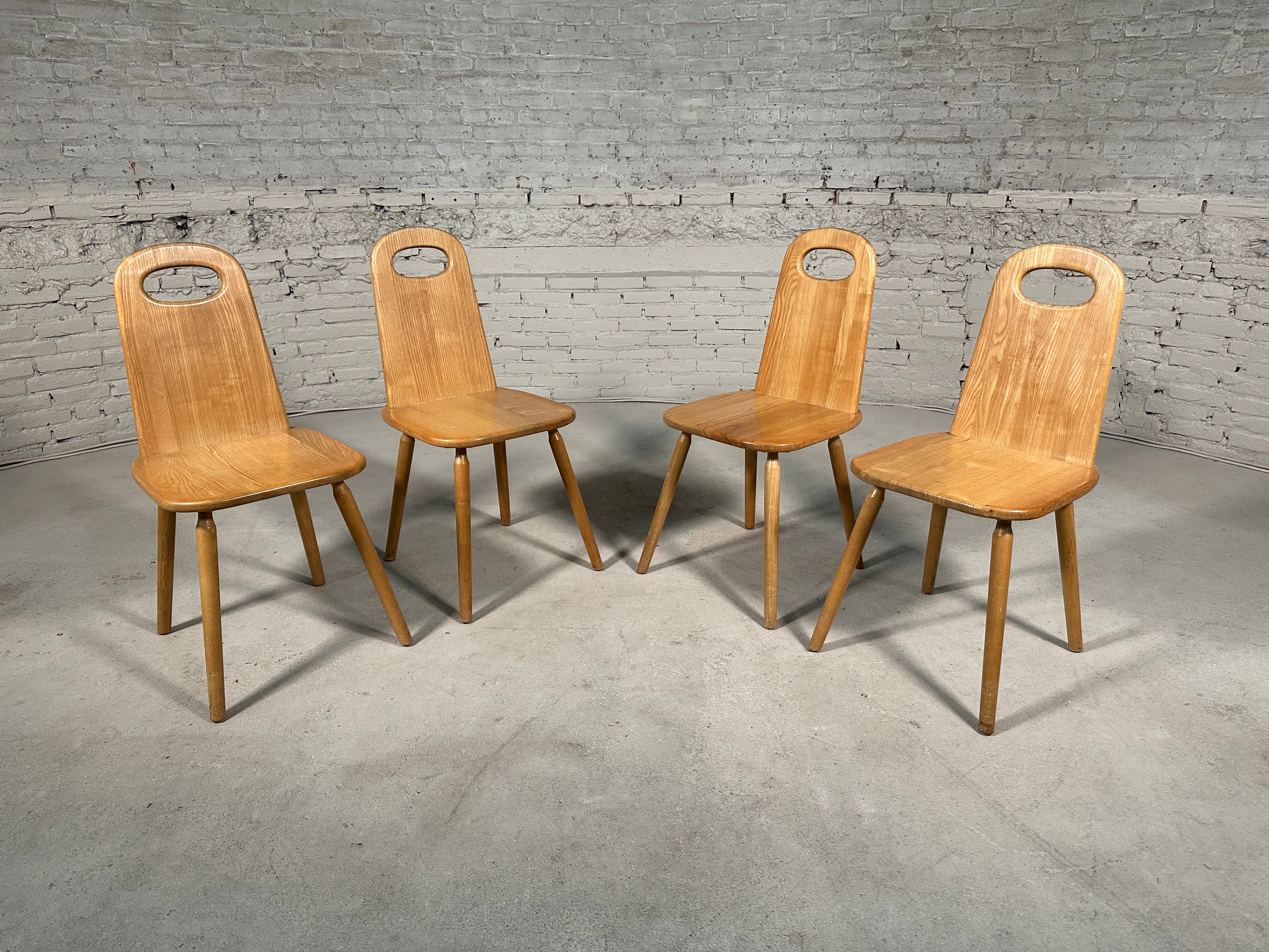 This set of four dining chairs are attributed to Eero Aarnio, 1960's. This set holds a strong expression and has an organic design with rounded corners and edges. The legs are high and tapered which provides an open elegant look. The backrests are static and the opening at the top creates a more playful look. The wood structure has a beautiful grain. Please note that these items are in good, used condition. Price is for the set.