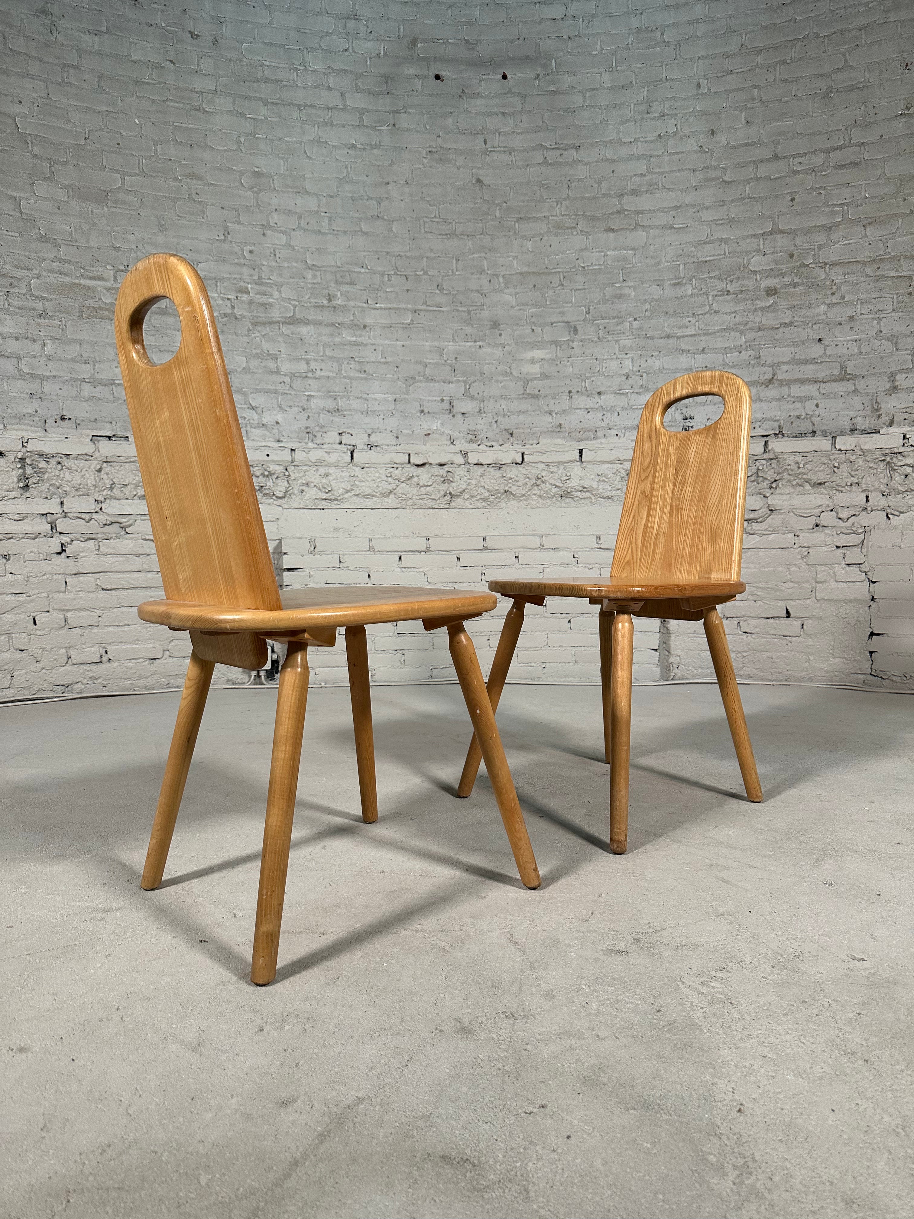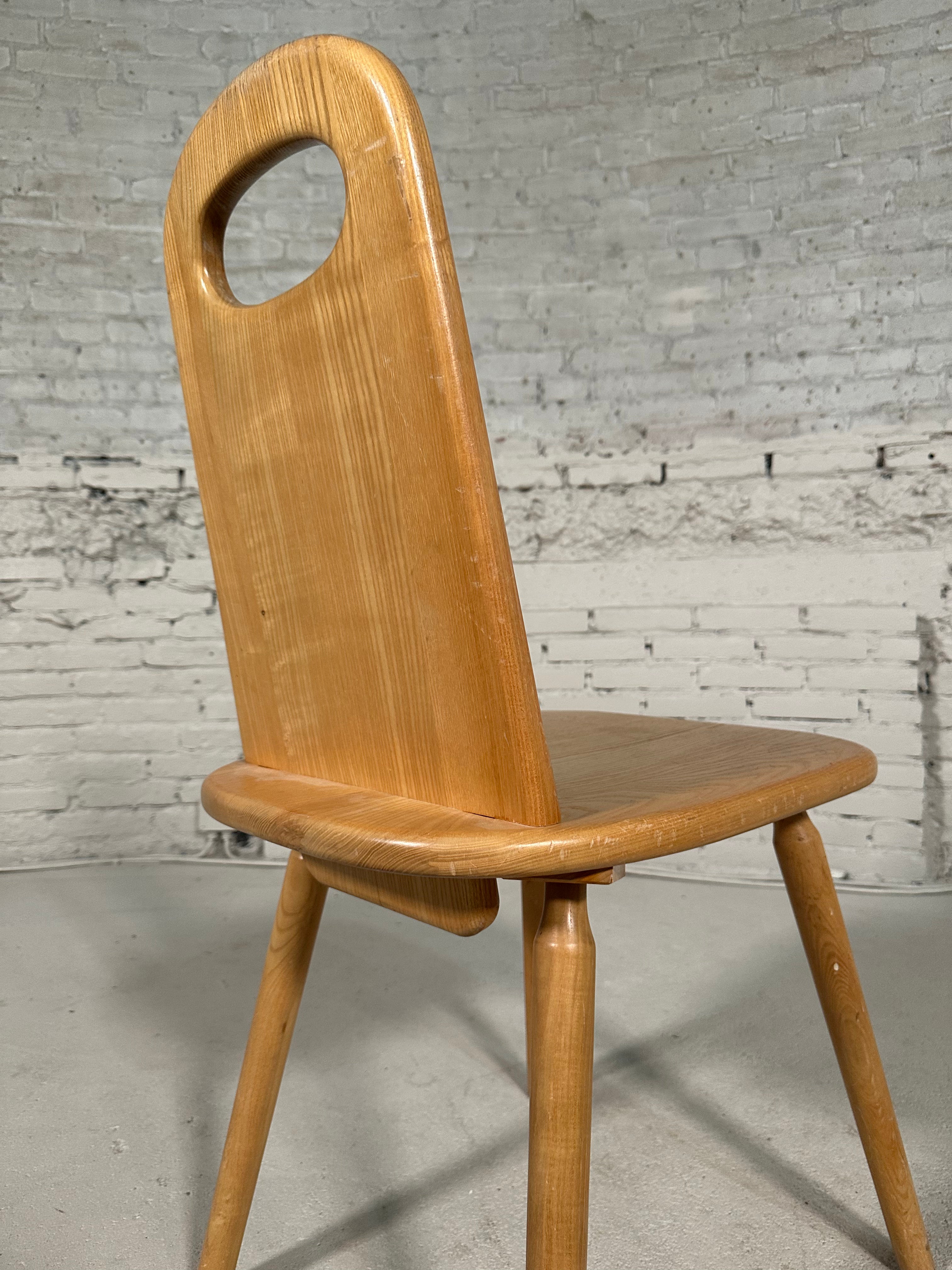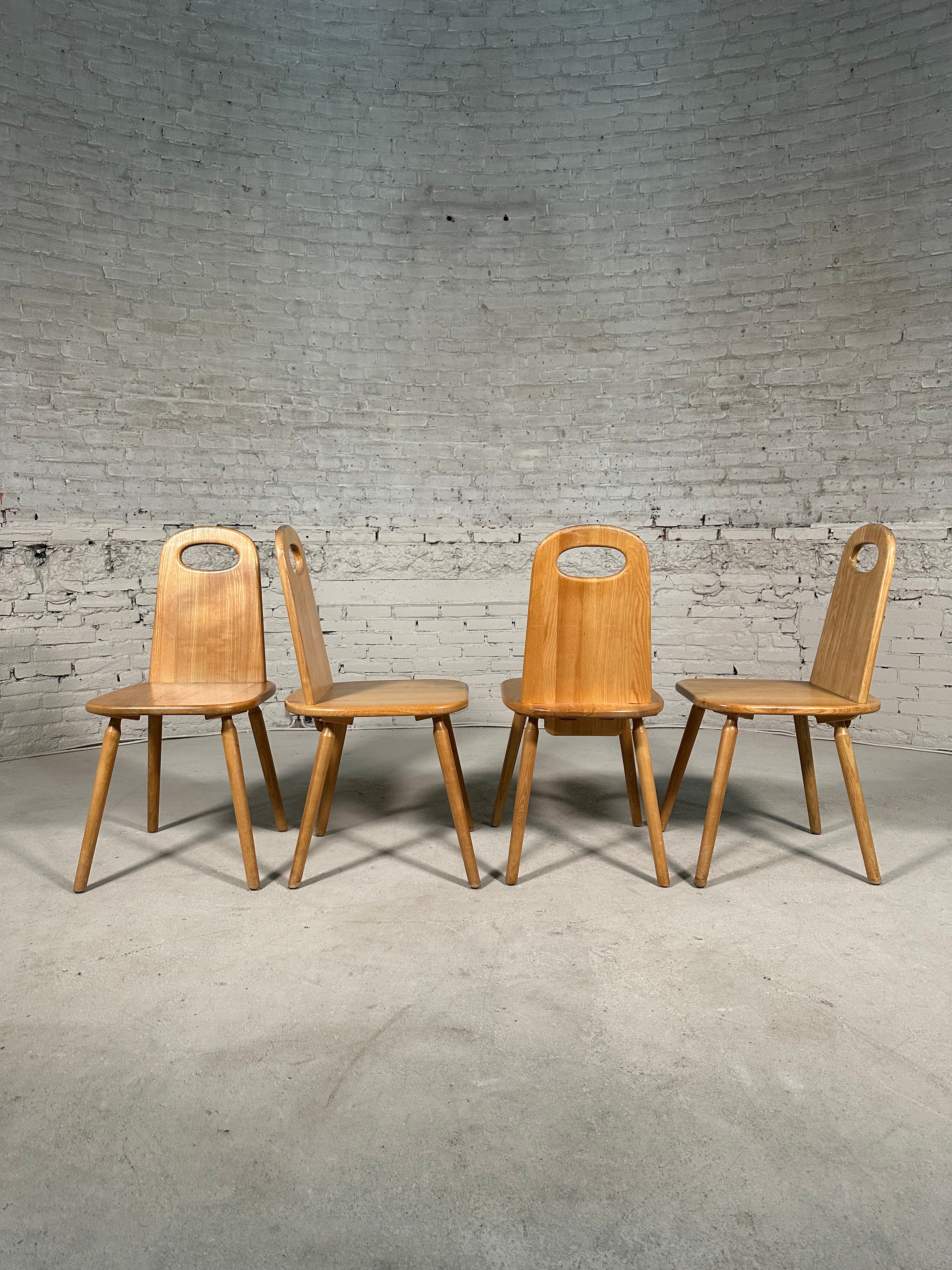 This set of four dining chairs are attributed to Eero Aarnio, 1960's. This set holds a strong expression and has an organic design with rounded corners and edges. The legs are high and tapered which provides an open elegant look. The backrests are static and the opening at the top creates a more playful look. The wood structure has a beautiful grain. Please note that these items are in good, used condition. Price is for the set.