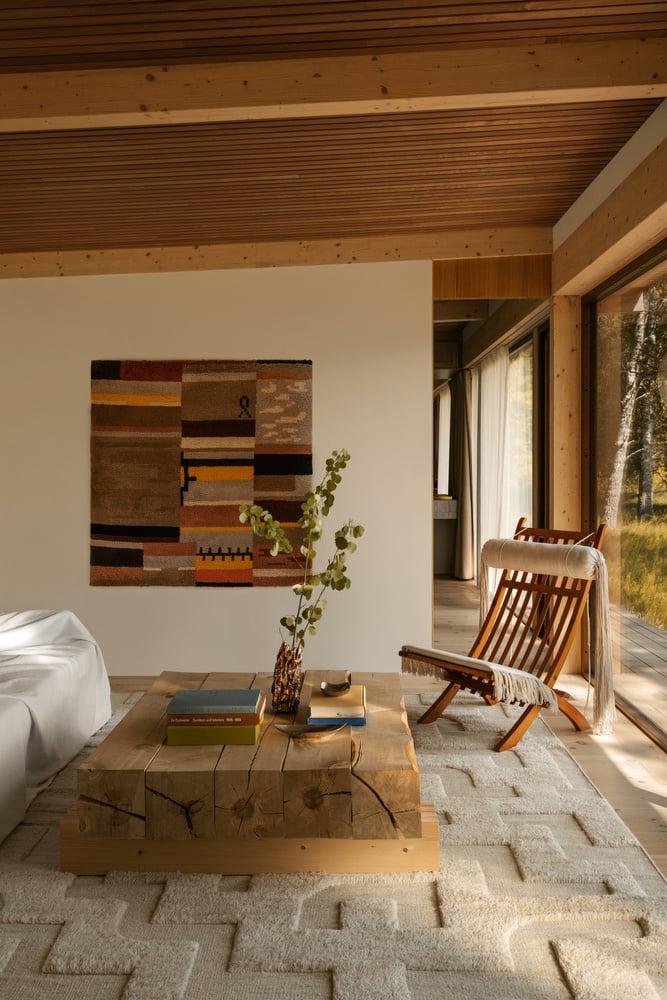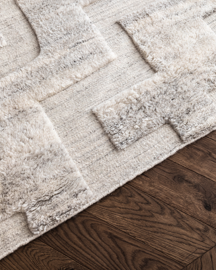 Raw bohemian textures are elevated with architectural lines in Boho, inspired by the limestone steps of grand stairs to historic Stockholm buildings. Crafted from all-natural, undyed European wool to a contemporary geometric pattern that combines a flat-woven canvas with lush hand-knotted pile.