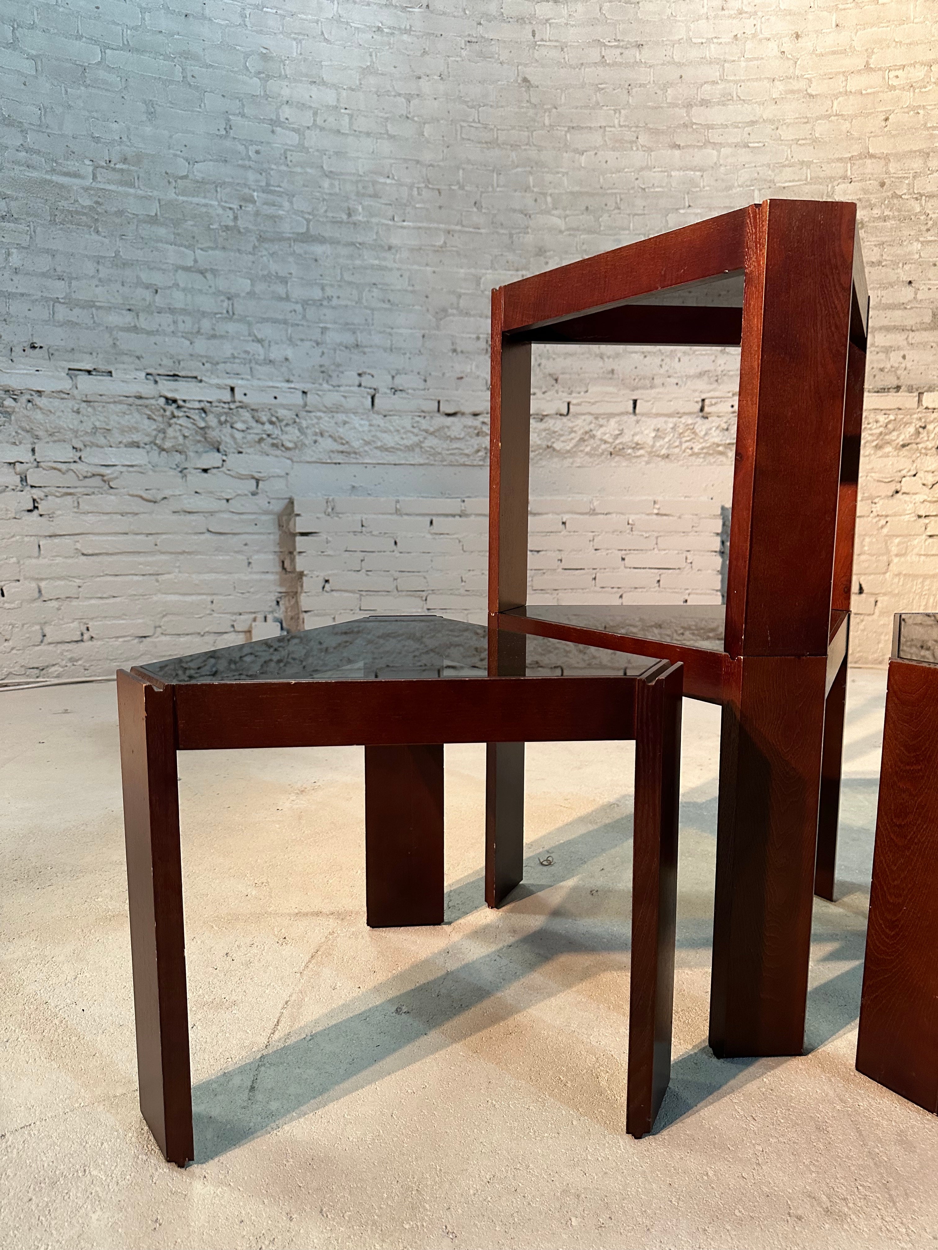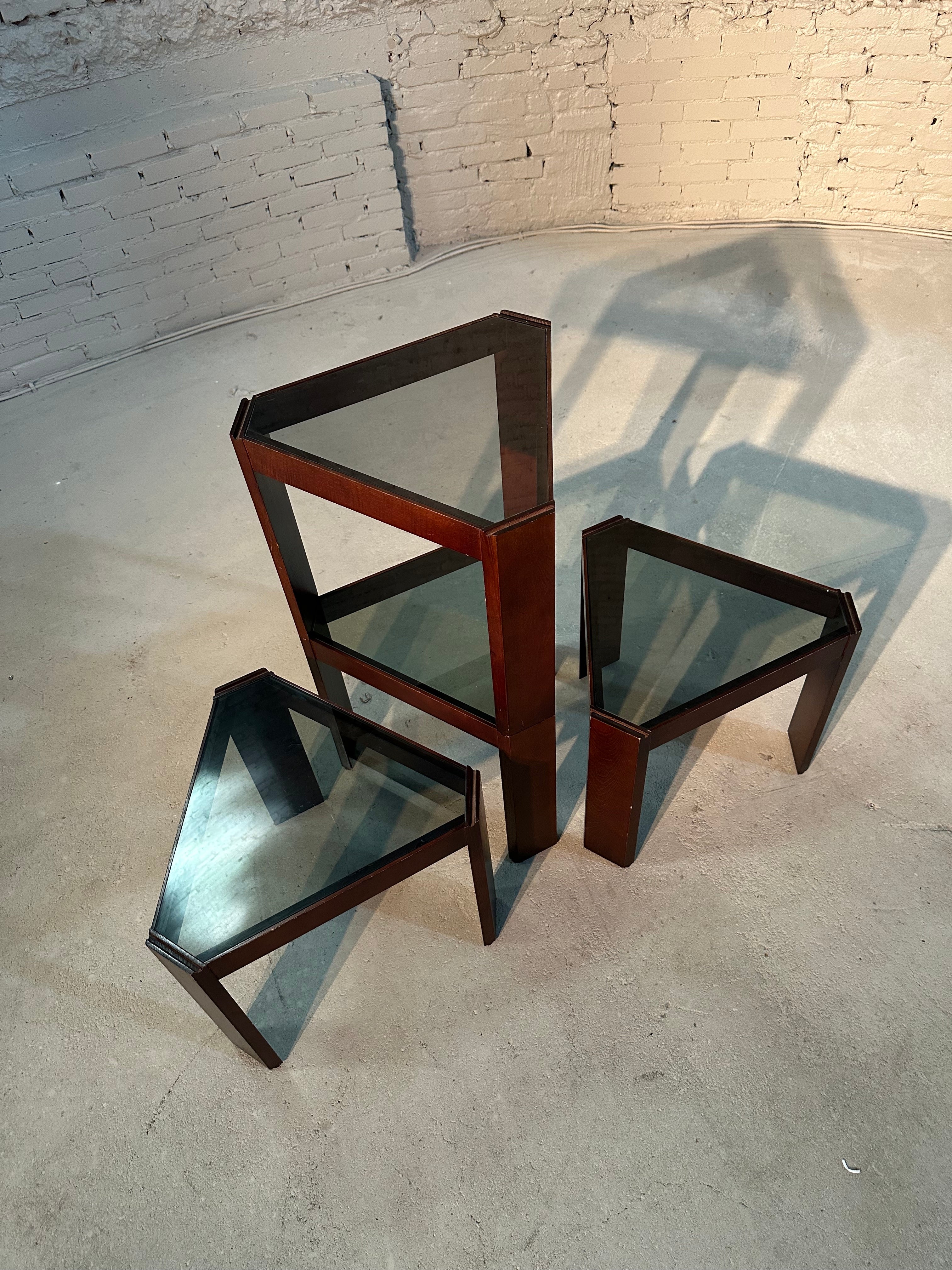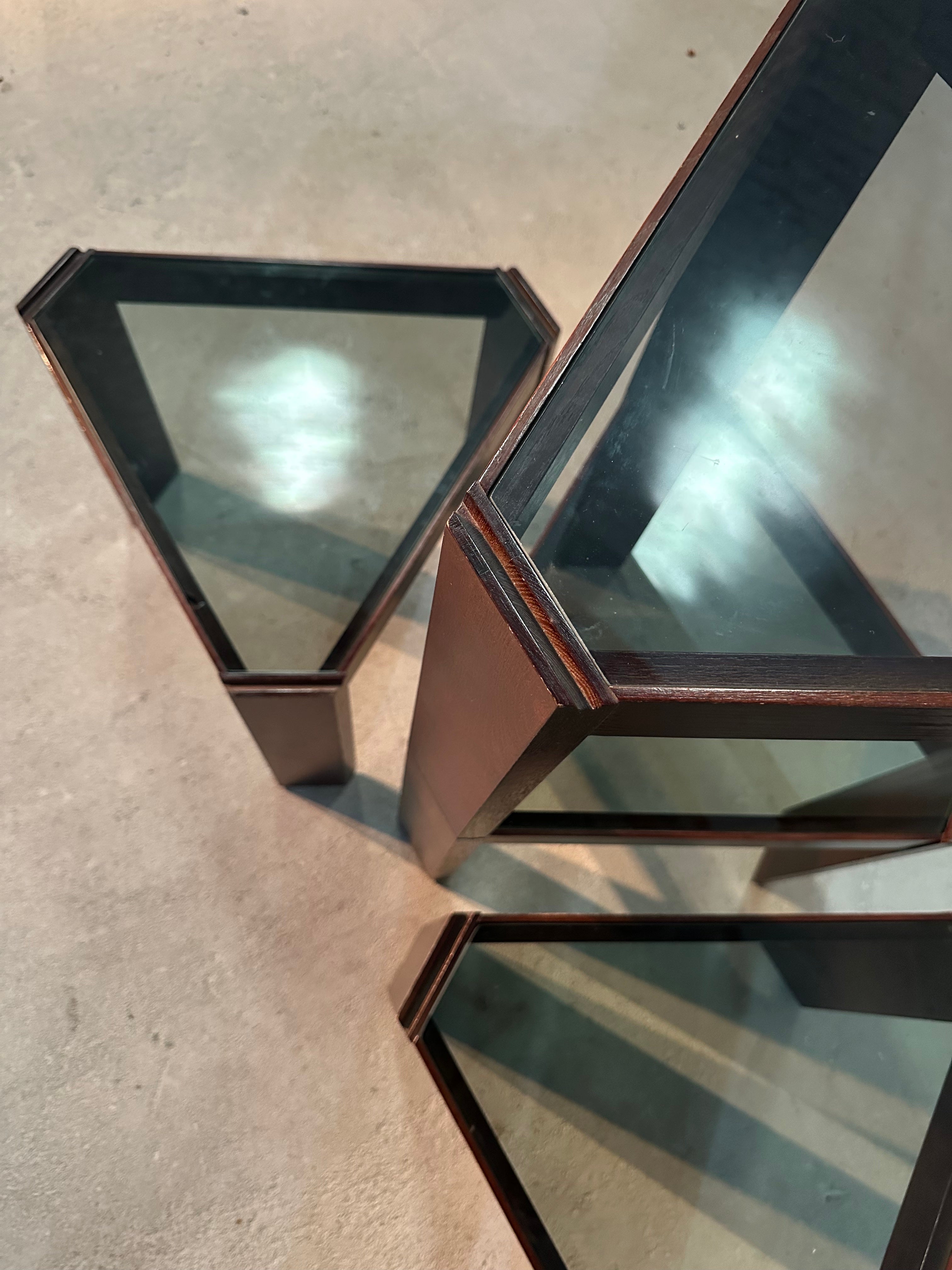 These nesting tables were produced in the 1970's in Italy. They can be arranged in many different forms or they can be stacked on top of each other so it will transform into a unique closet. At the top and bottom of the feet there are grooves, for amazing stability when they are superimposed. They're made from a wengé wooden frame with a smoked glass table top.