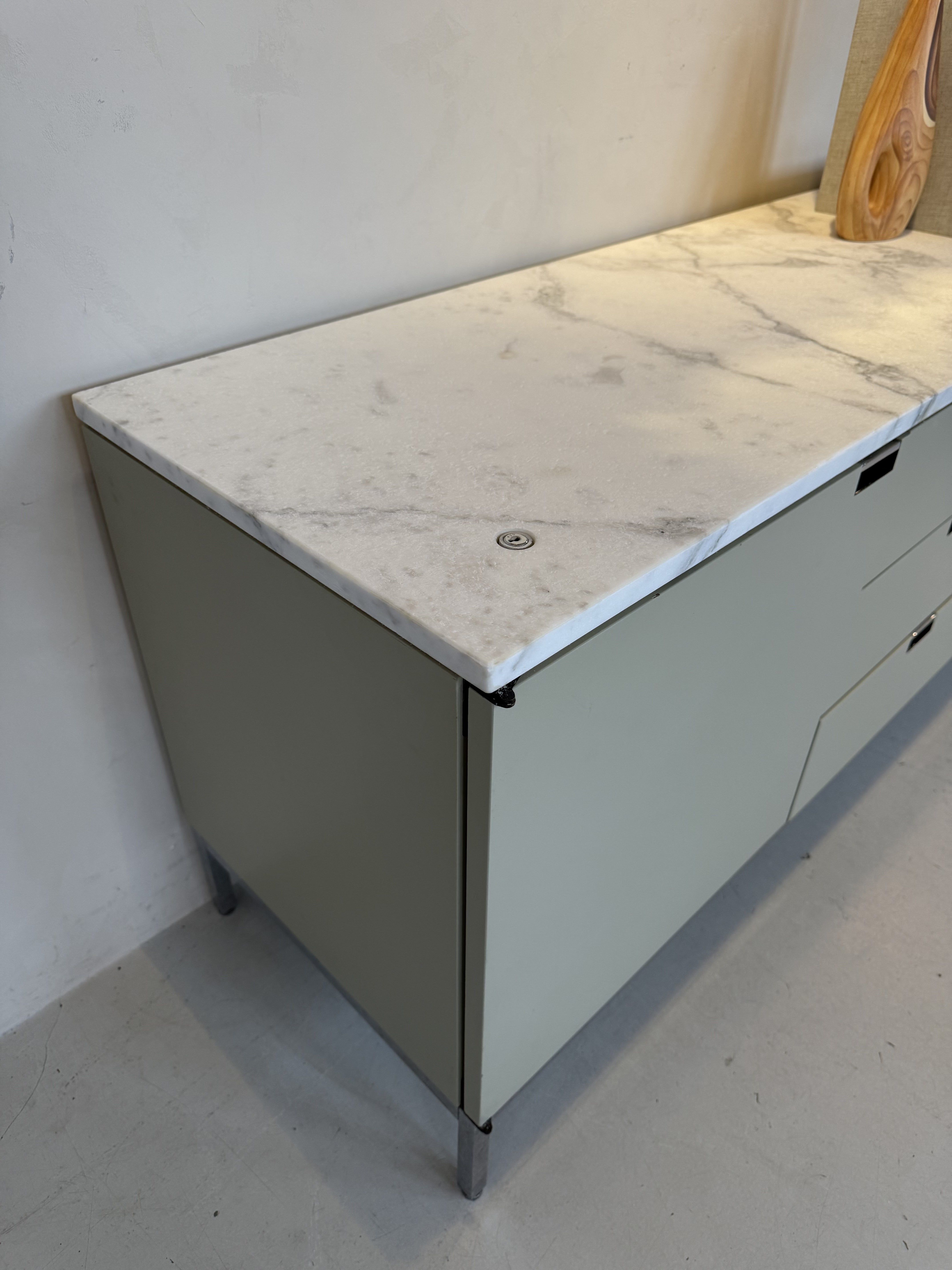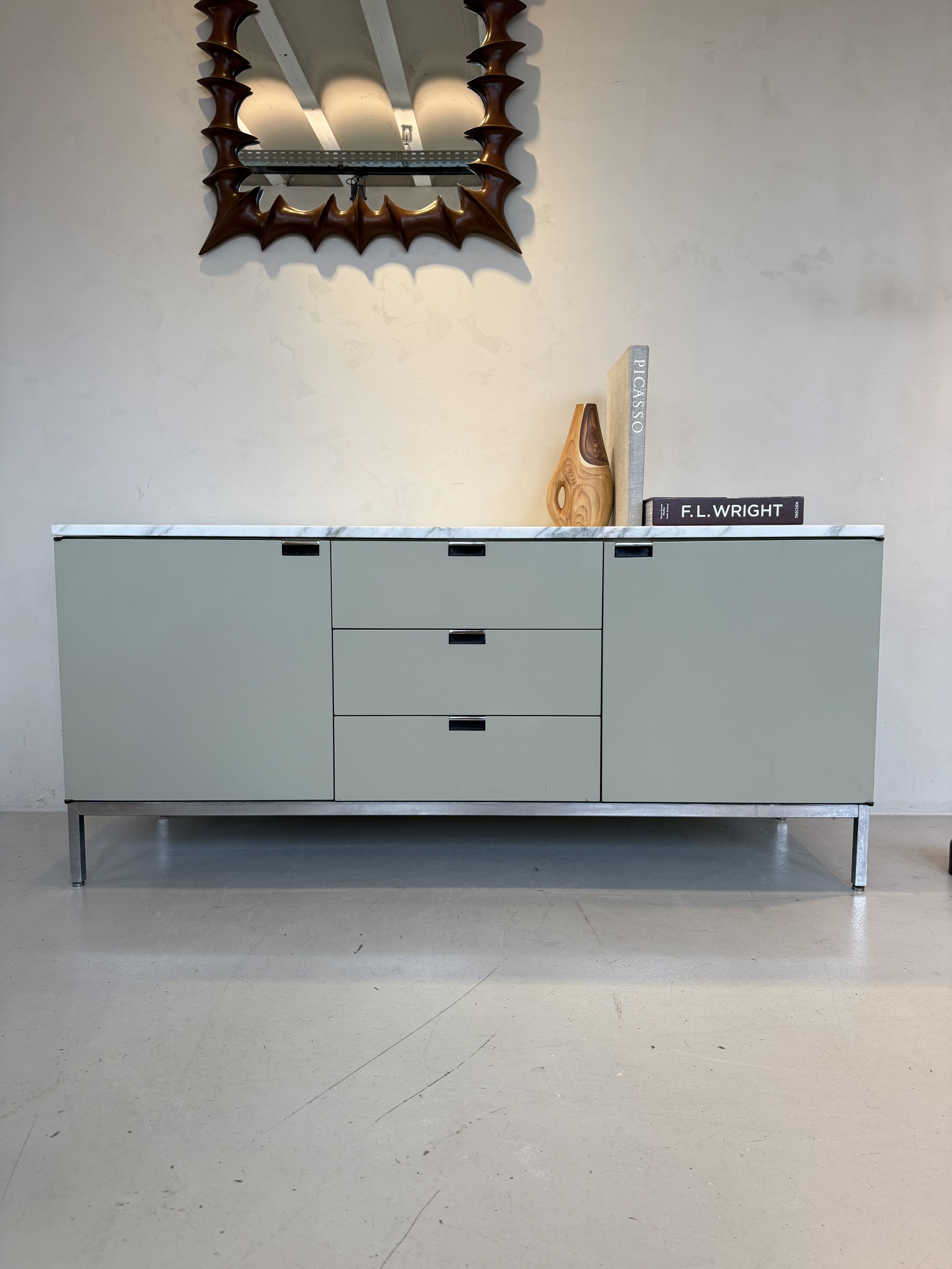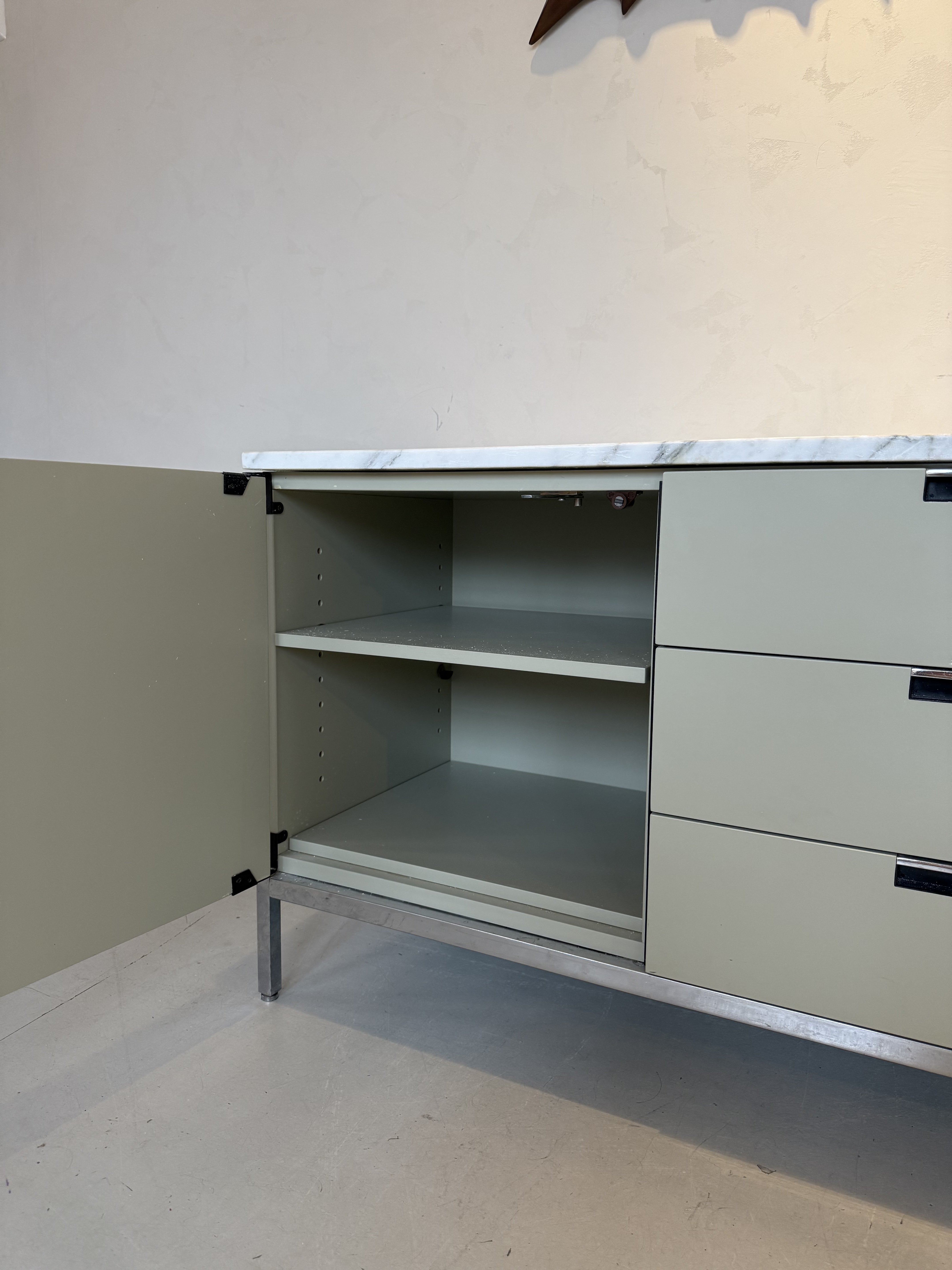 Elegant credenza designed by Florence Knoll for Knoll in 1954. Crafted with greyish wood veneer, metal accents & carrara marble top this cabinet seamlessly blends functionality with timeless elegance. Offering both open shelving and closed drawers, it provides versatile storage solutions ideal for both home and office spaces. The keyhole in the top can be used to lock the left door.