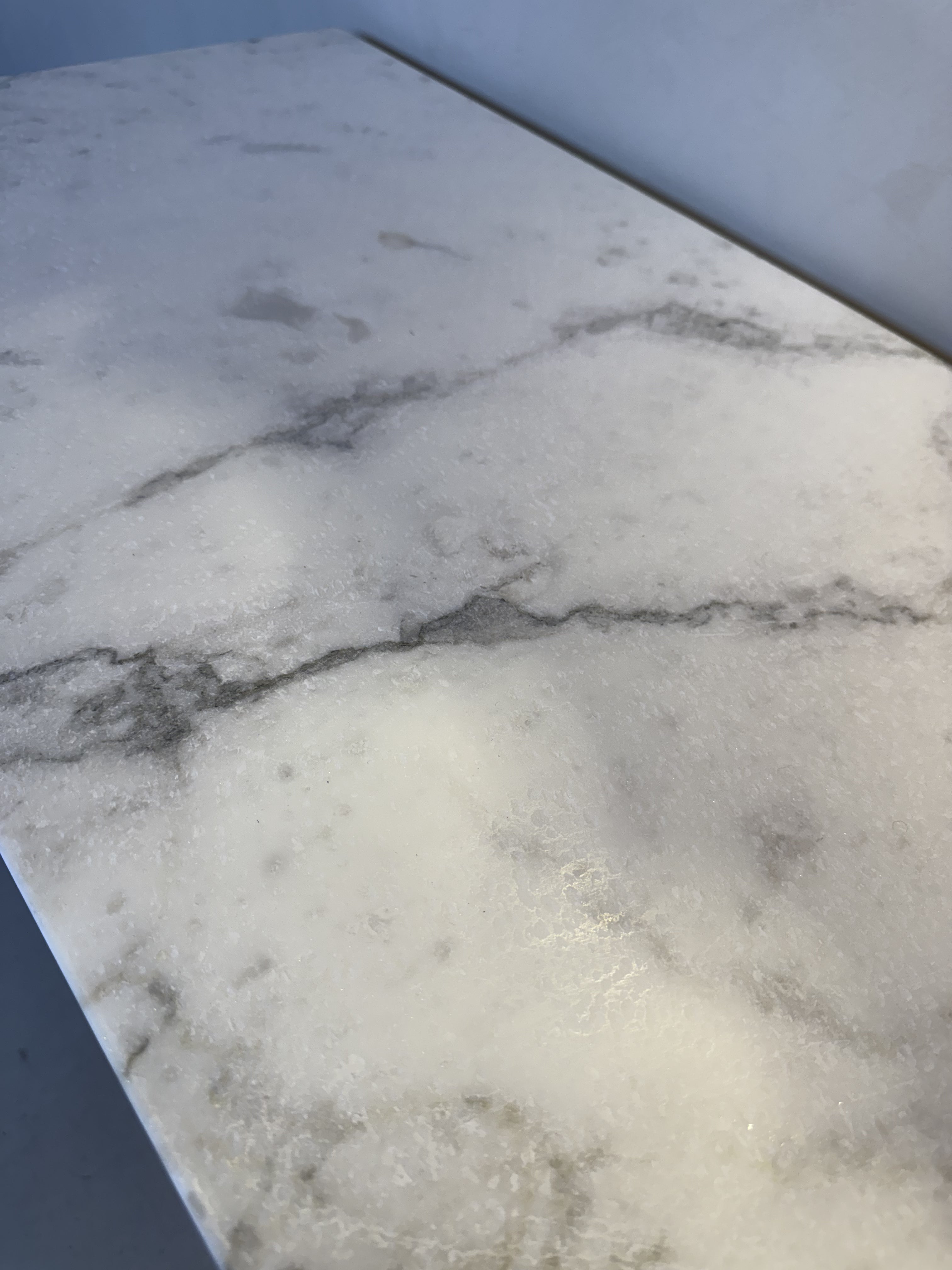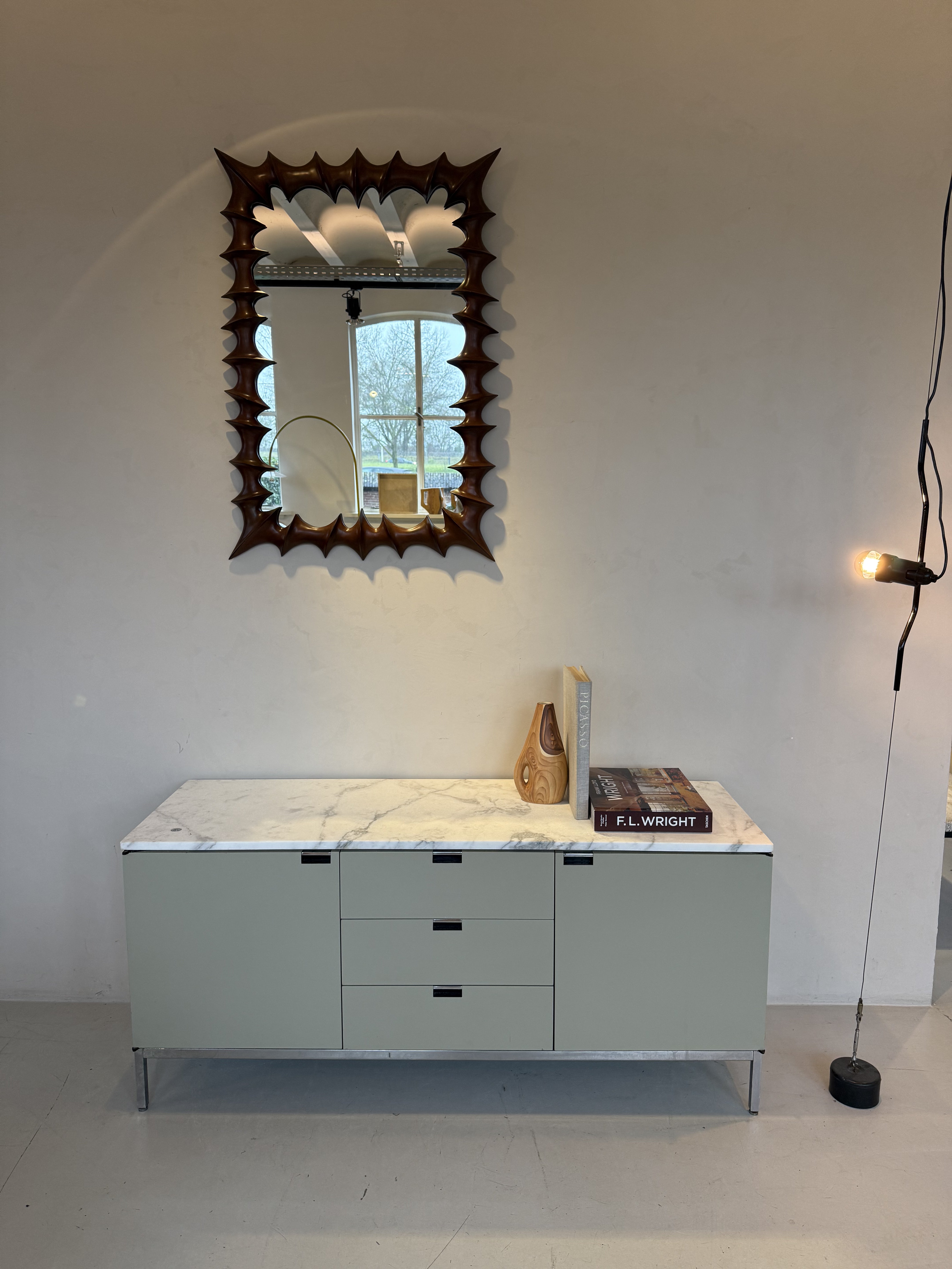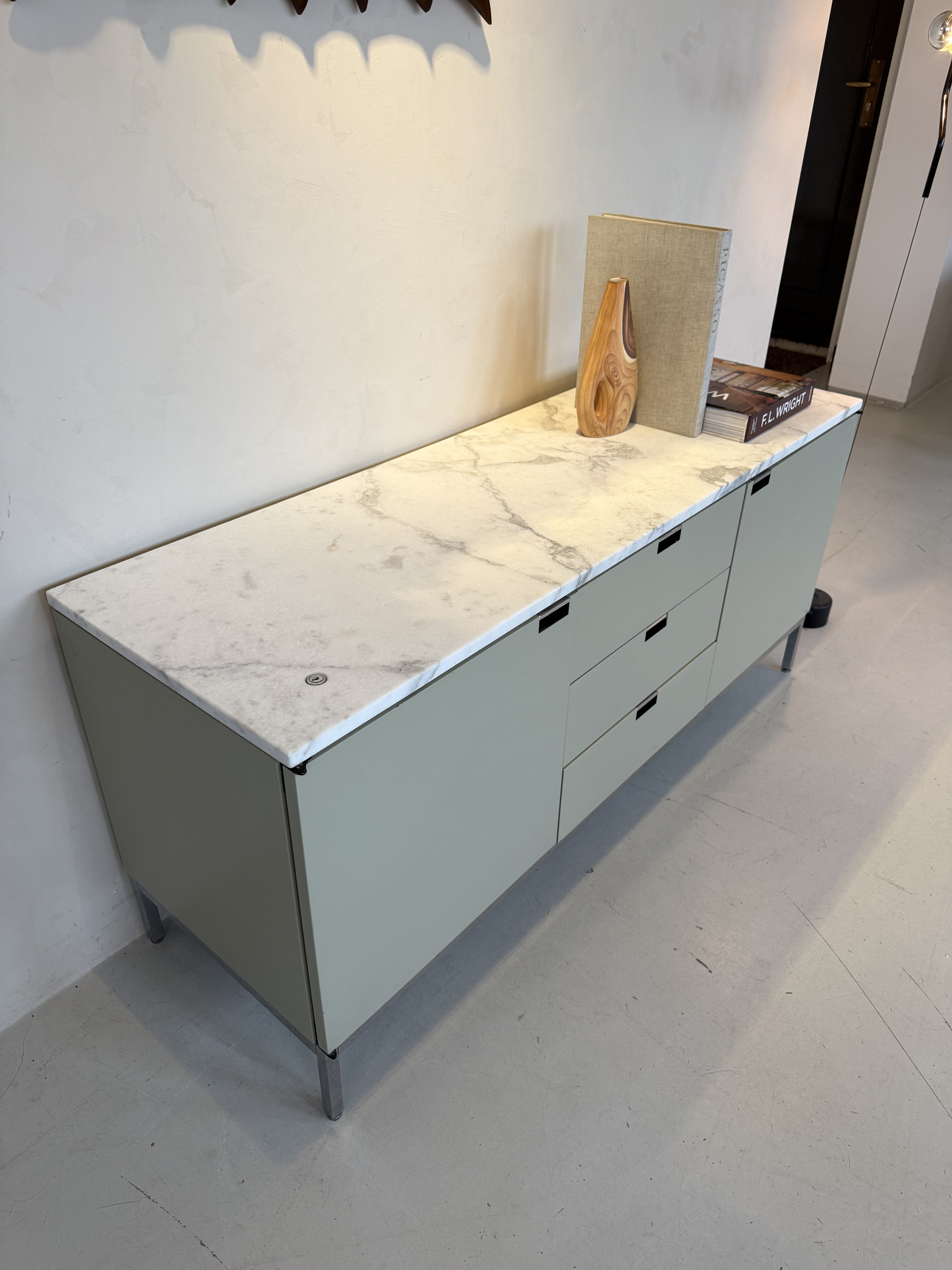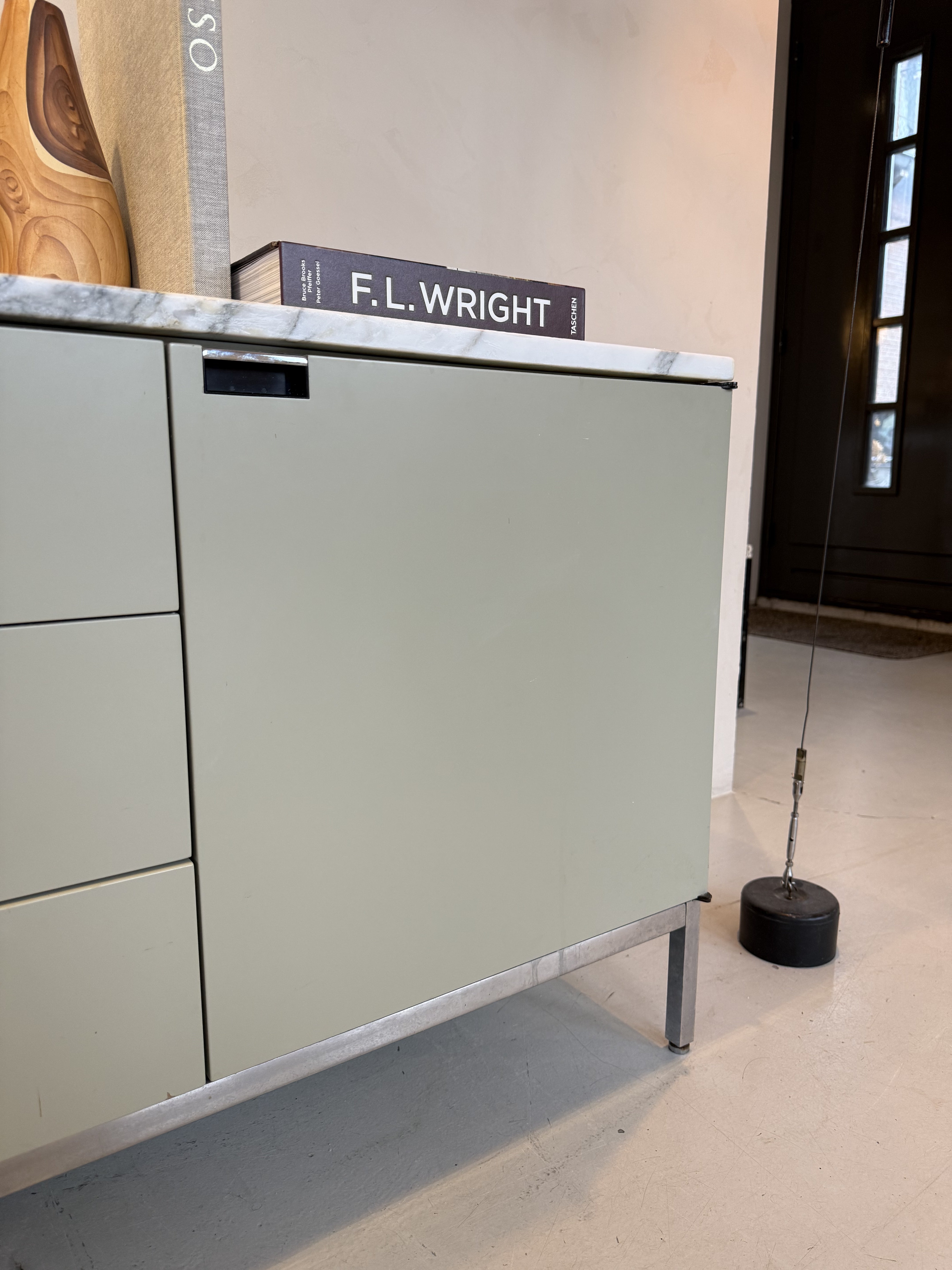 Elegant credenza designed by Florence Knoll for Knoll in 1954. Crafted with greyish wood veneer, metal accents & carrara marble top this cabinet seamlessly blends functionality with timeless elegance. Offering both open shelving and closed drawers, it provides versatile storage solutions ideal for both home and office spaces. The keyhole in the top can be used to lock the left door.