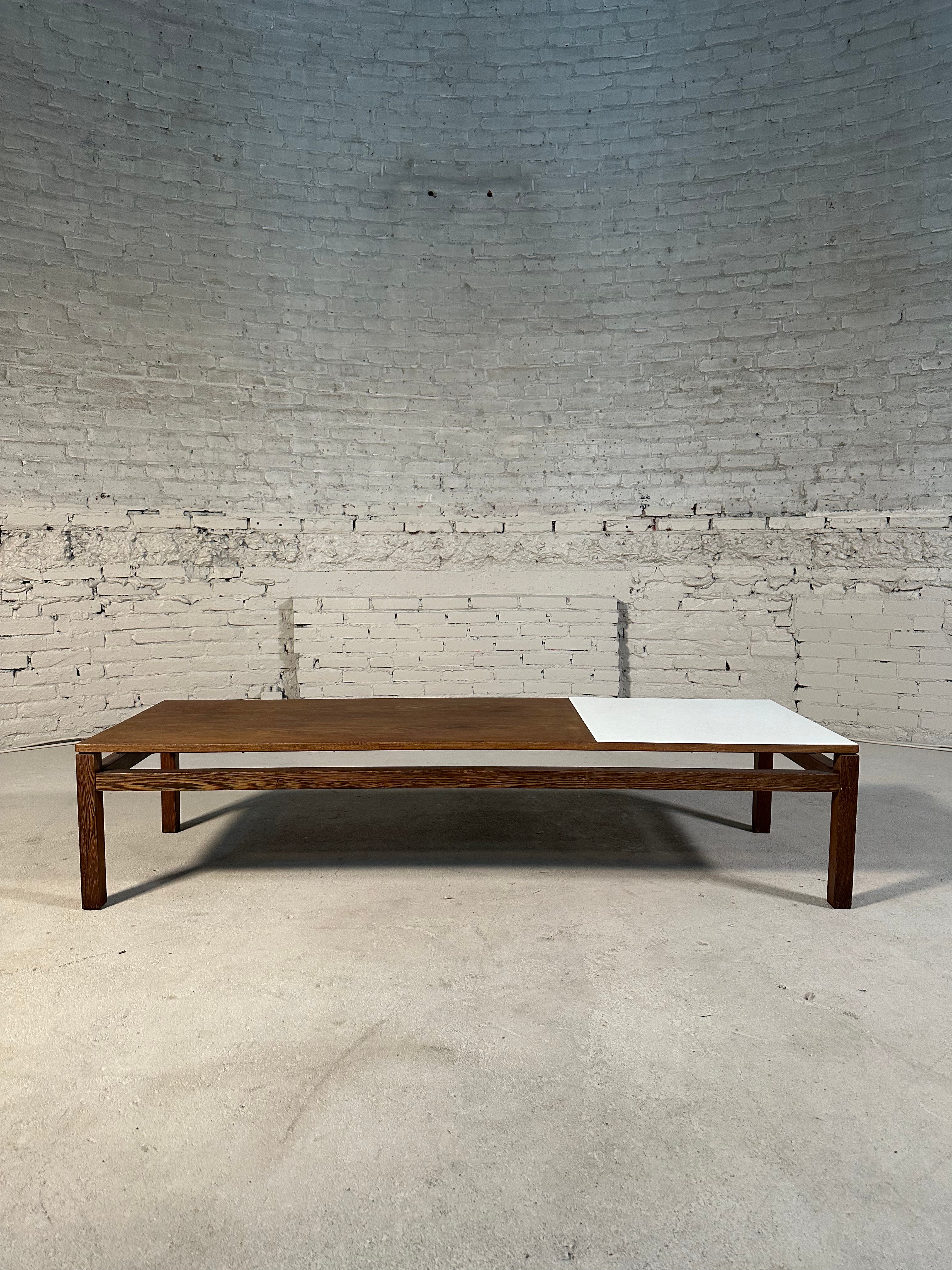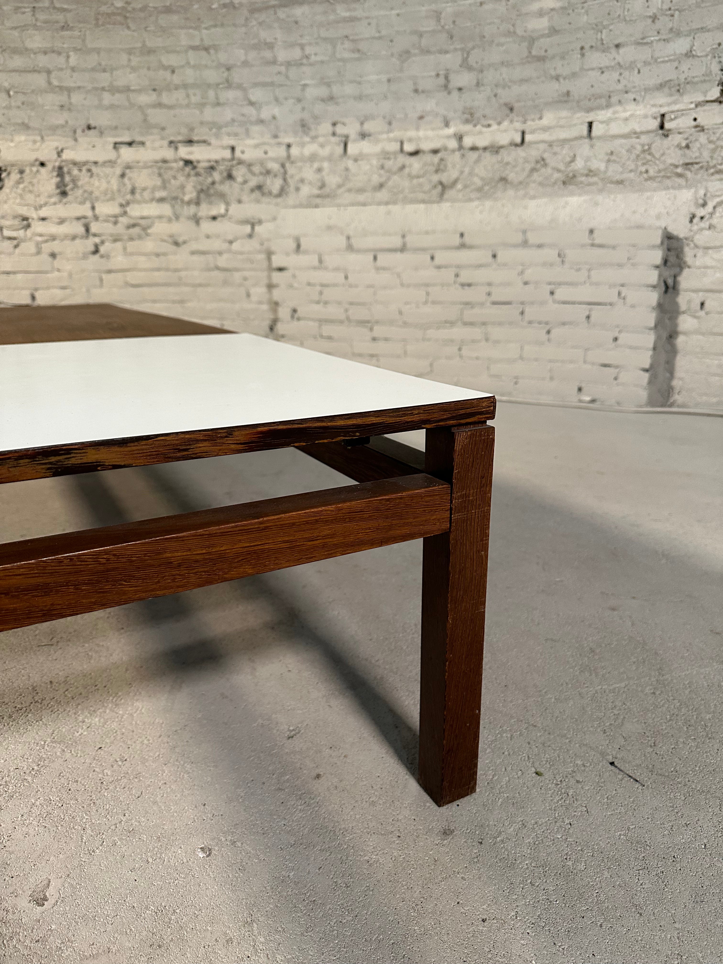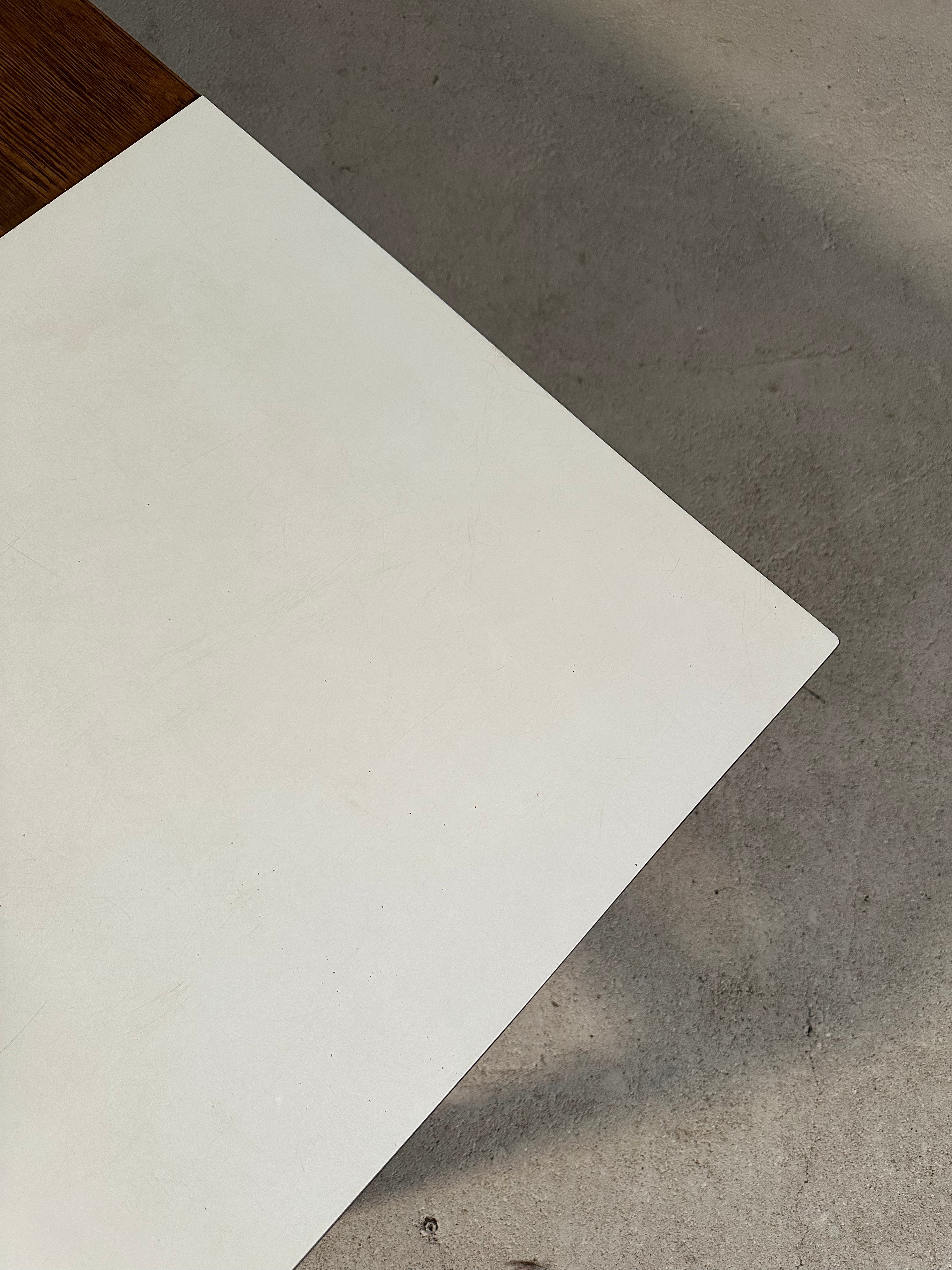 This table is well-constructed in a precise manner, implementing straight lines, resulting in a simplistic furniture piece. Noteworthy detail are the wood joints seen on each corner that refer to the high-level of craftsmanship this coffee table was made with. This coffee table is constructed of wengé wood and white laminate.