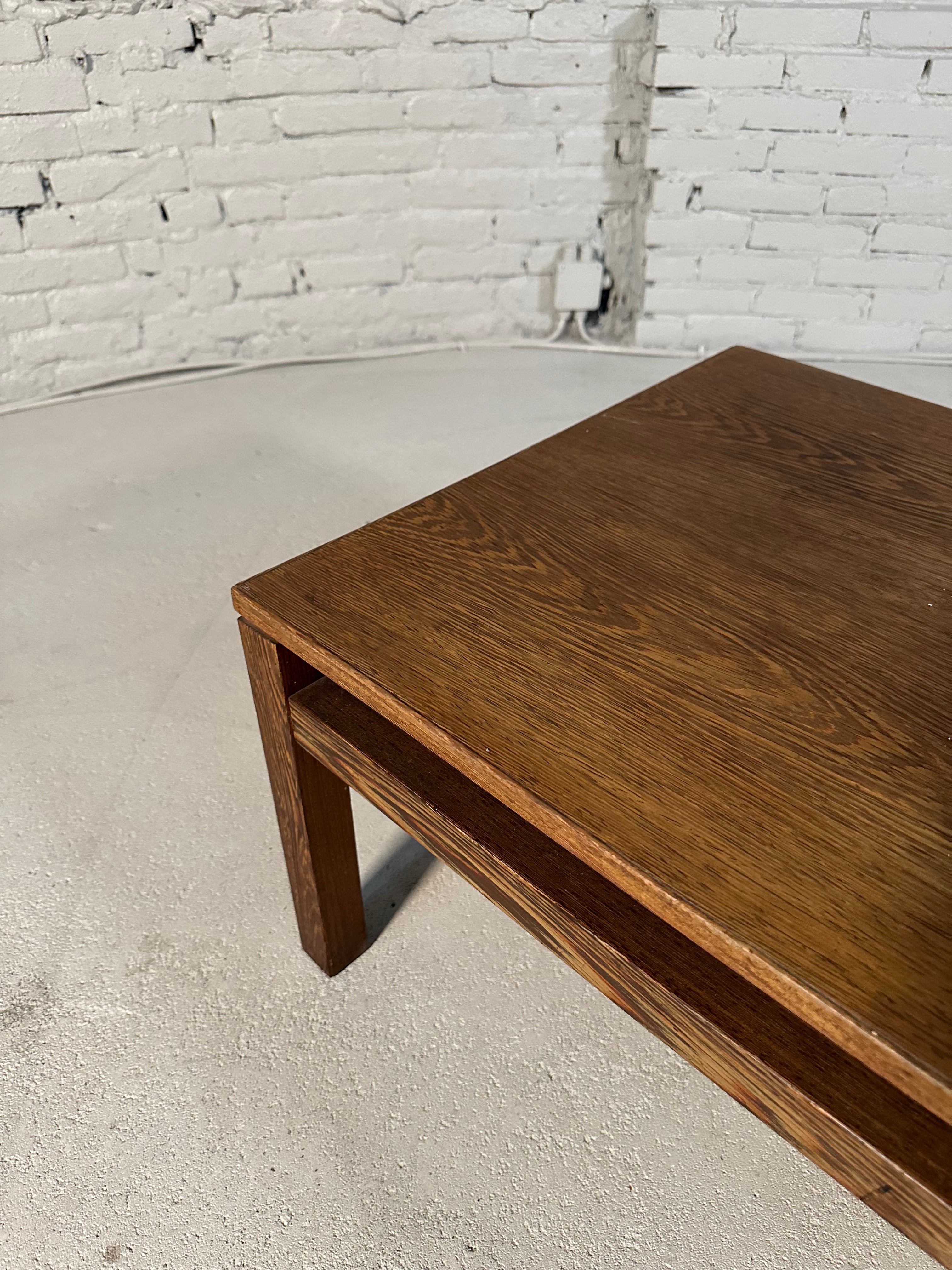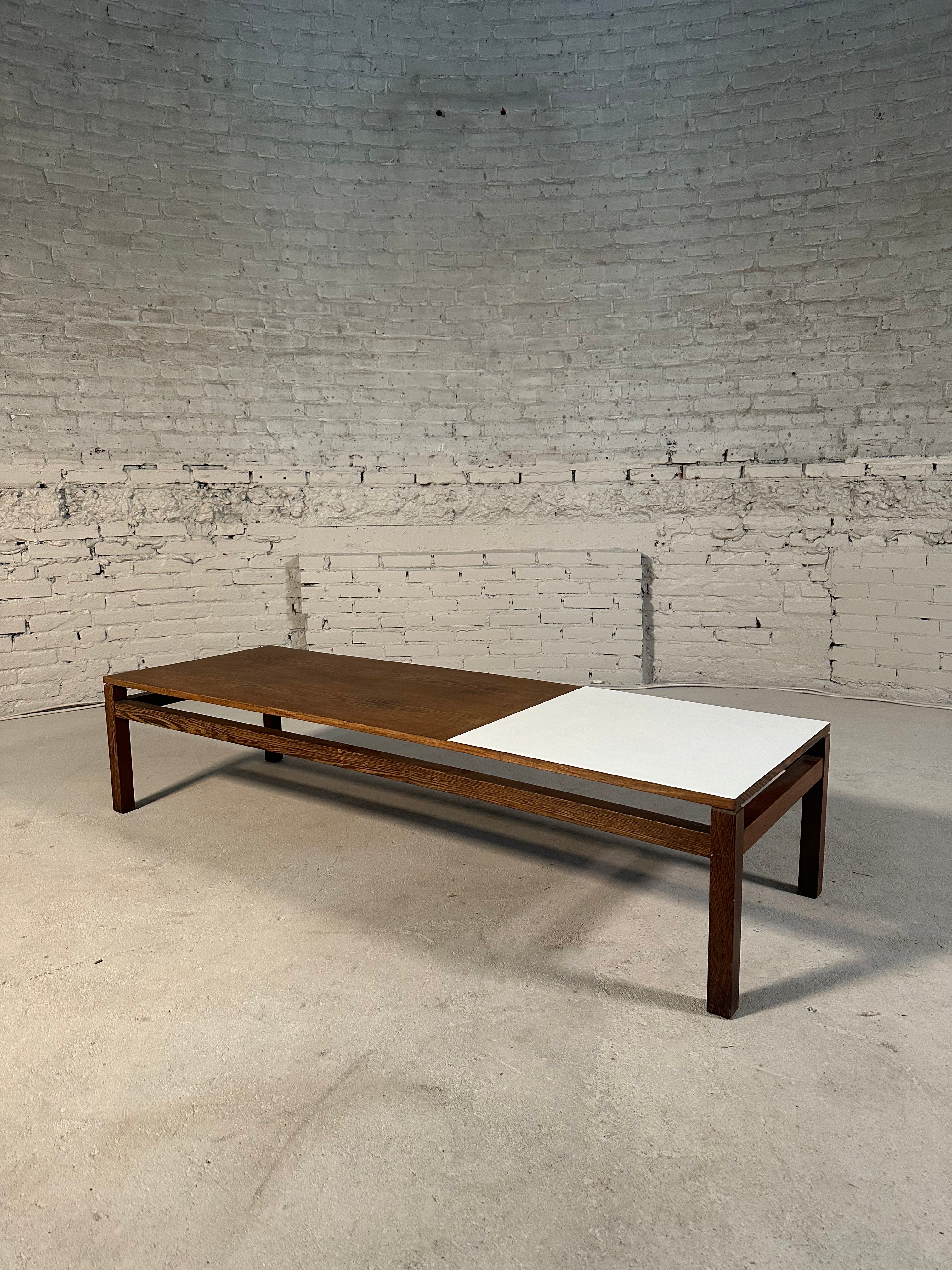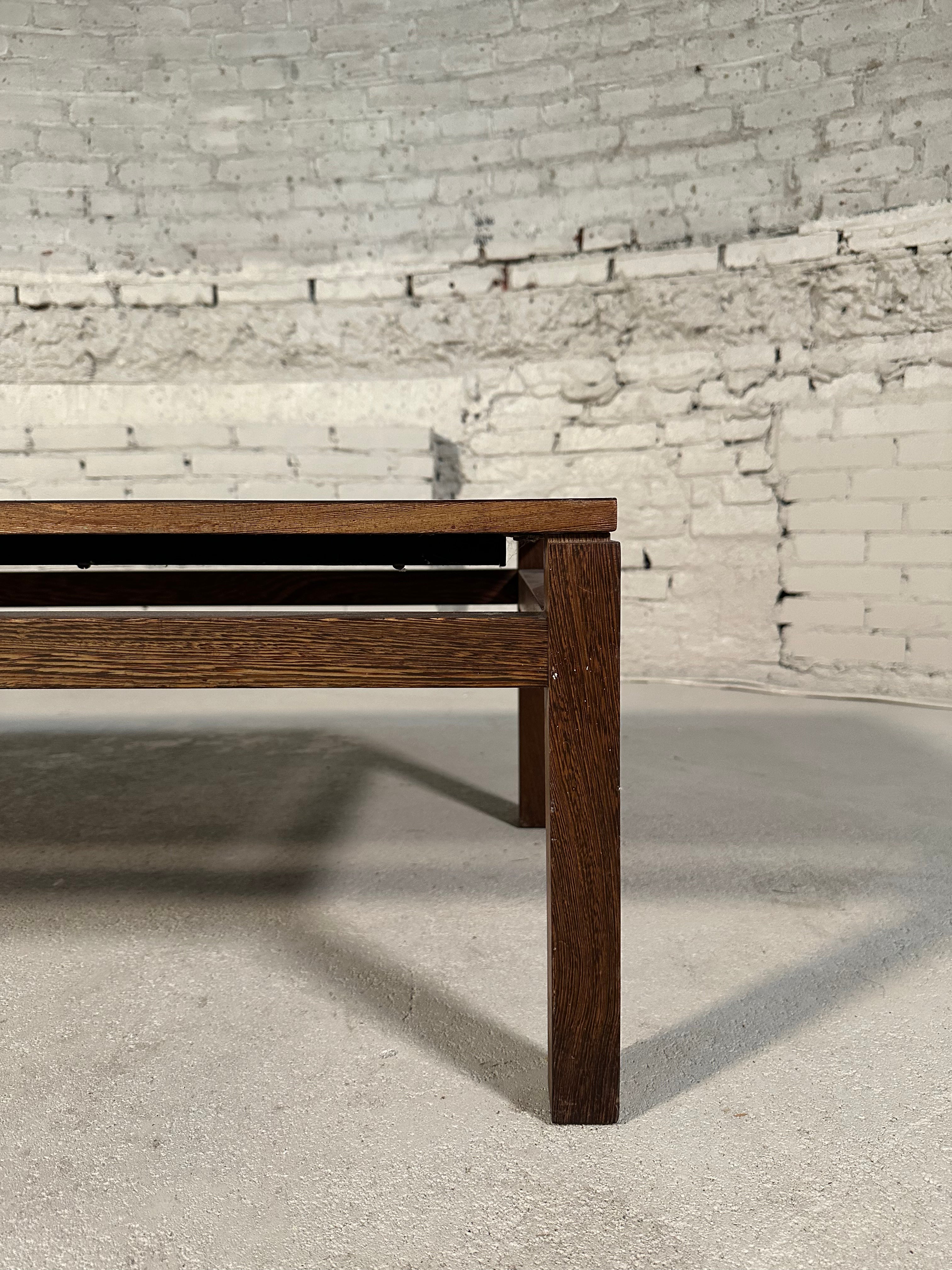 This table is well-constructed in a precise manner, implementing straight lines, resulting in a simplistic furniture piece. Noteworthy detail are the wood joints seen on each corner that refer to the high-level of craftsmanship this coffee table was made with. This coffee table is constructed of wengé wood and white laminate.