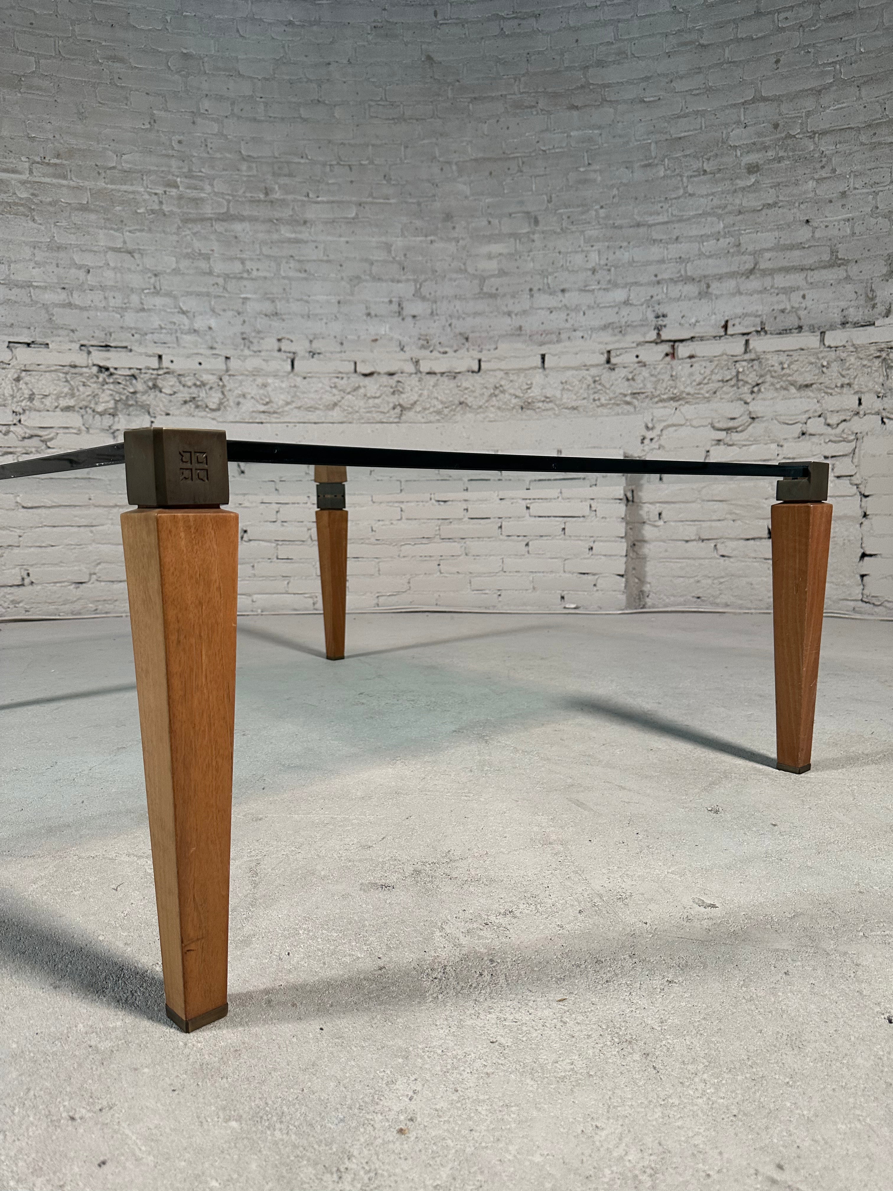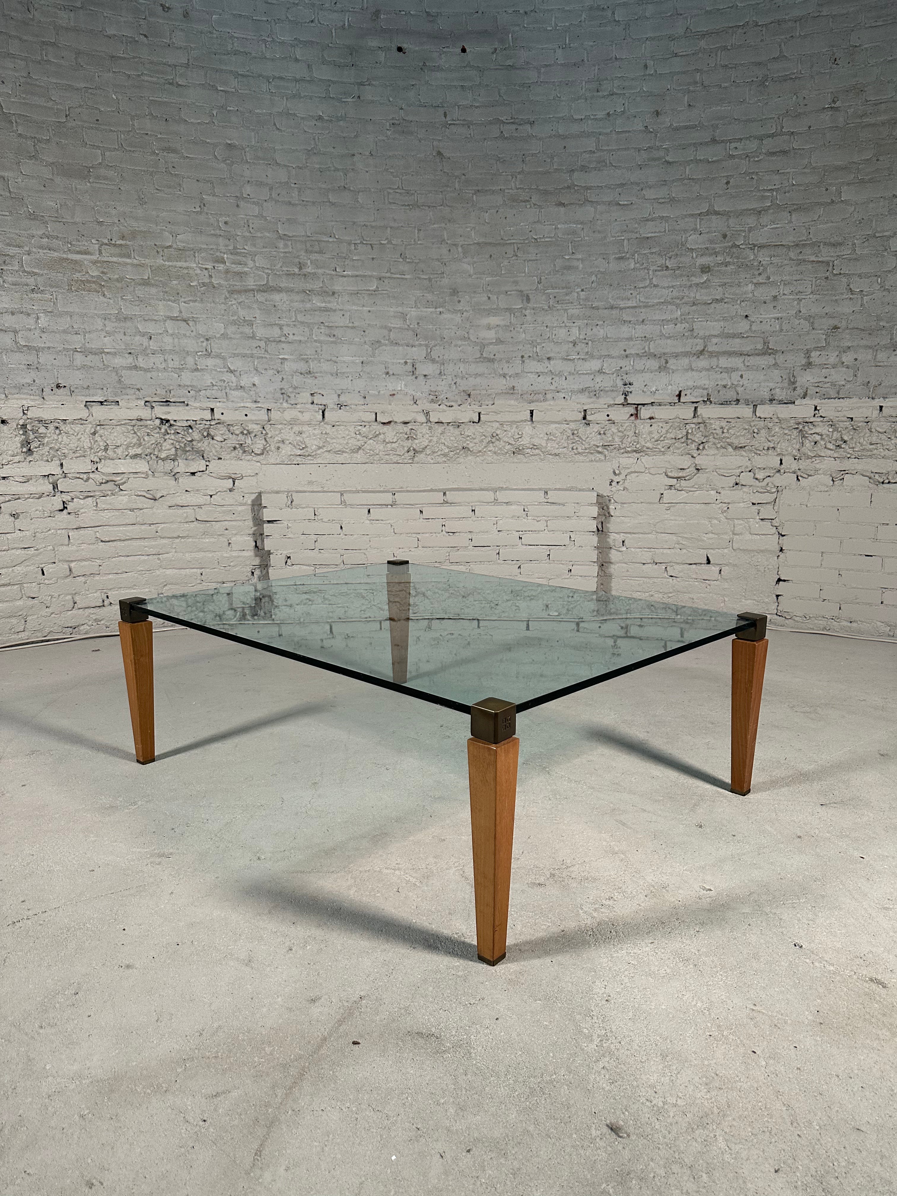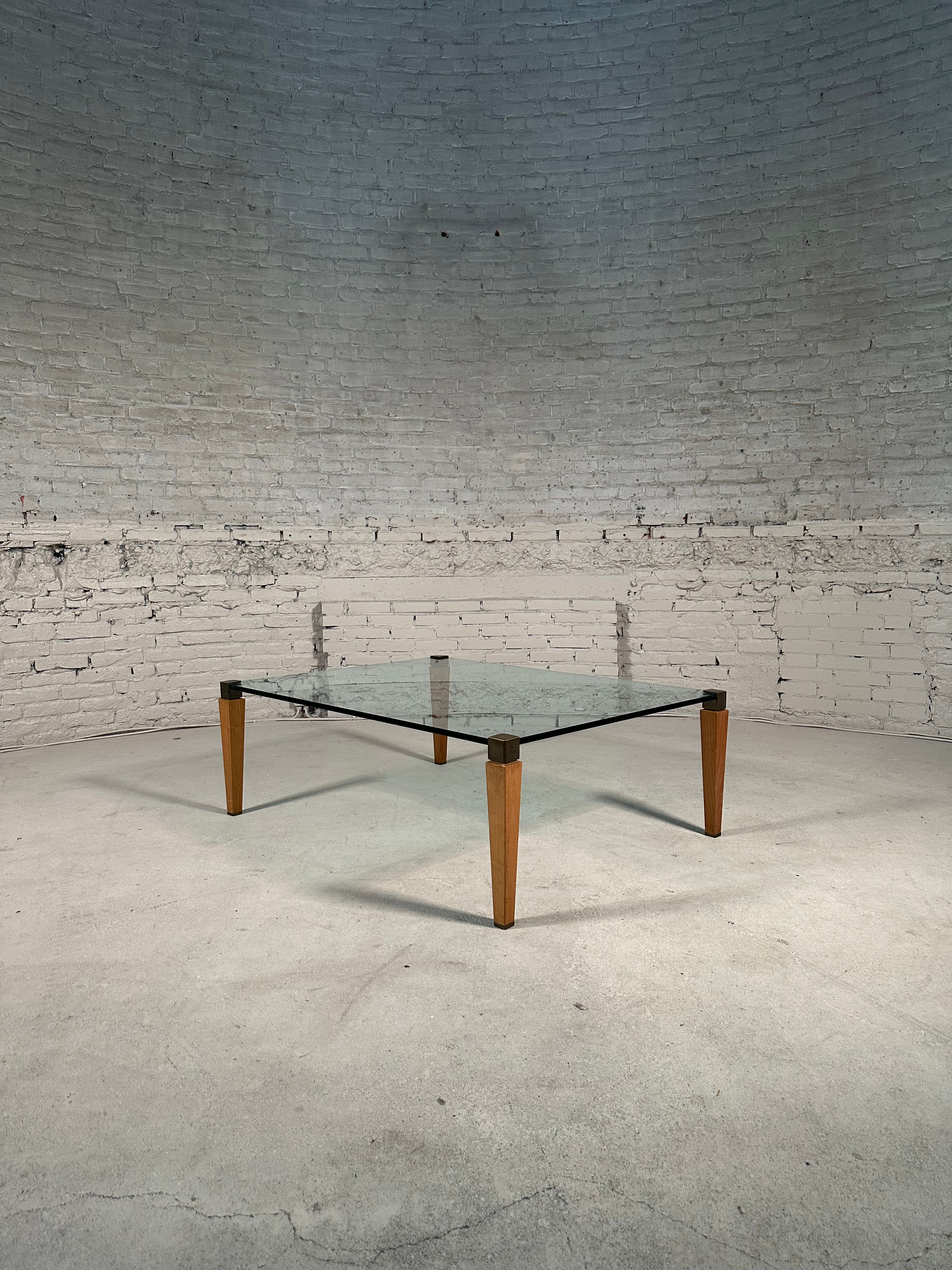 This coffee table is designed by Peter Ghyzcy in the 1970's. It features four wooden legs with brass tops and a square glass plate, creating a luxurious and light appearance. The legs have a rounded finish which showcases the attention to detail in its design. Its clear glass top offers ideal visibility from all angles and remains in great vintage condition, retaining a beautiful patina.
