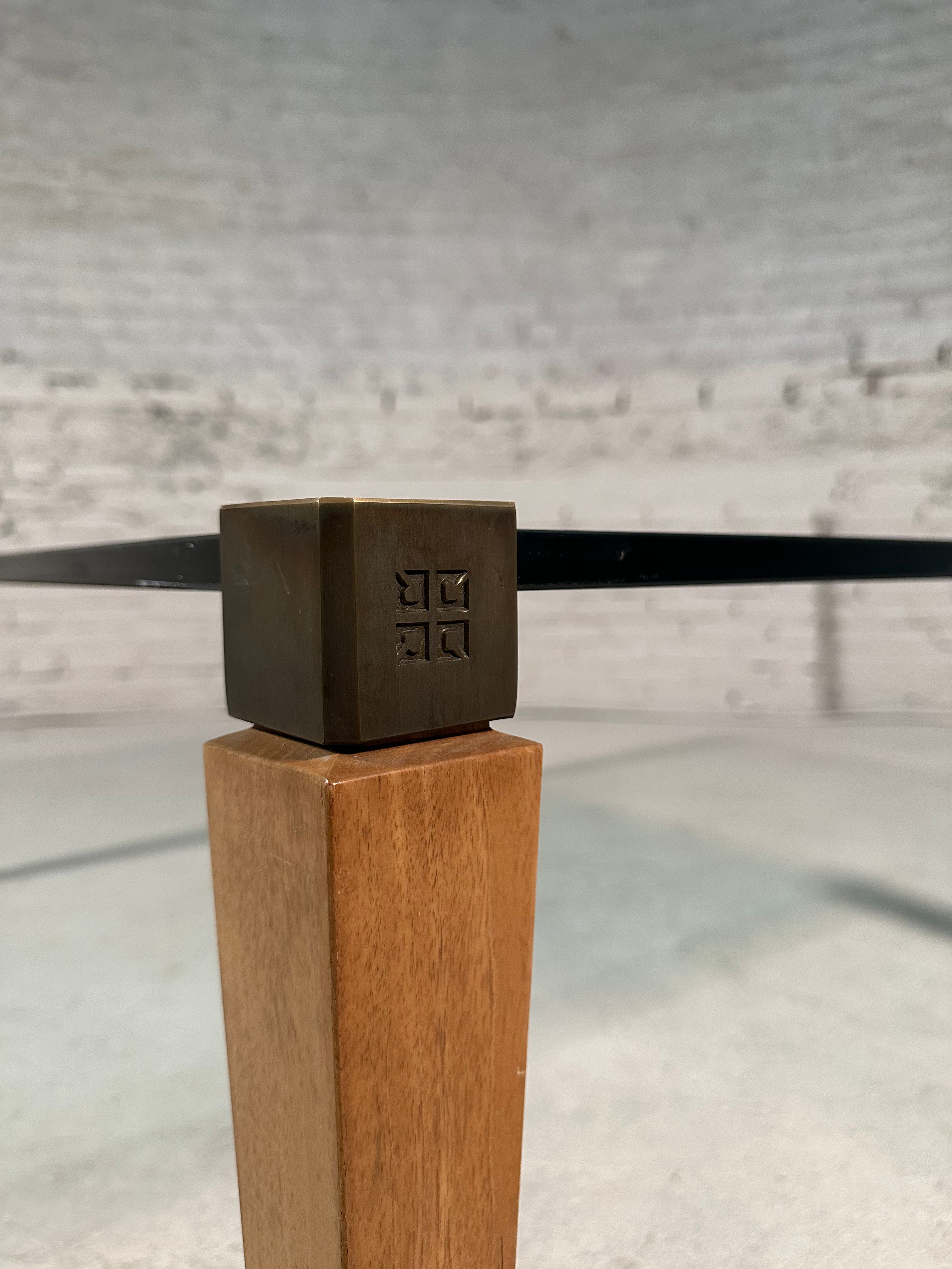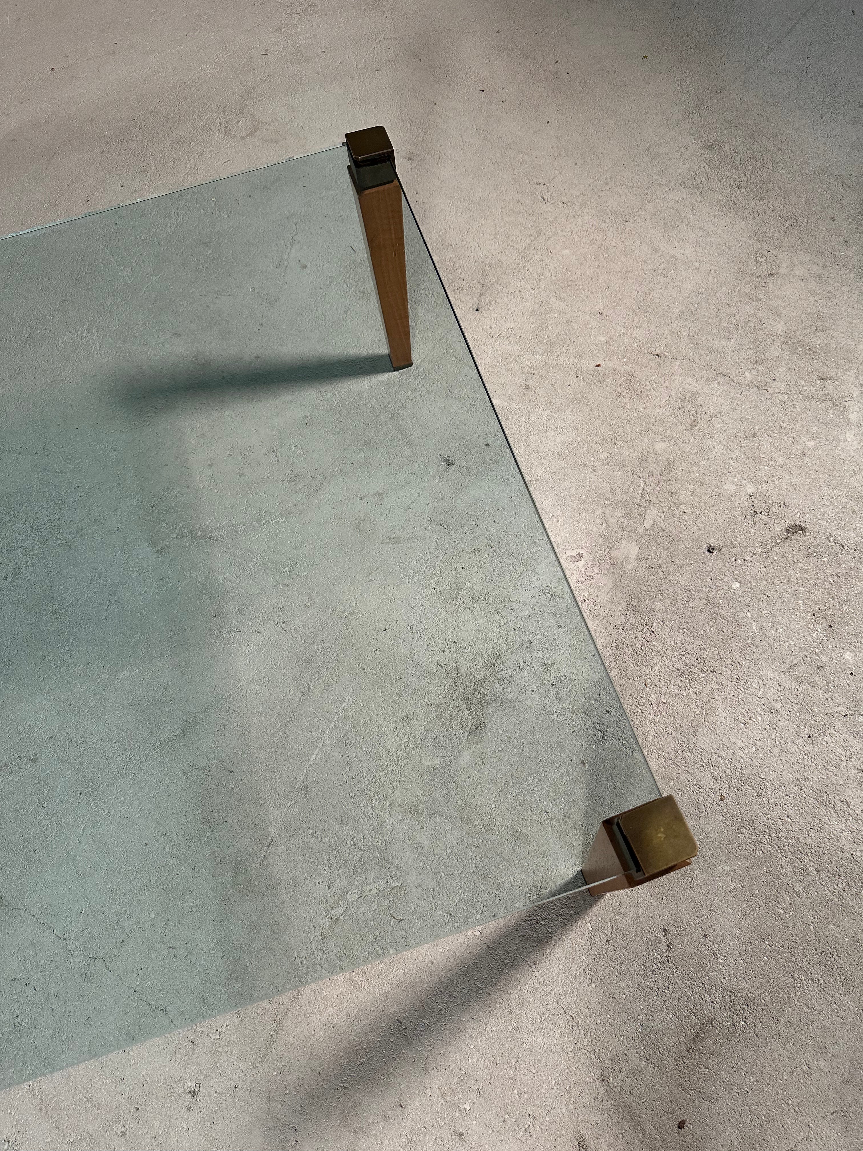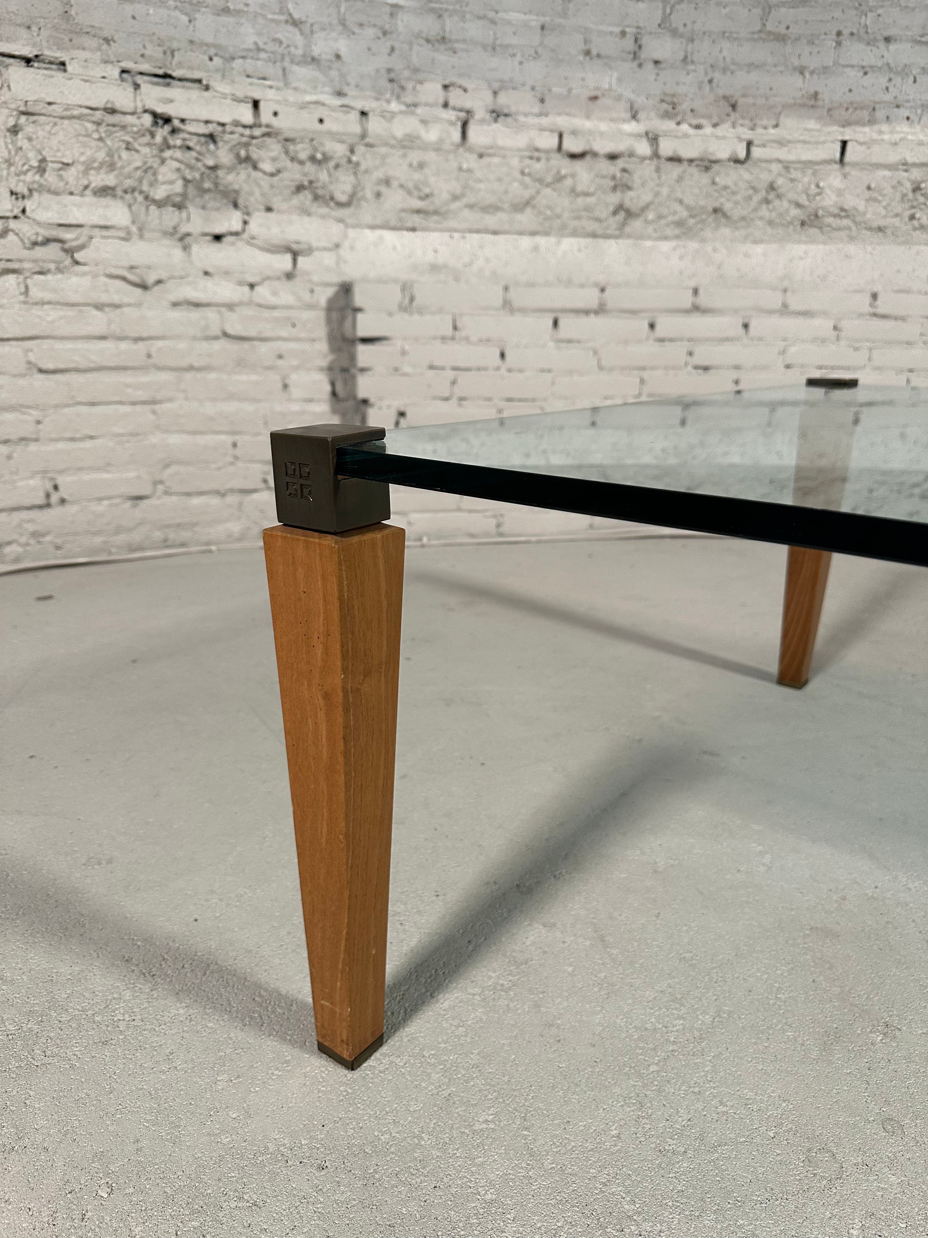 This coffee table is designed by Peter Ghyzcy in the 1970's. It features four wooden legs with brass tops and a square glass plate, creating a luxurious and light appearance. The legs have a rounded finish which showcases the attention to detail in its design. Its clear glass top offers ideal visibility from all angles and remains in great vintage condition, retaining a beautiful patina.