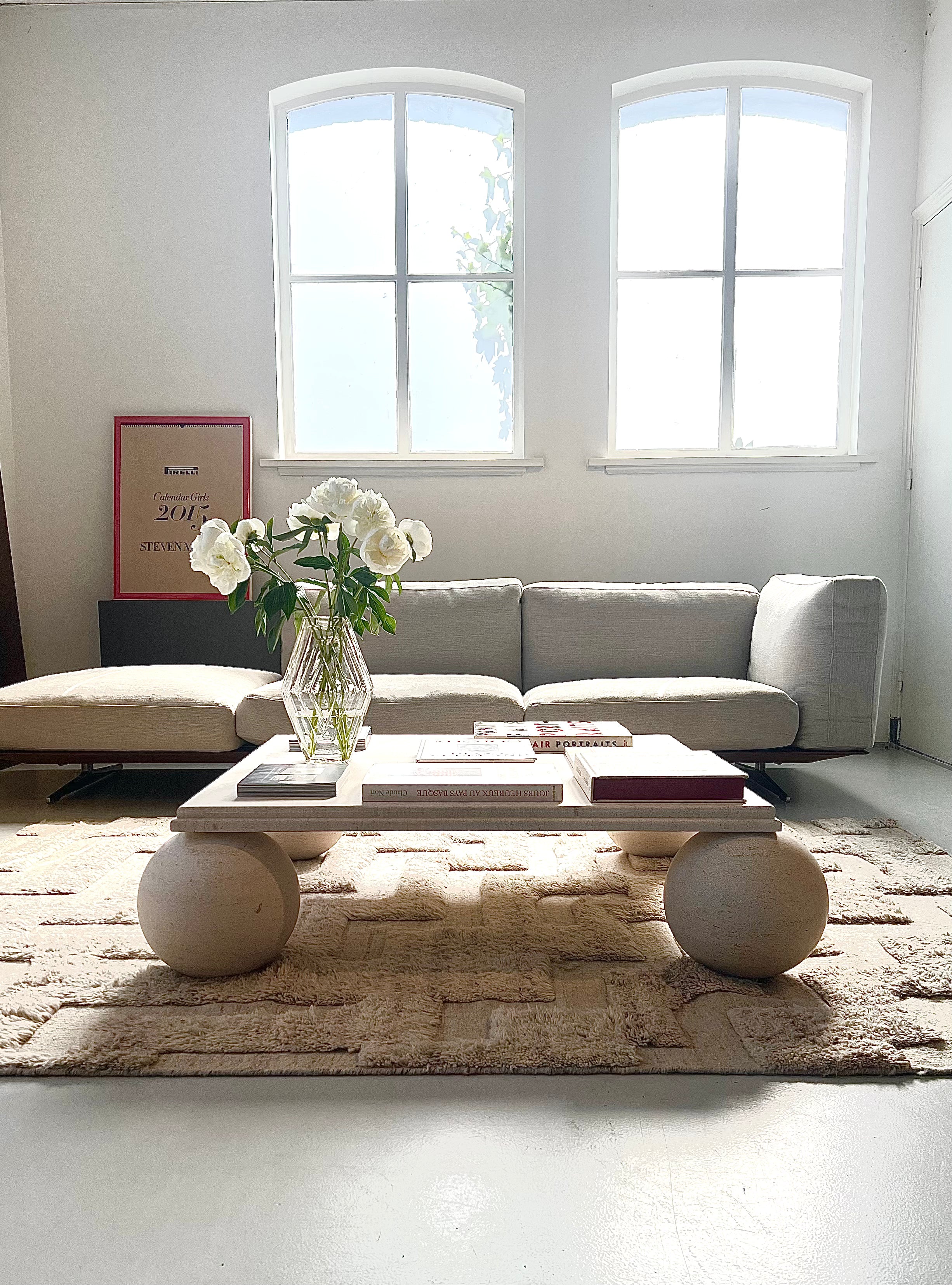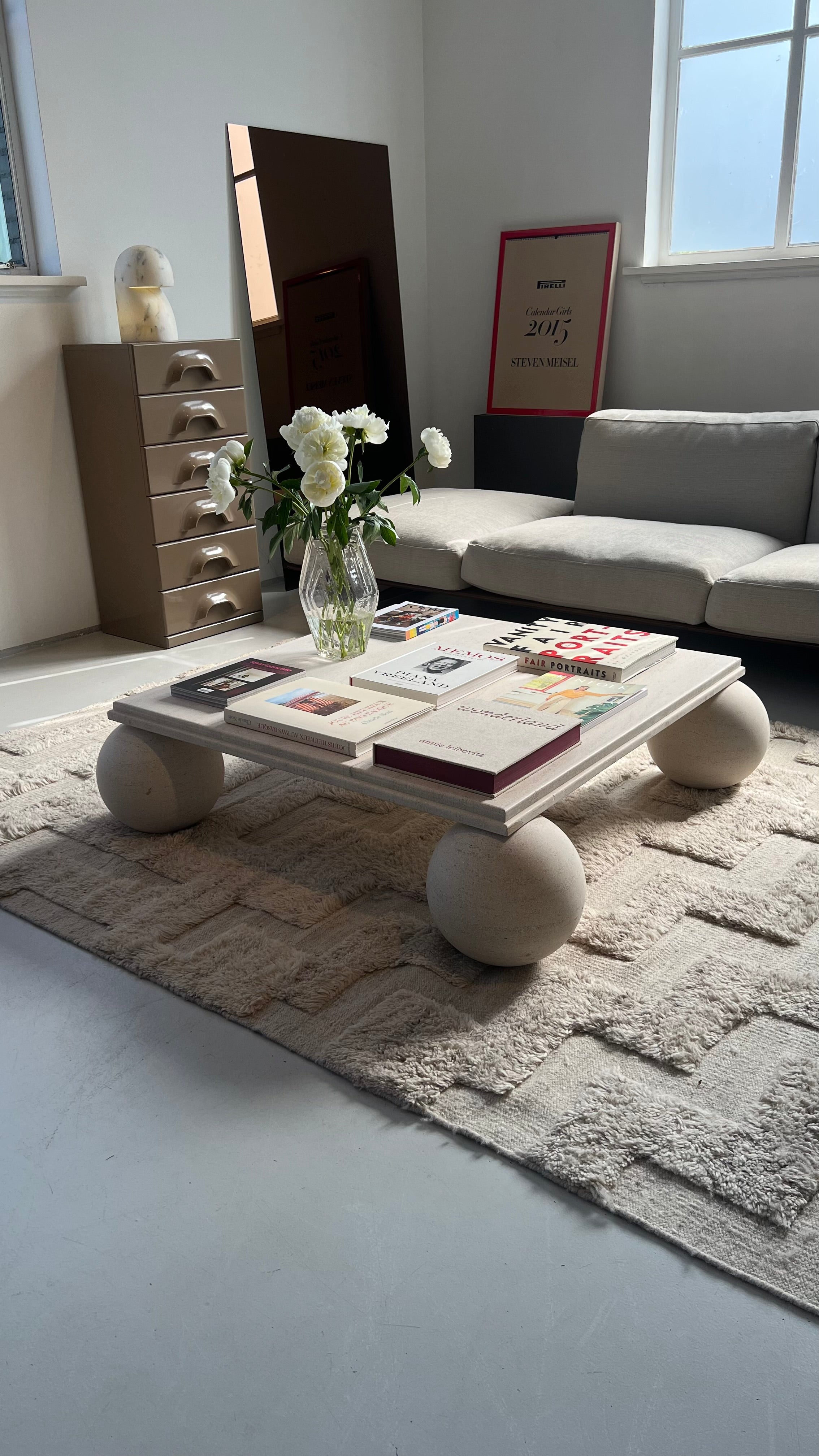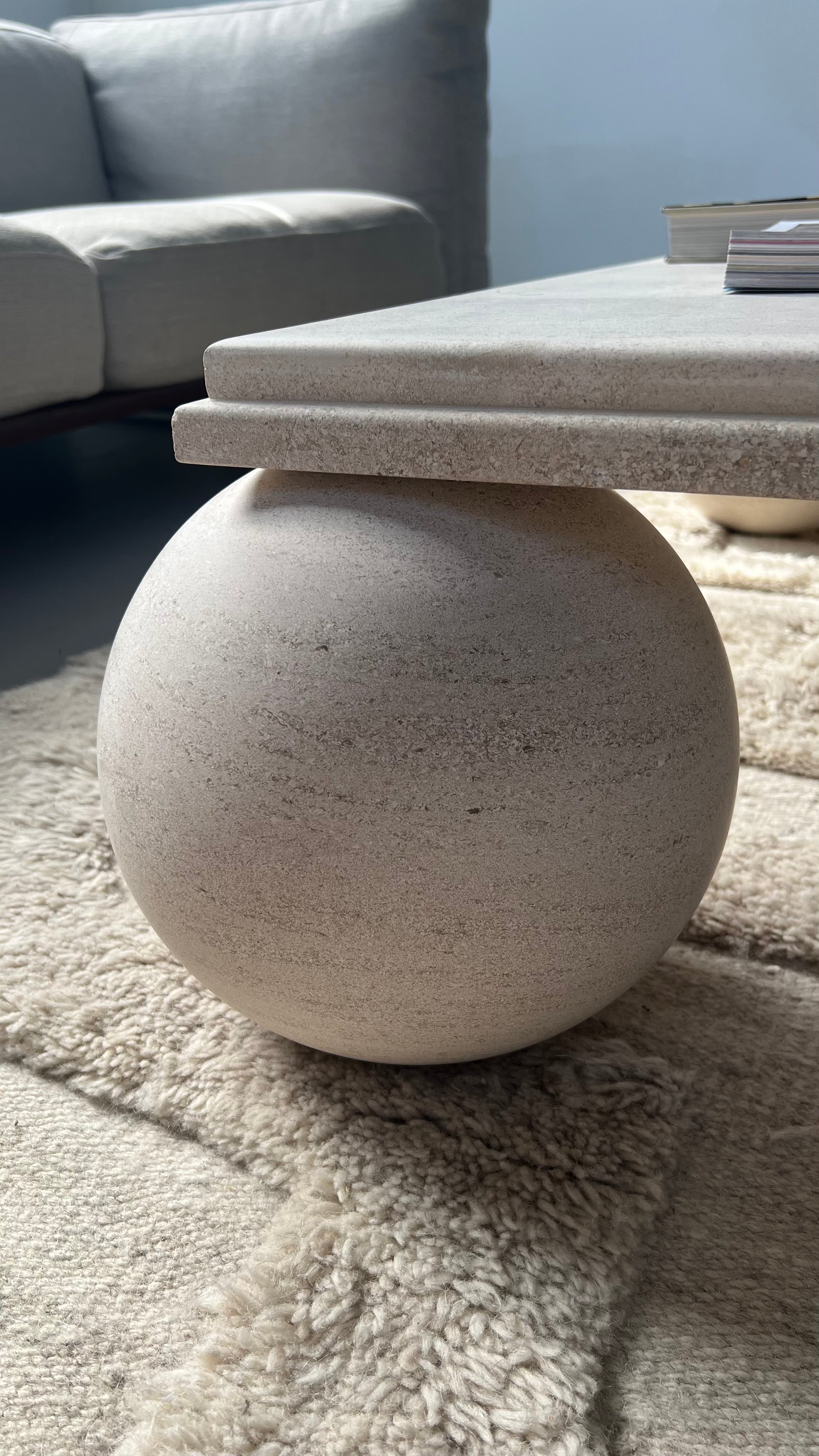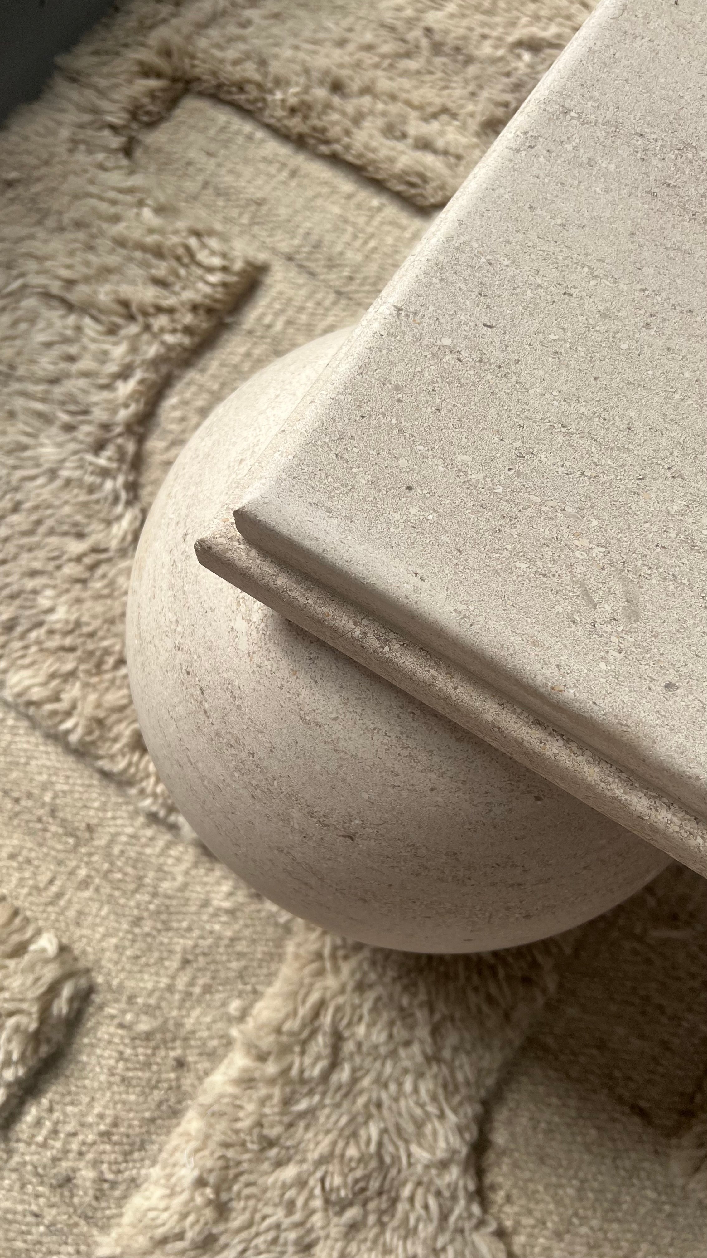 This square coffee table is made from one piece of sandstone. Featuring a square top in beige with light-grey veining that elegantly swirls around the table. Drawing inspiration from the roman time the oversized legball’s give this piece an eclectic look.