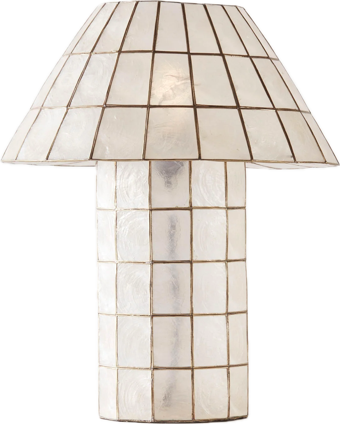 The Cornelia Table Lamp is crafted from capiz shells, resulting in a distinctive and irregular appearance. This gives each lamp its own unique character and adds personality to any space. The versatile design allows it to seamlessly fit into both modern and classic settings, making it perfect for use as a decorative element on a bookshelf or as a bedside lamp.