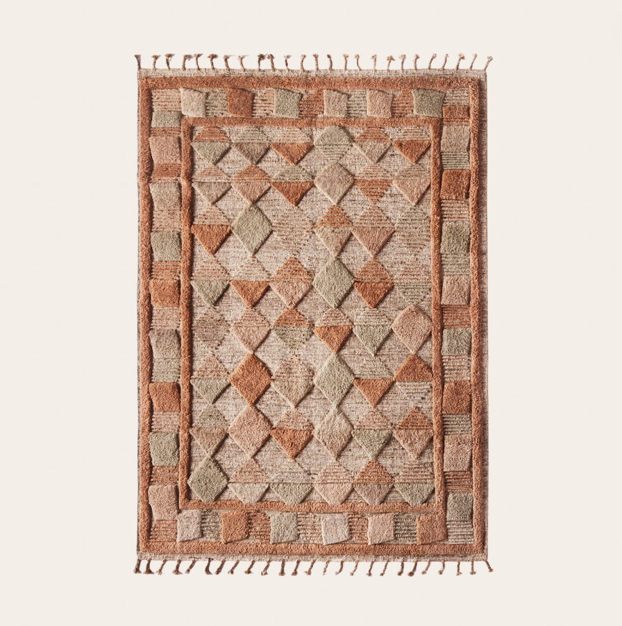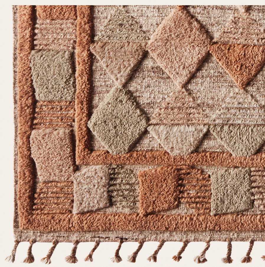 Introducing the Lisboa Multi rug in Amber. Hand-woven with 100% wool, this rug showcases a unique pattern inspired by a floor in Lisboa. The contrasting colors and textures make it a standout piece in any space. Available in two sized. Elevate your decor with Dusty Deco's signature patterned rug.