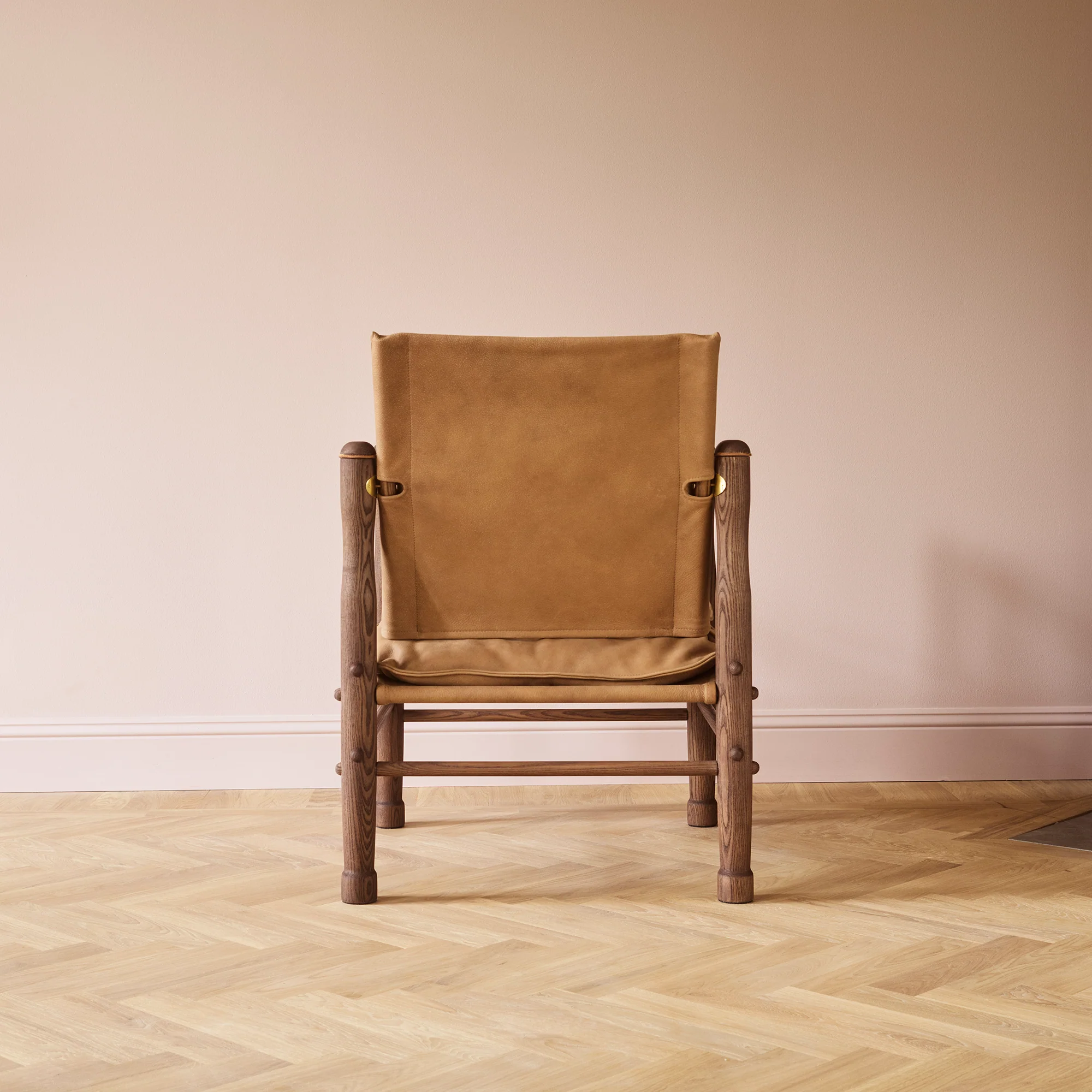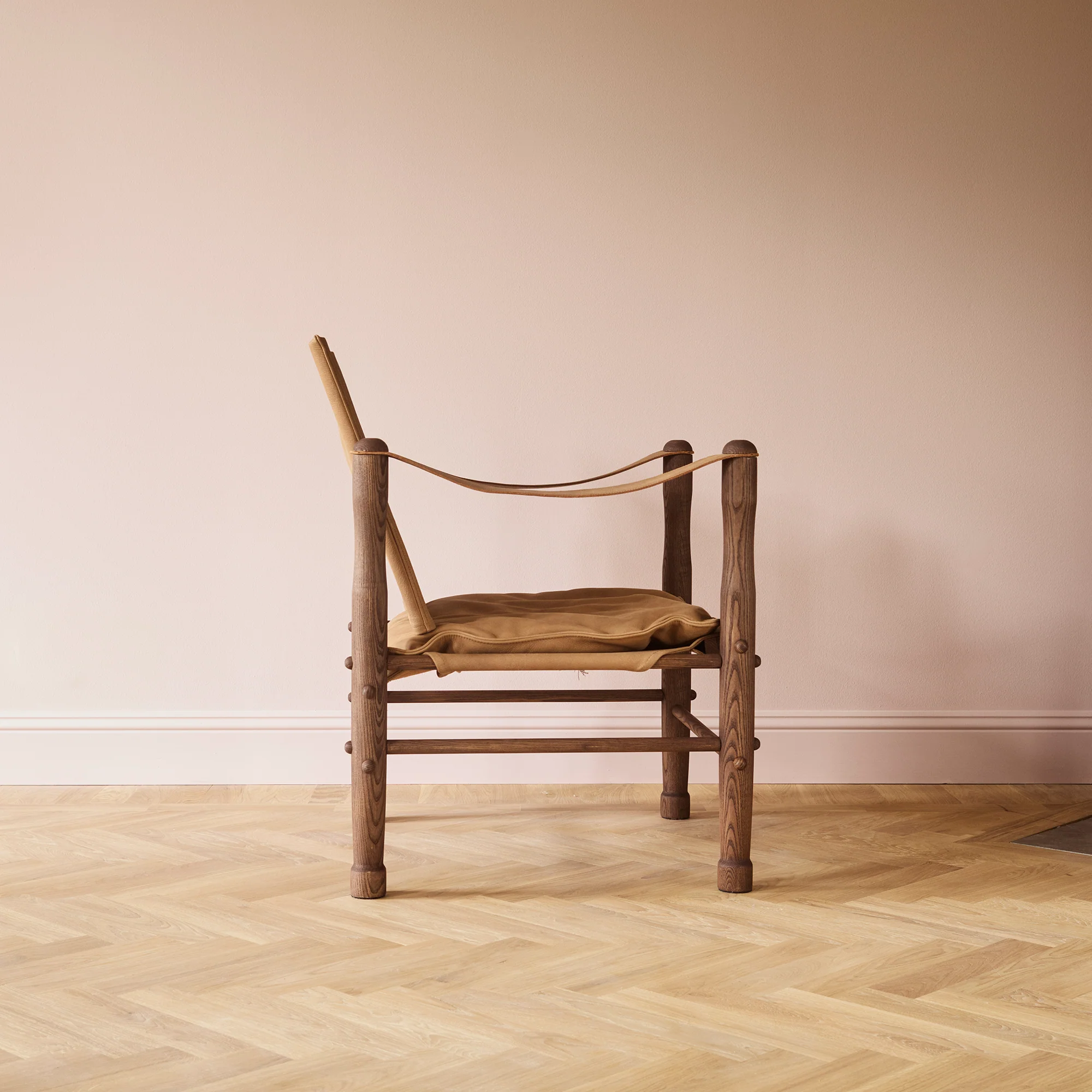 The Safari Chair by Dustydeco, a classic design originally by Elias Svedberg, is reintroduced blending timeless design with modern functionality. This relaunch features two exquisite versions, a stained ash frame enhanced with cognac leather and a version in glossy black with black leather.