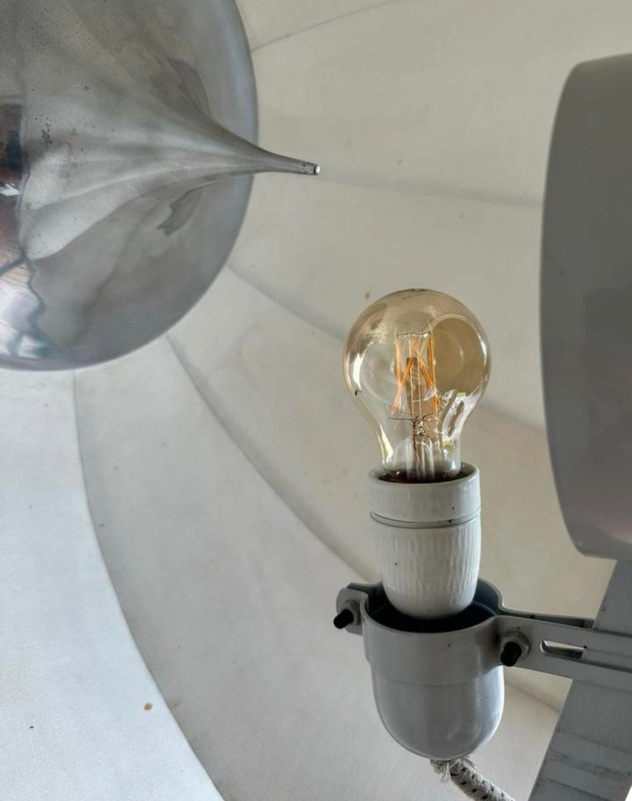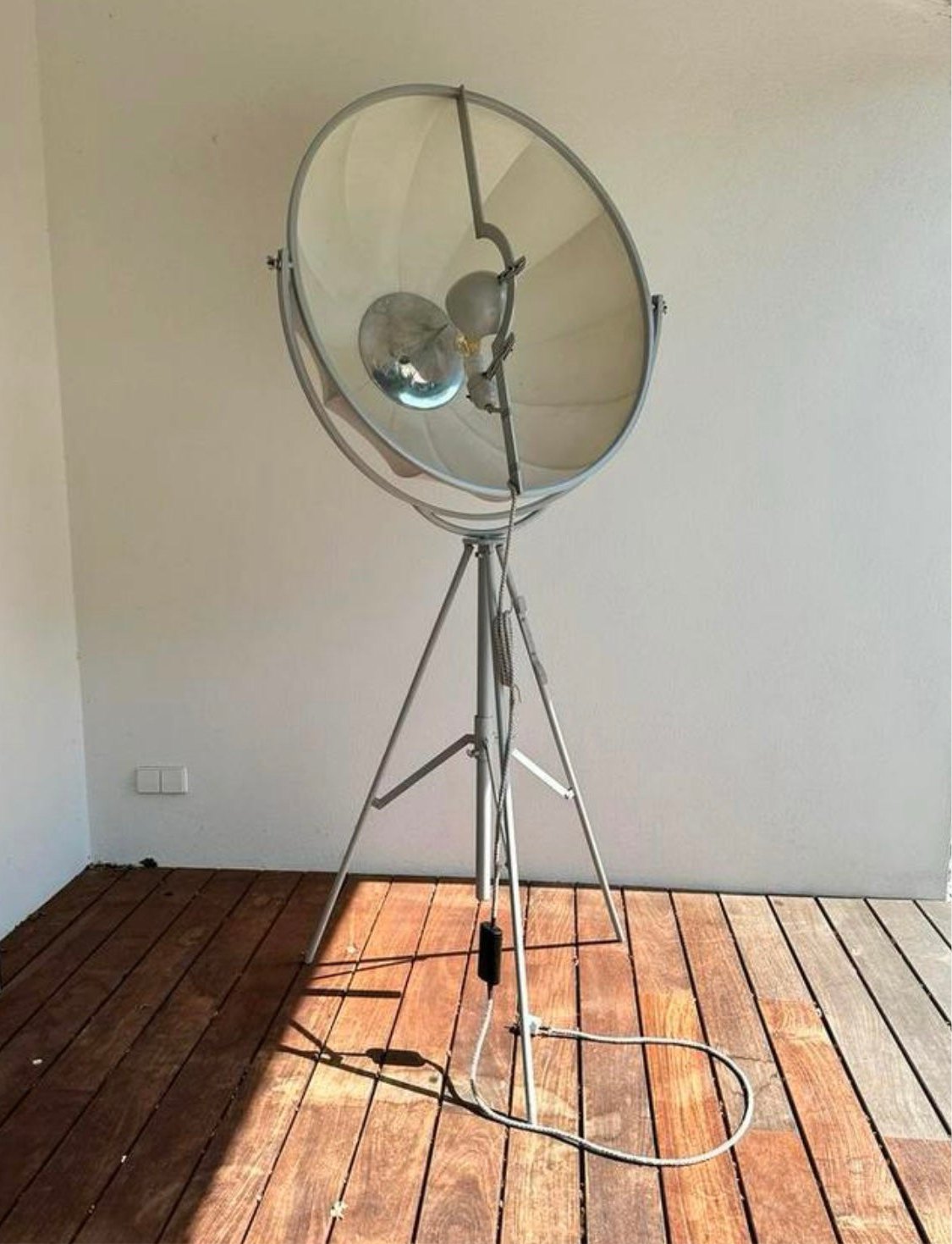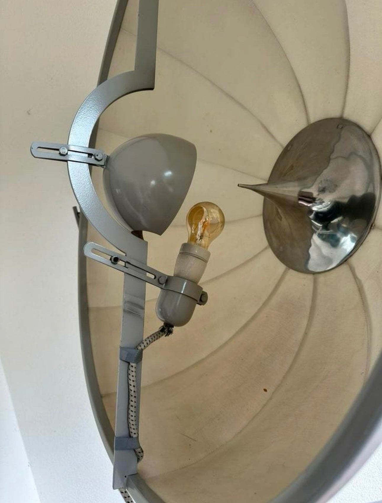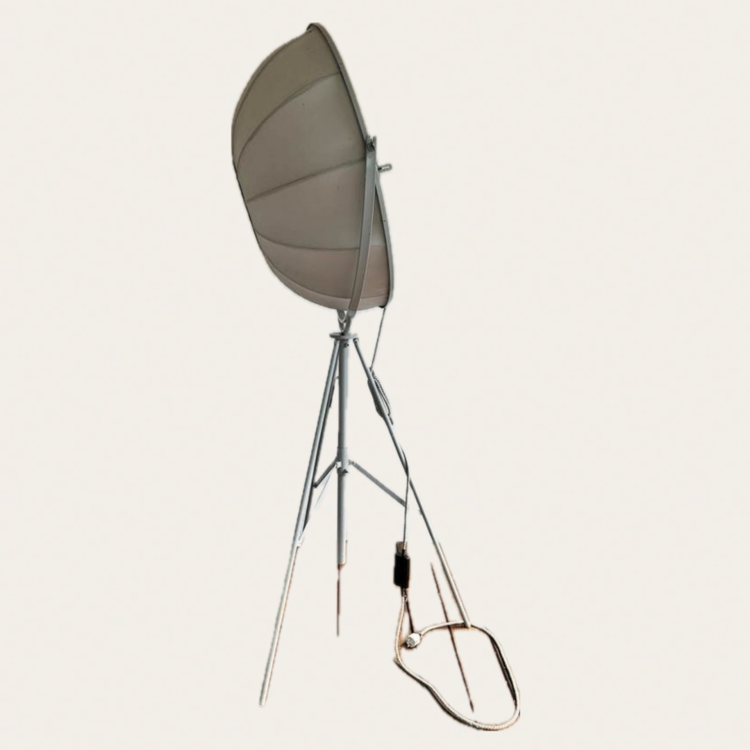 Designed by Mariano Fortuny in 1907 and produced by Pallucco, this 70's Fortuny lamp is a true design icon. Inspired by theater and studio lighting, it features a large adjustable shade on an elegant steel tripod.