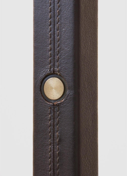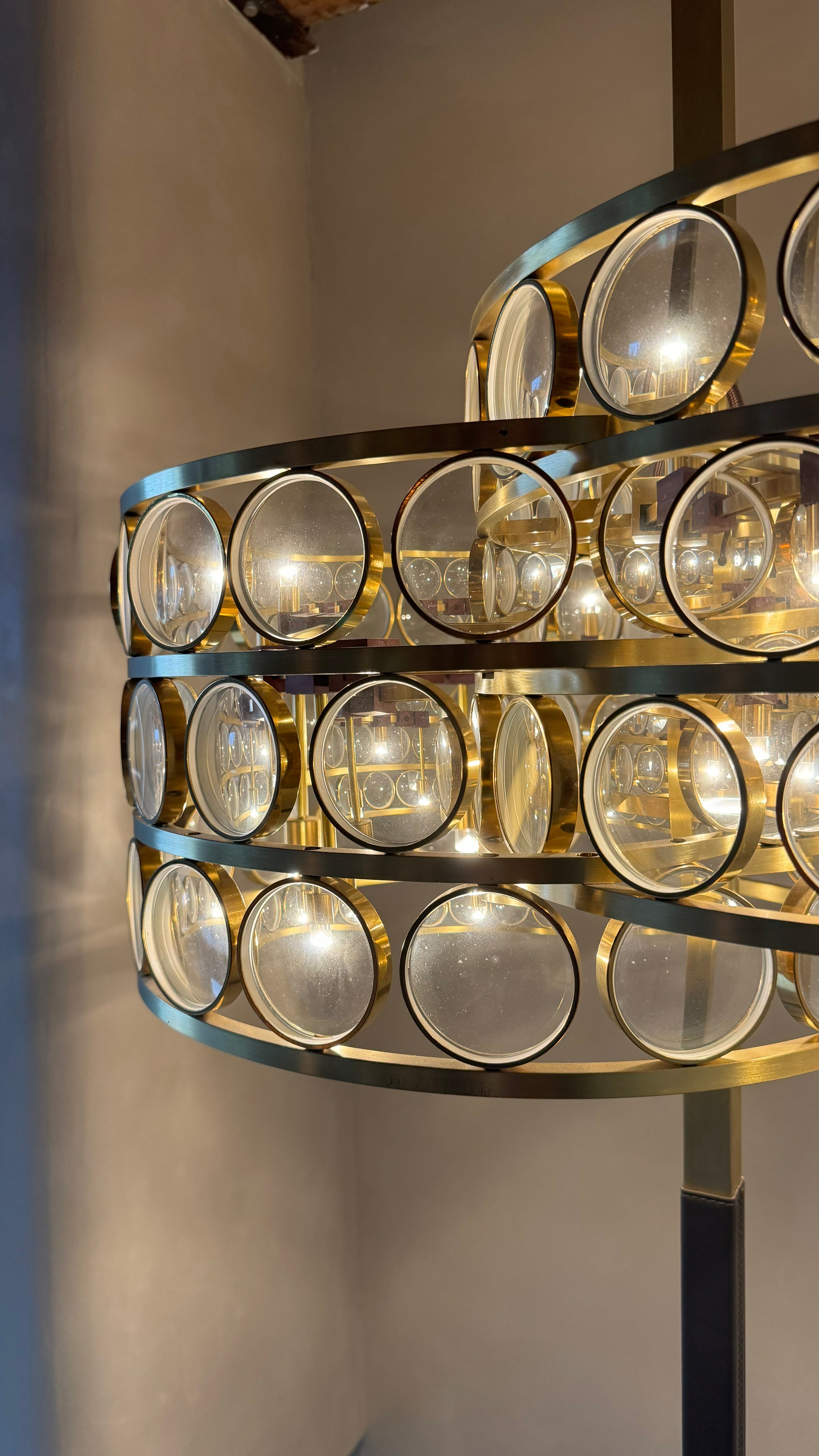 Architectural designed standing lamp by high-end Italian design house Viabizzuno. This beauty is made of natural brass calendered profiles of different sizes with a section of 10x10mm and a cylindrical shape, separated by diameter Ø80mm brass rings with biconcave lenses. The pilar with brass dim button is covered with brown leather.