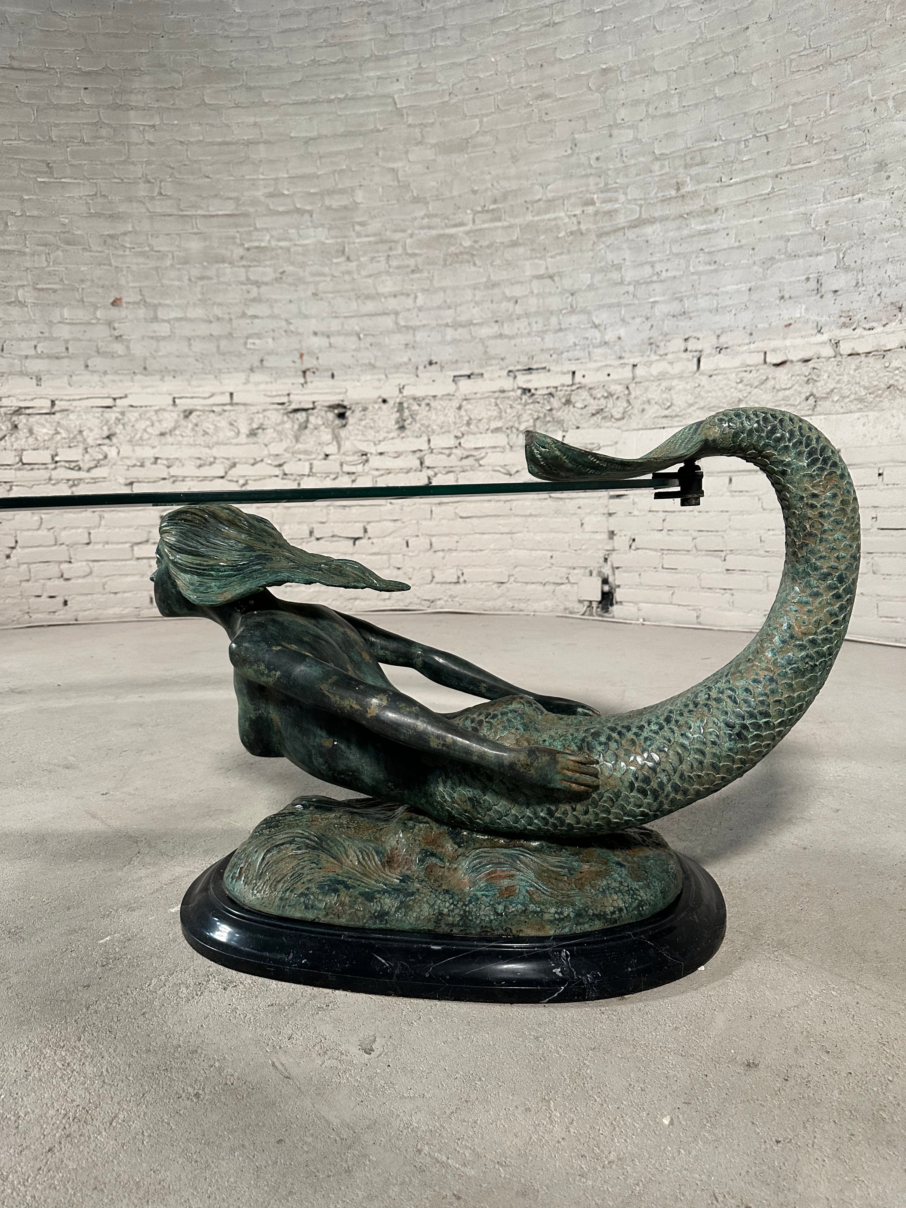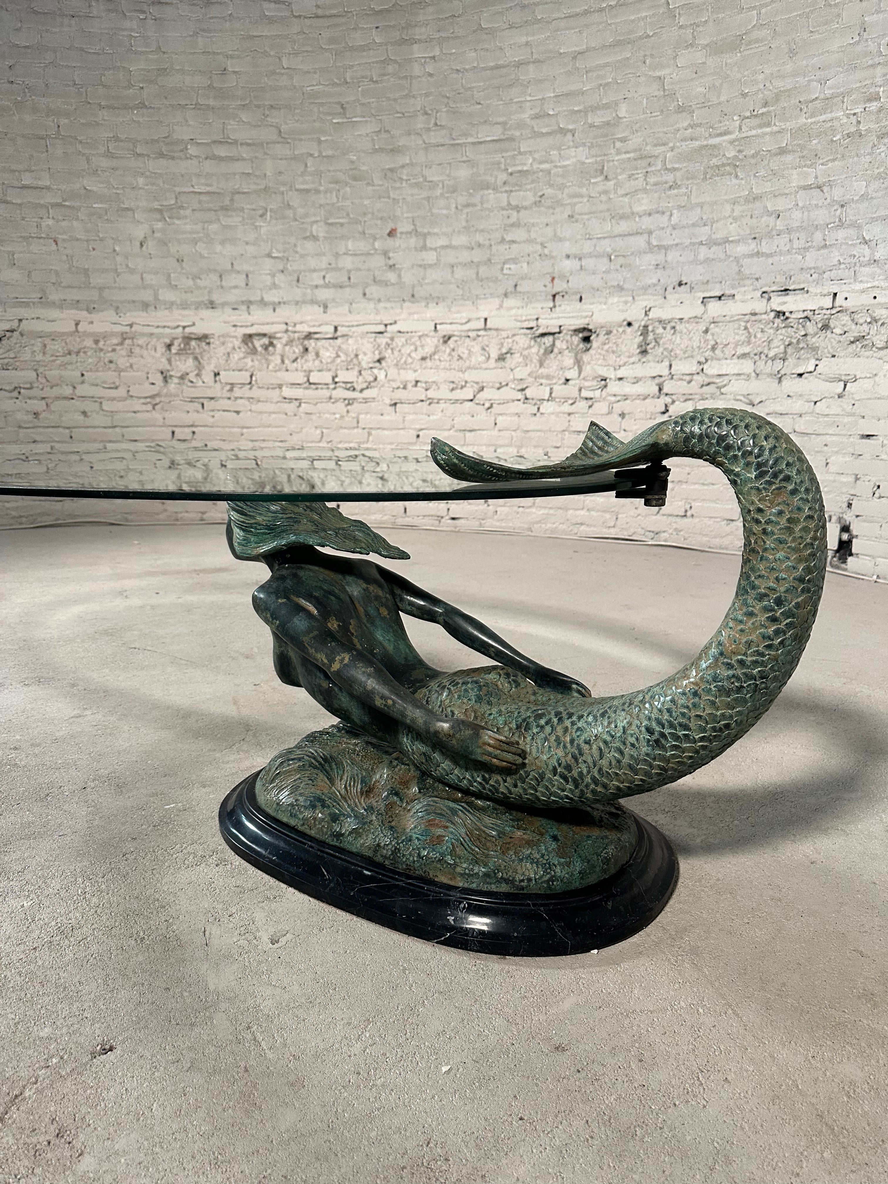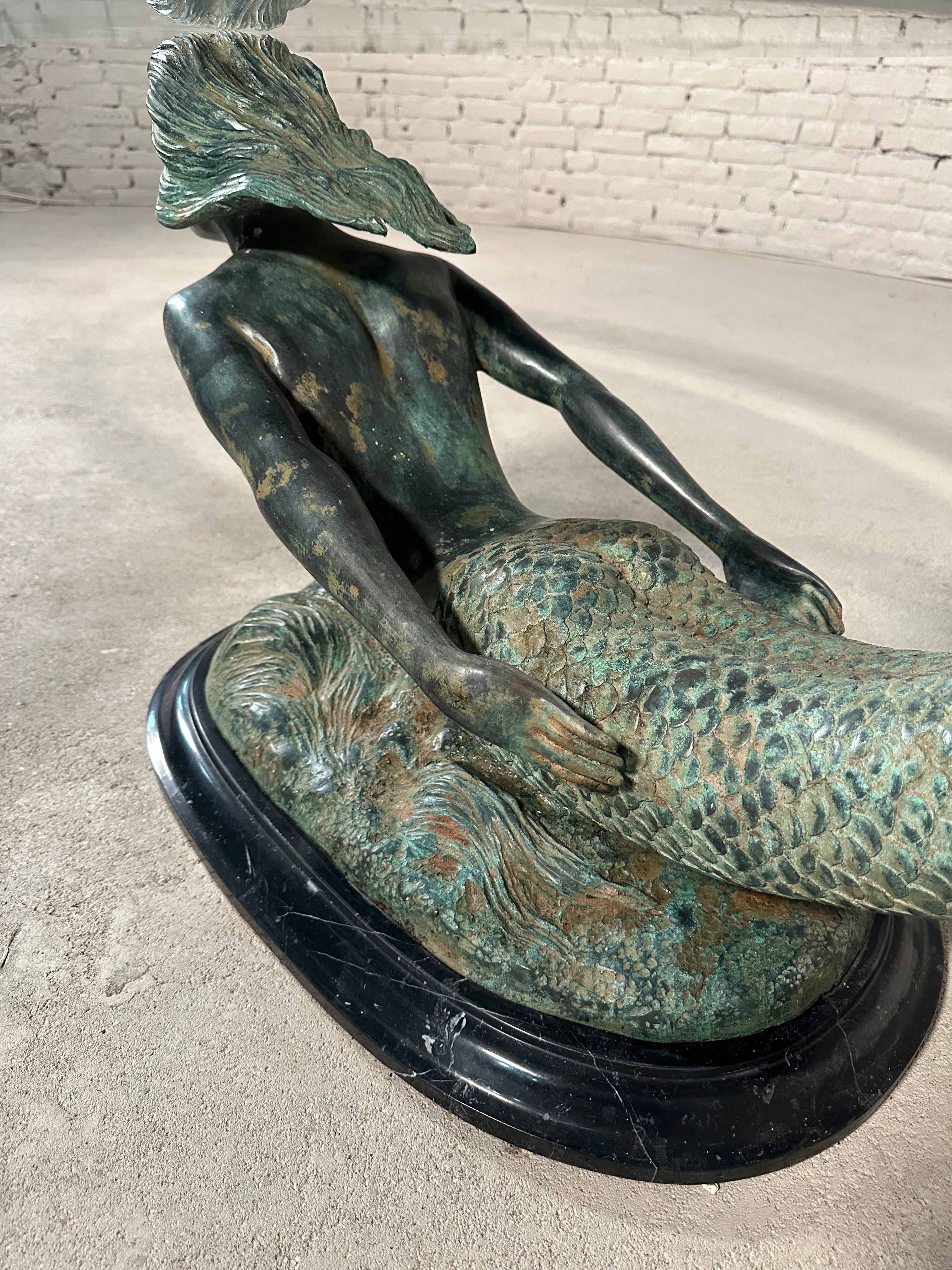 This elegant coffee table features a faceted glass plate resting upon a sturdy mermaid bronze chassis with a stunning green patina. A massive marble plateau serves as the base for the mermaid sculpture. The glass and bronze components can be easily separated if desired.