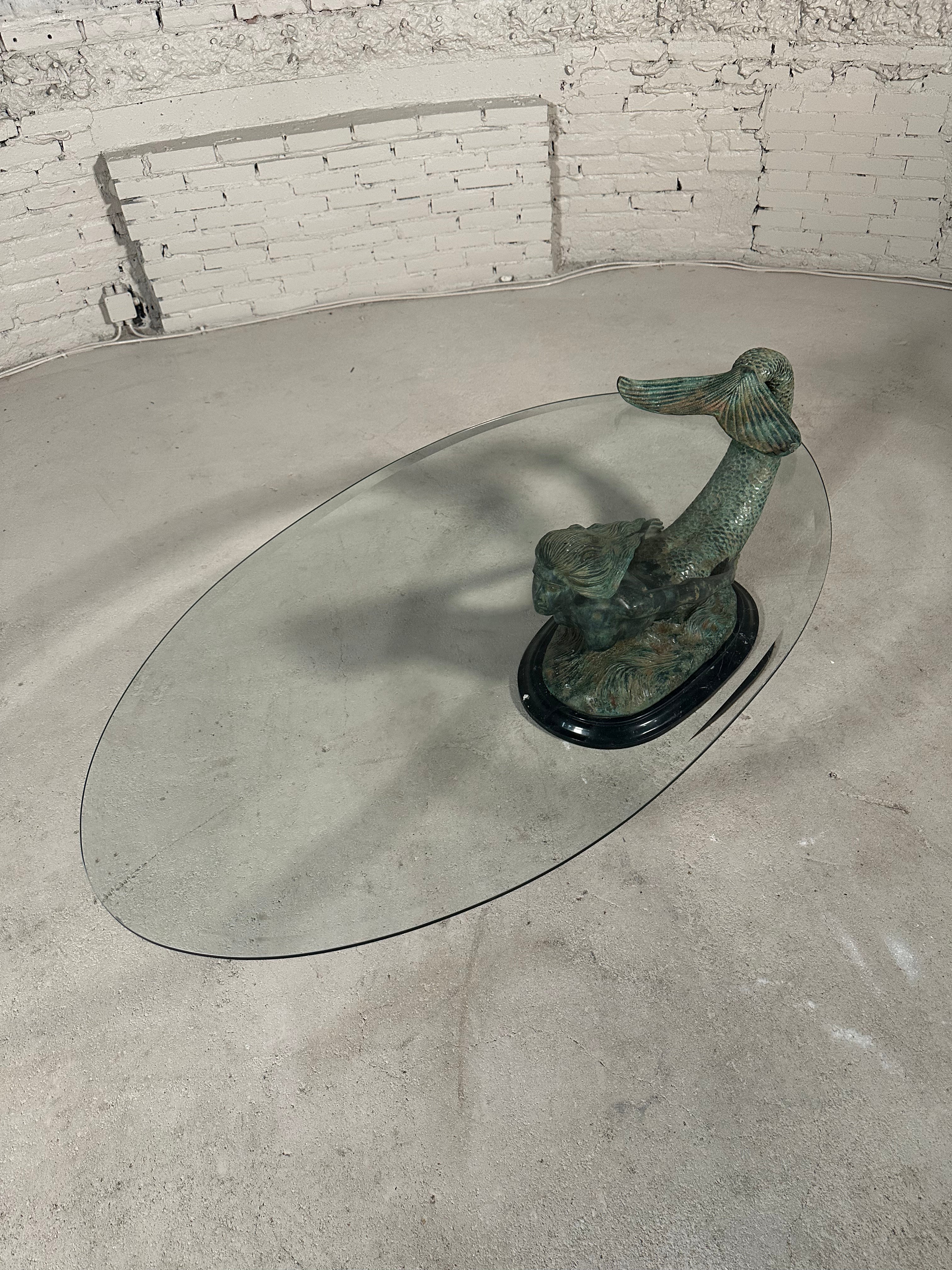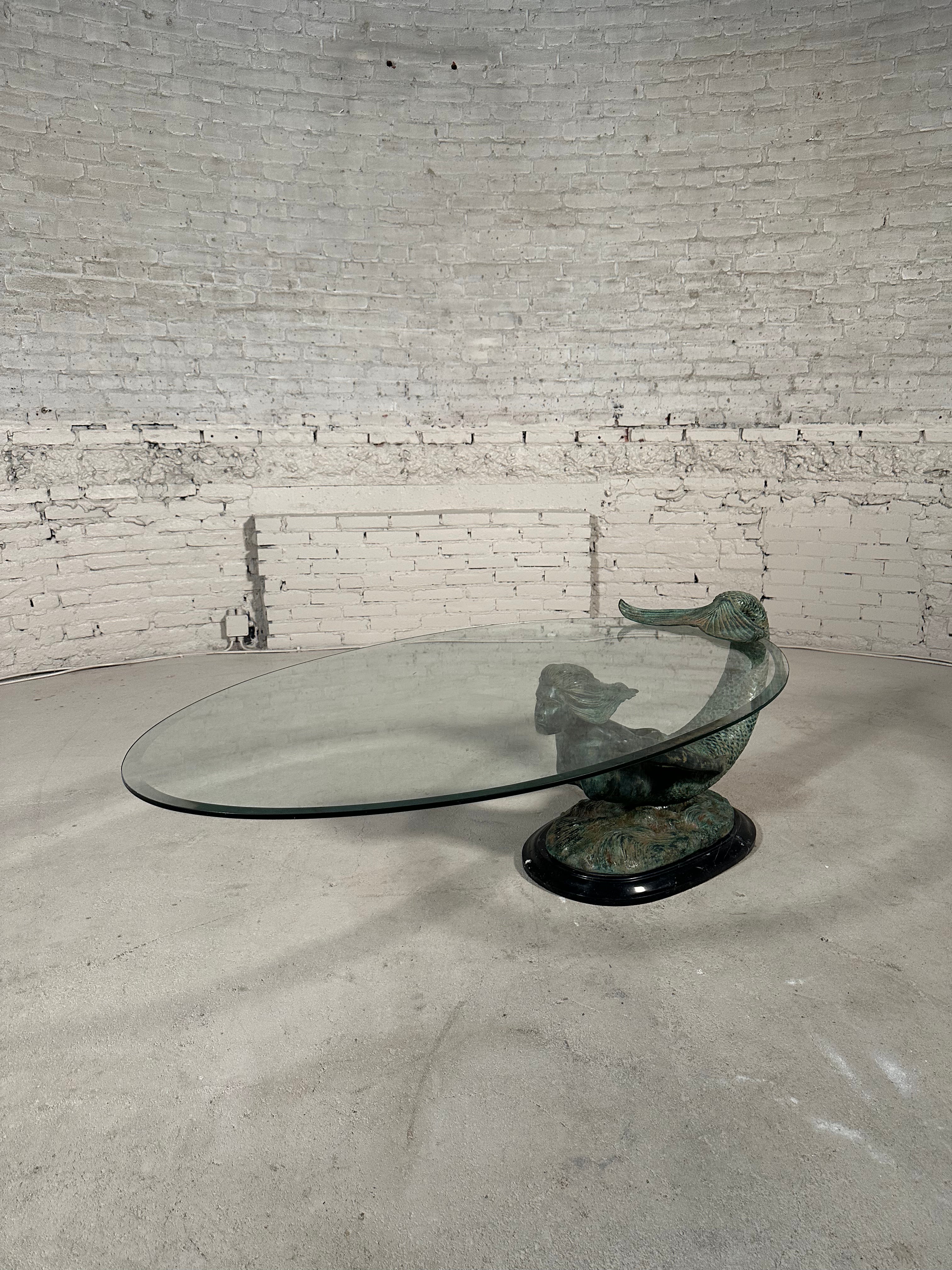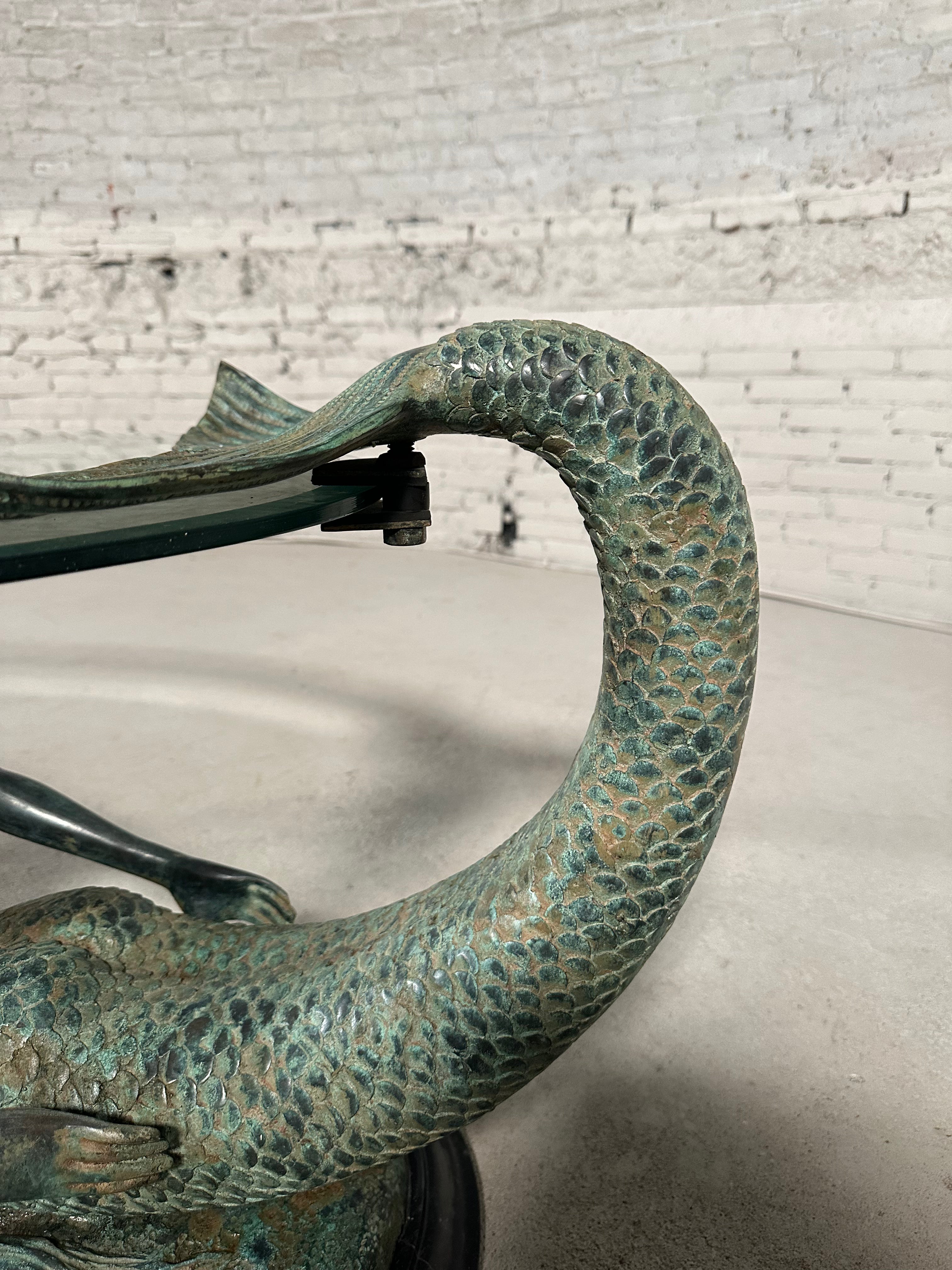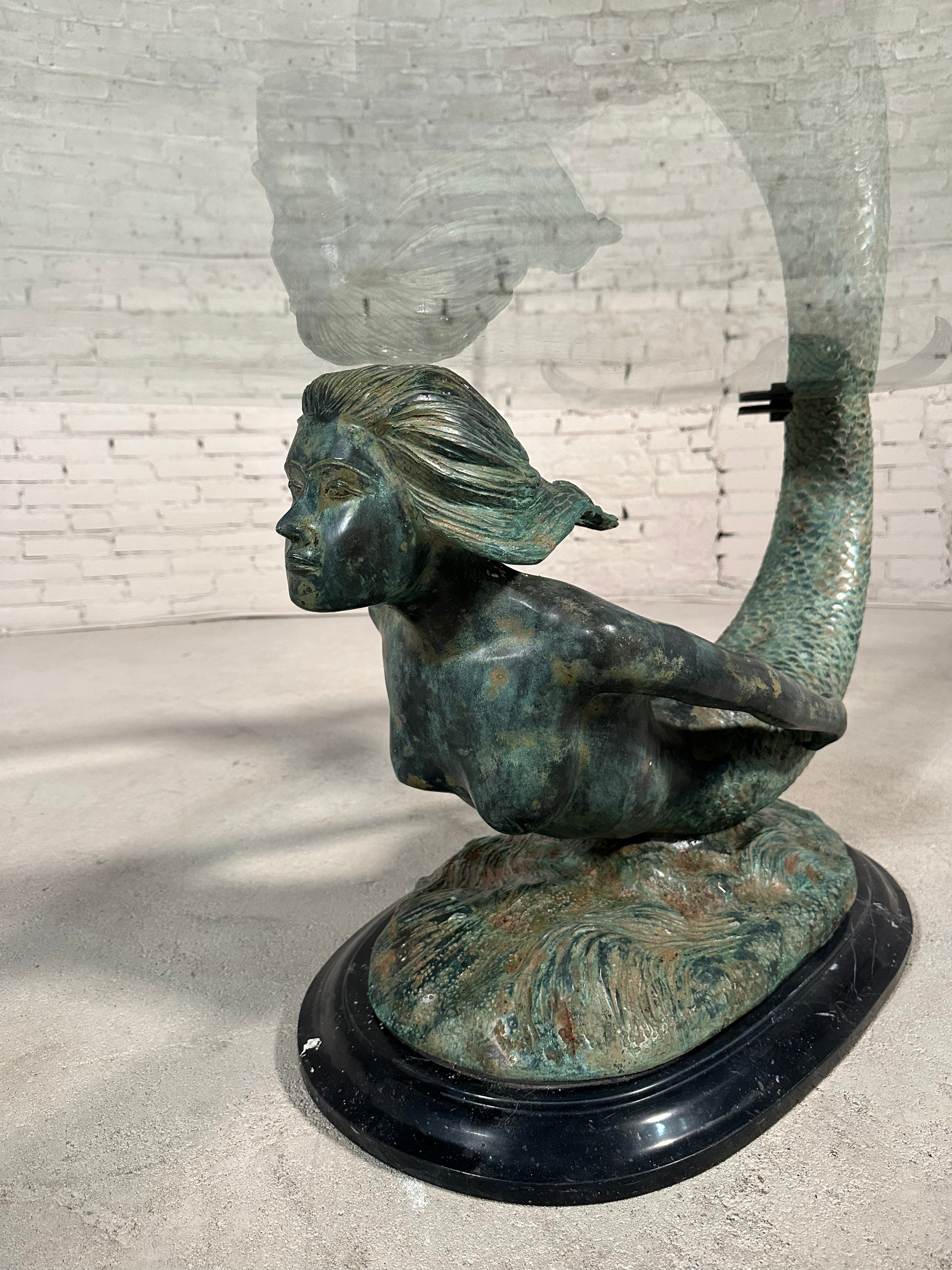 This elegant coffee table features a faceted glass plate resting upon a sturdy mermaid bronze chassis with a stunning green patina. A massive marble plateau serves as the base for the mermaid sculpture. The glass and bronze components can be easily separated if desired.