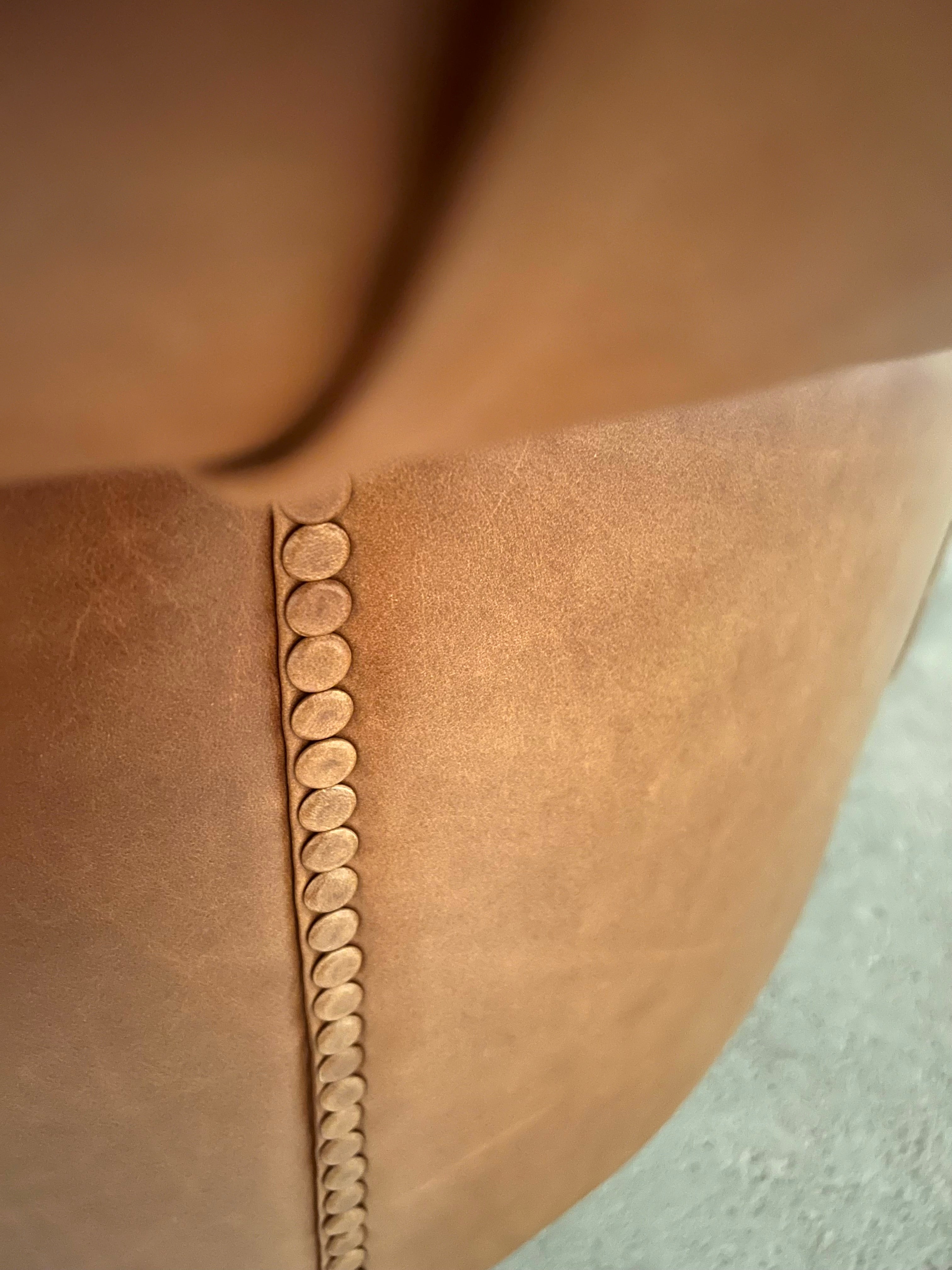The vegetable horsehair of the padding in the backrest and armrests is hand-modelled. The springs are eight-way springs, tied by hand and supported on jute webbing. The frame is in seasoned beech-wood. The upholstering is in Pelle Frau® leather. The seat cushions, padded with goose down with an insert in polyurethane foam are Pelle Frau® leather.