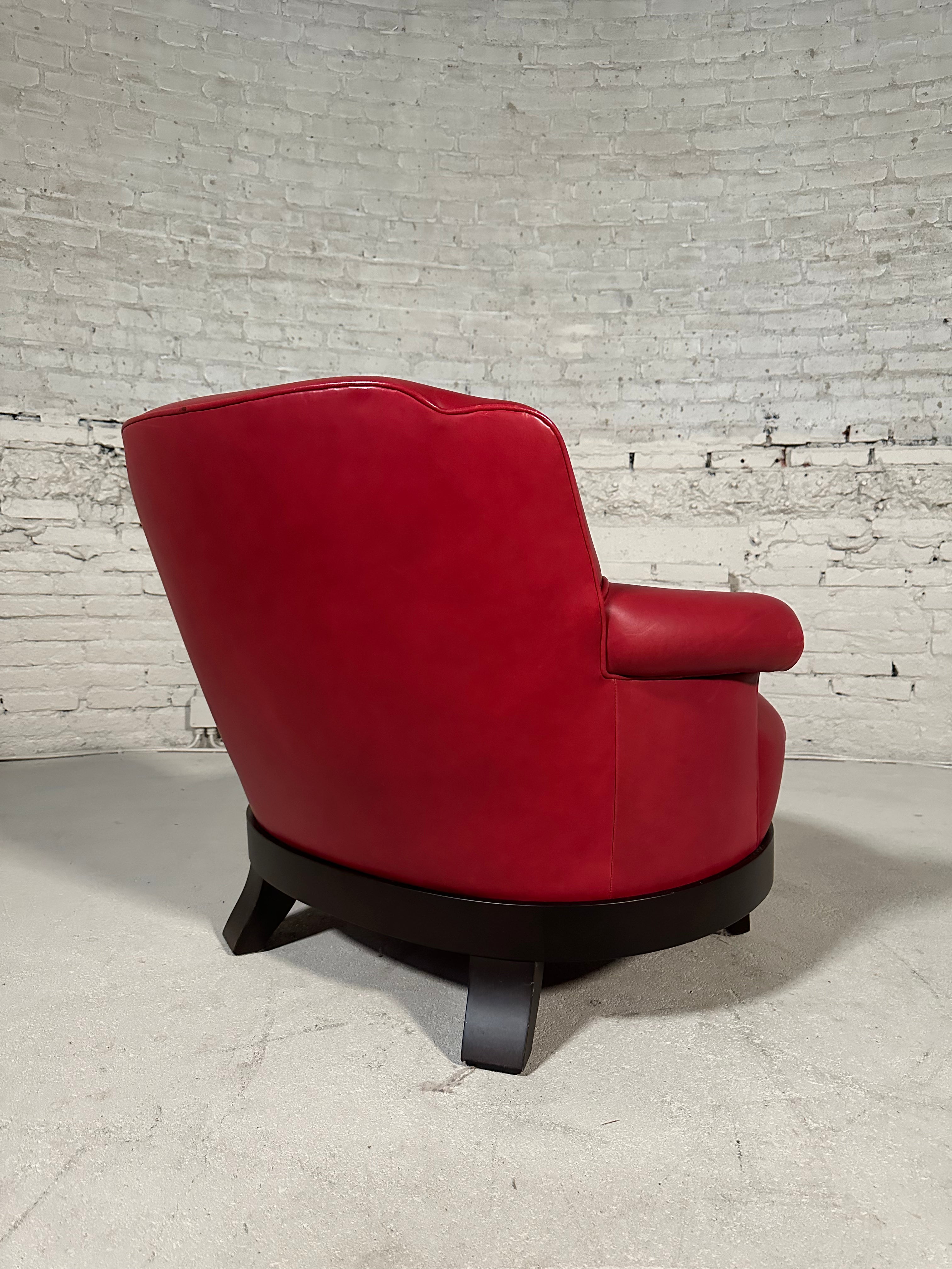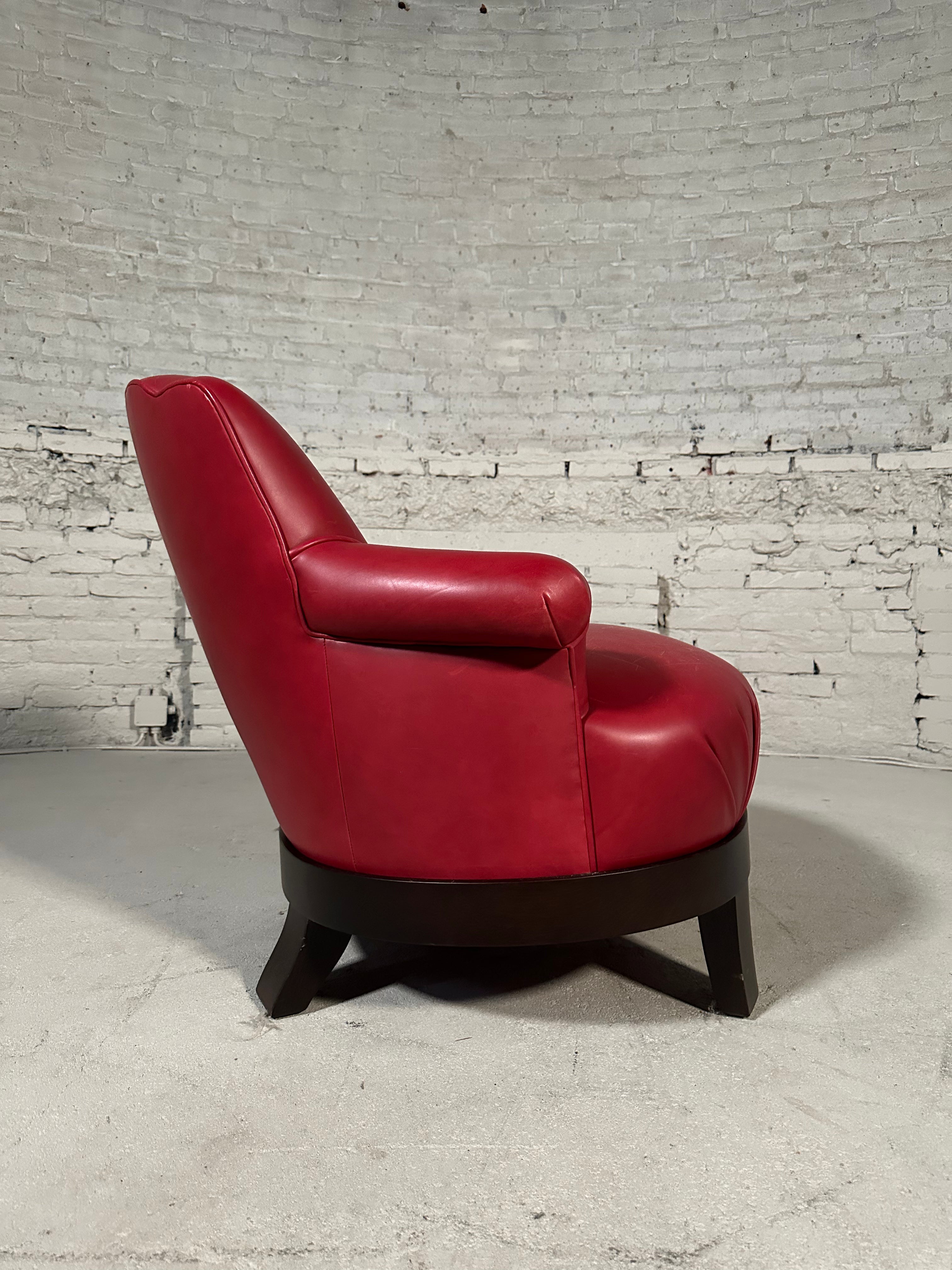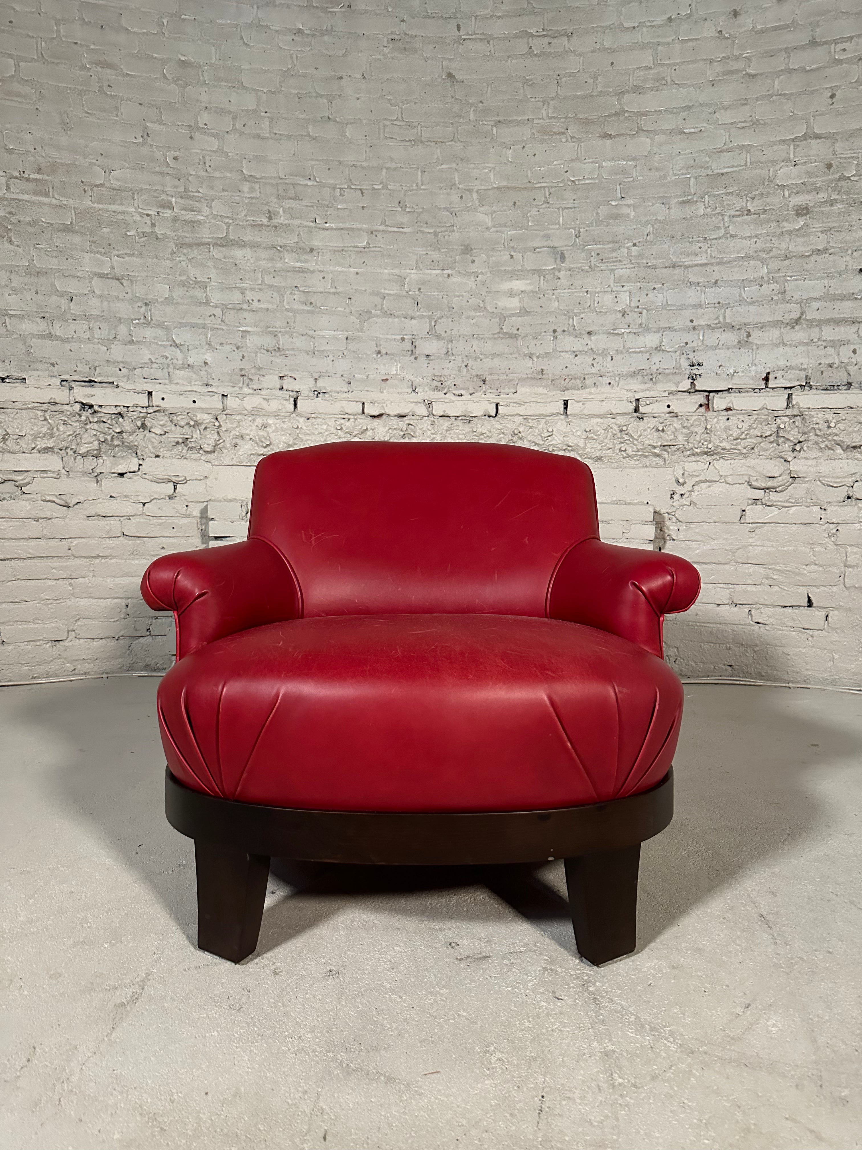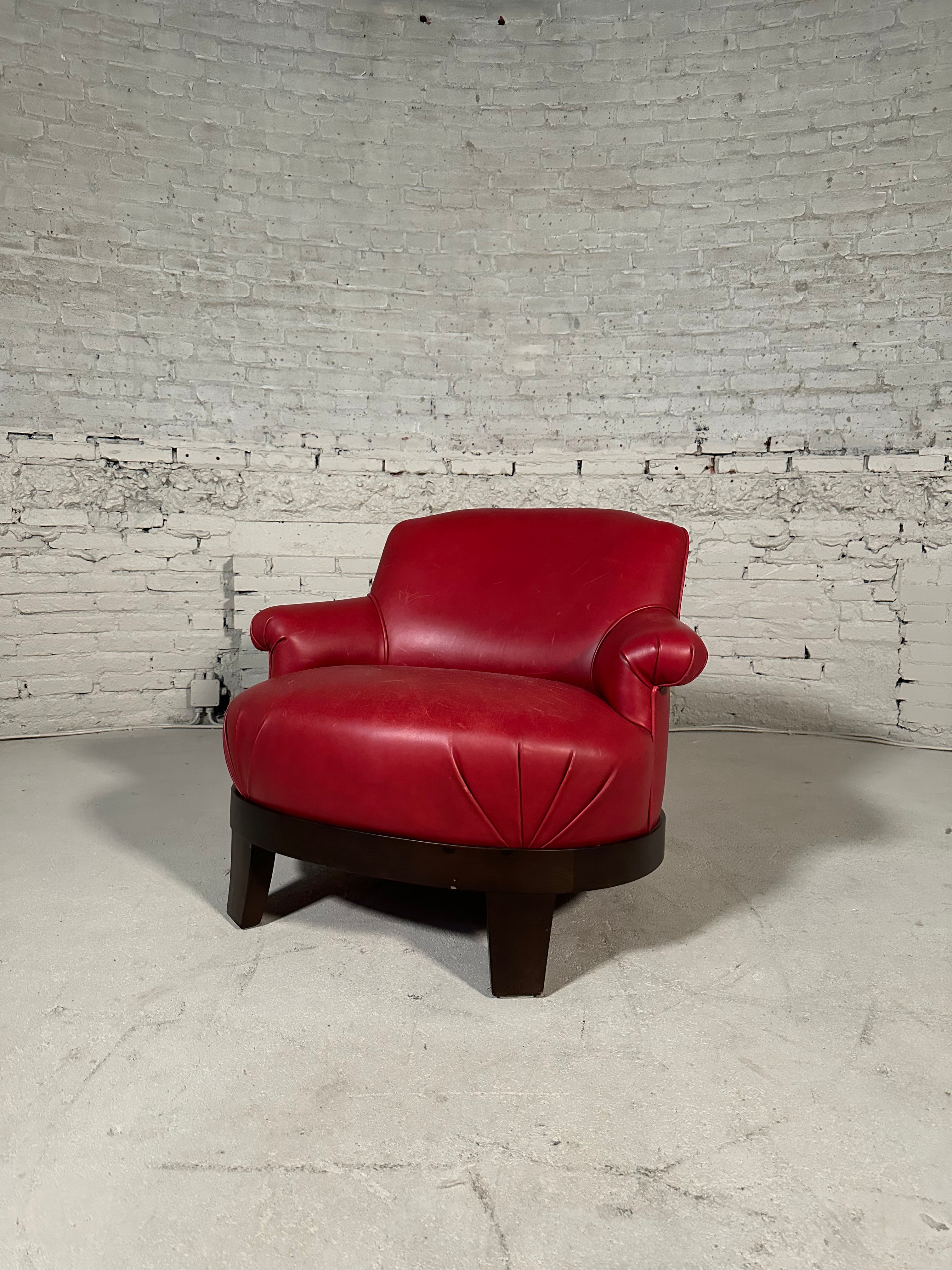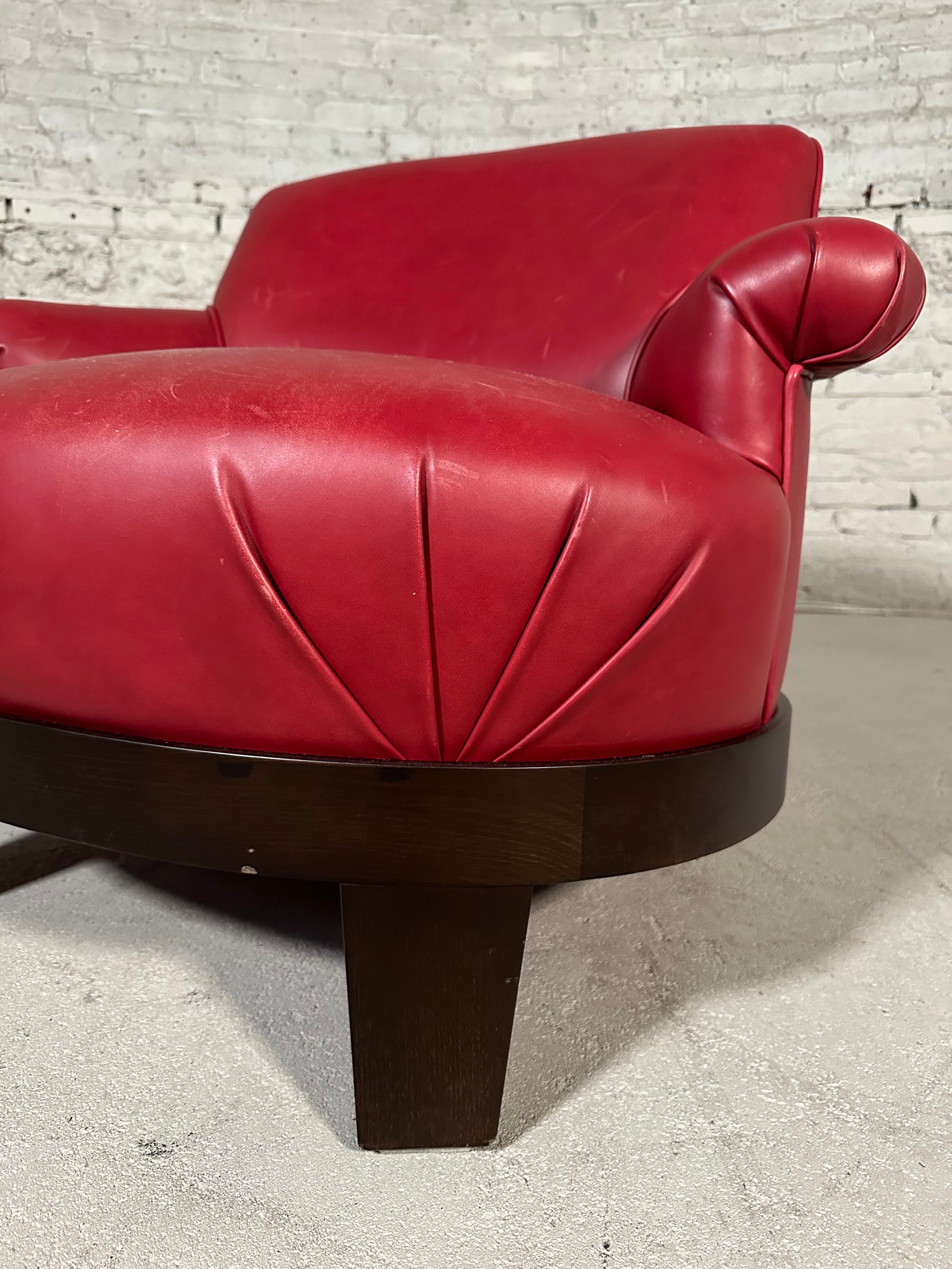 Vintage red leather barrel accent Mid-Century Modern club chair. Very solidly built, and very comfortable. It has a solid wood base with curved legs and is upholstered with a very soft red leather. It's a great lounge chair with a great size. It's the perfect project for an accent chair, and would look great in every mid-century modern interior. It's in an excellent condition.
