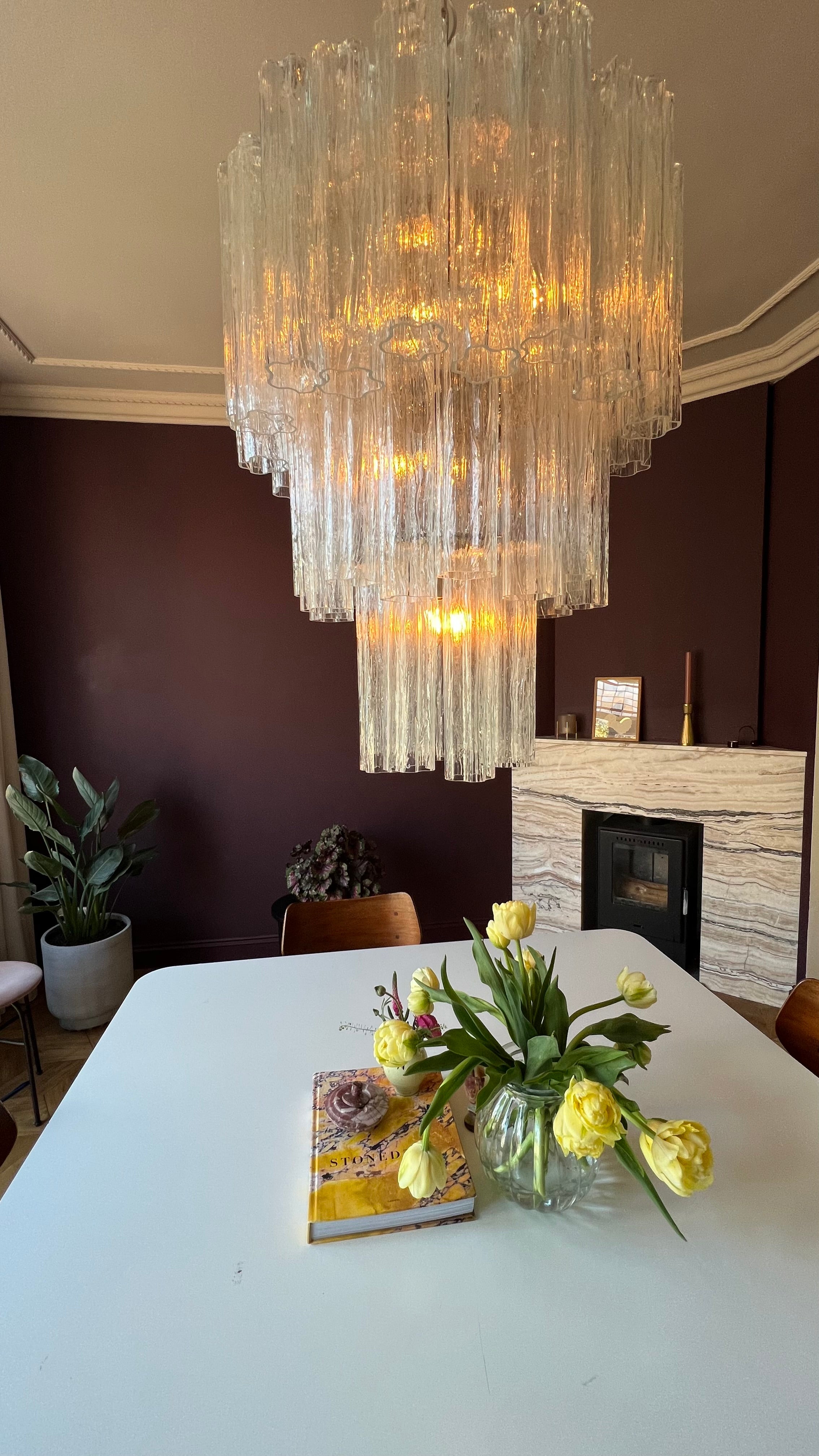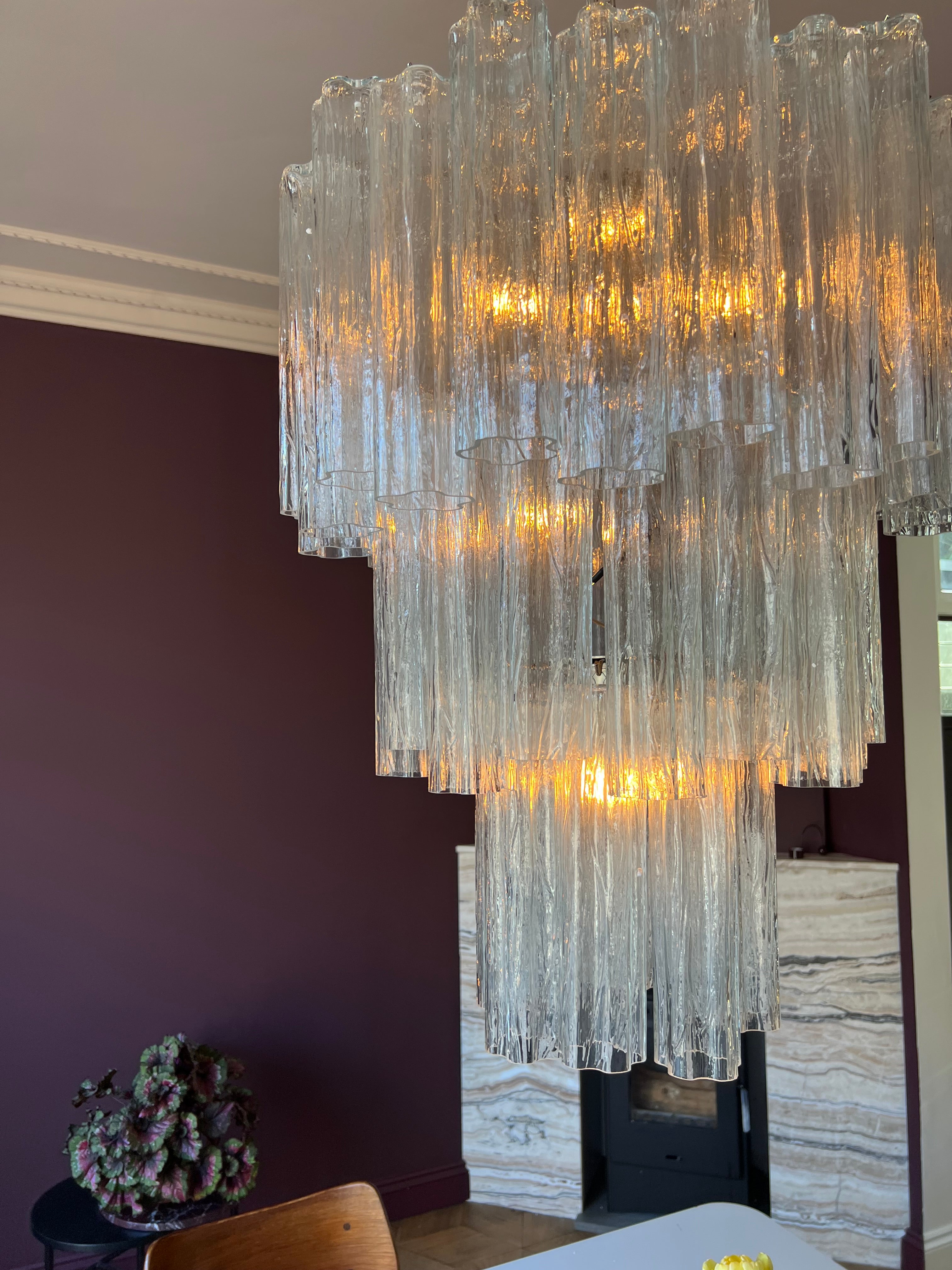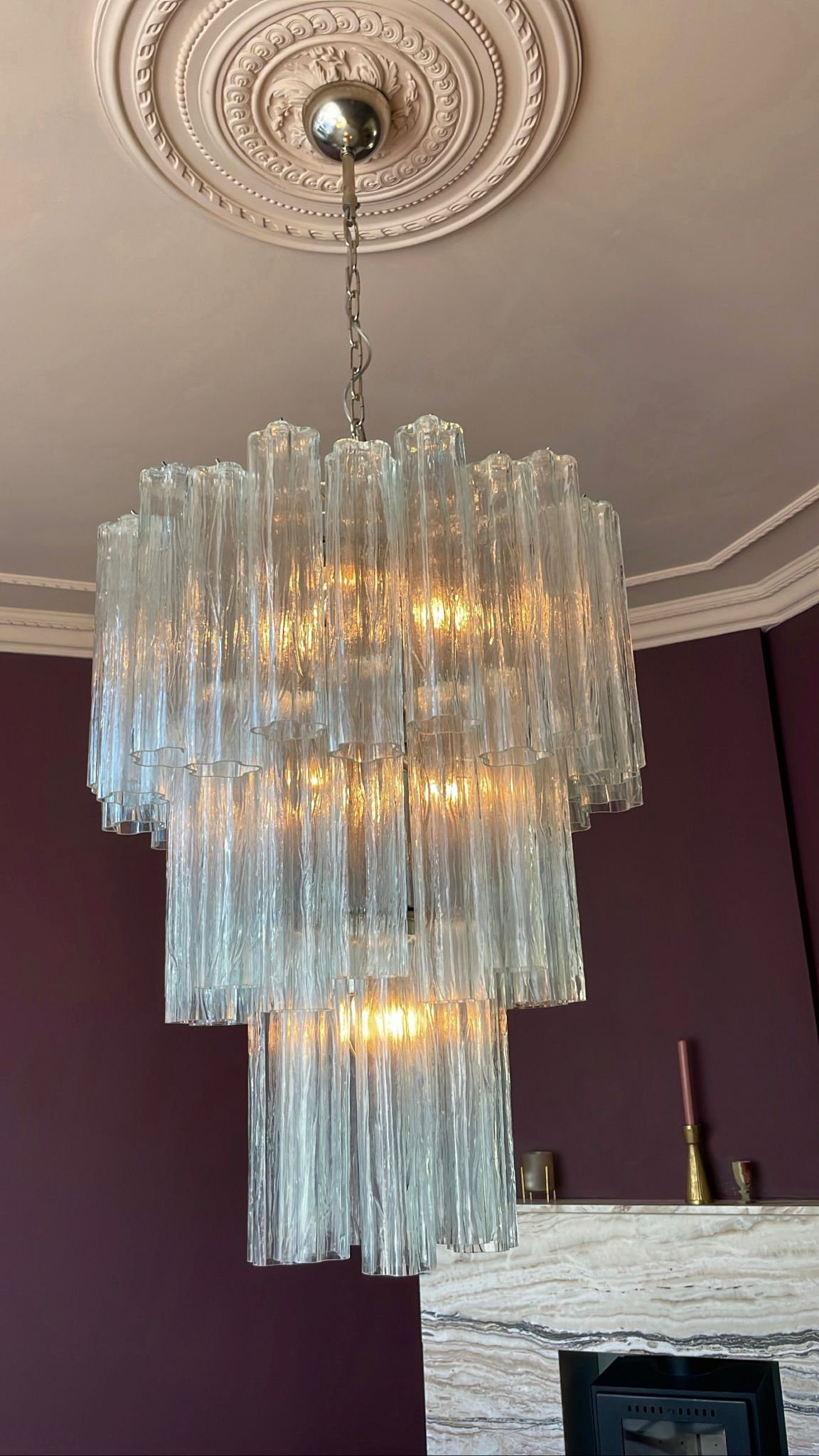 Italian vintage chandelier from the 80’ in Murano glass and nickel-plated metal structure. The armor polished nickel supports 48 large frosted glass tubes in a star shape.