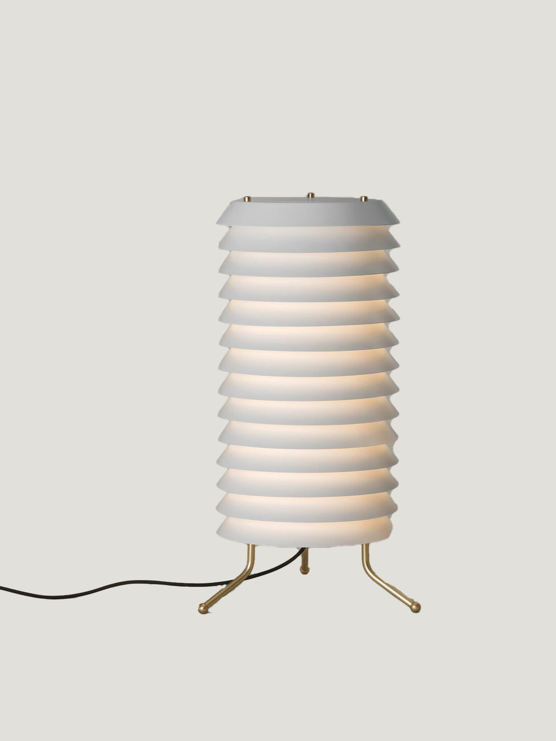 Metallic lampshade finished in matte white. Brass legs finished in matte. Diffuser in white translucent methacrylate. Dimmer included.