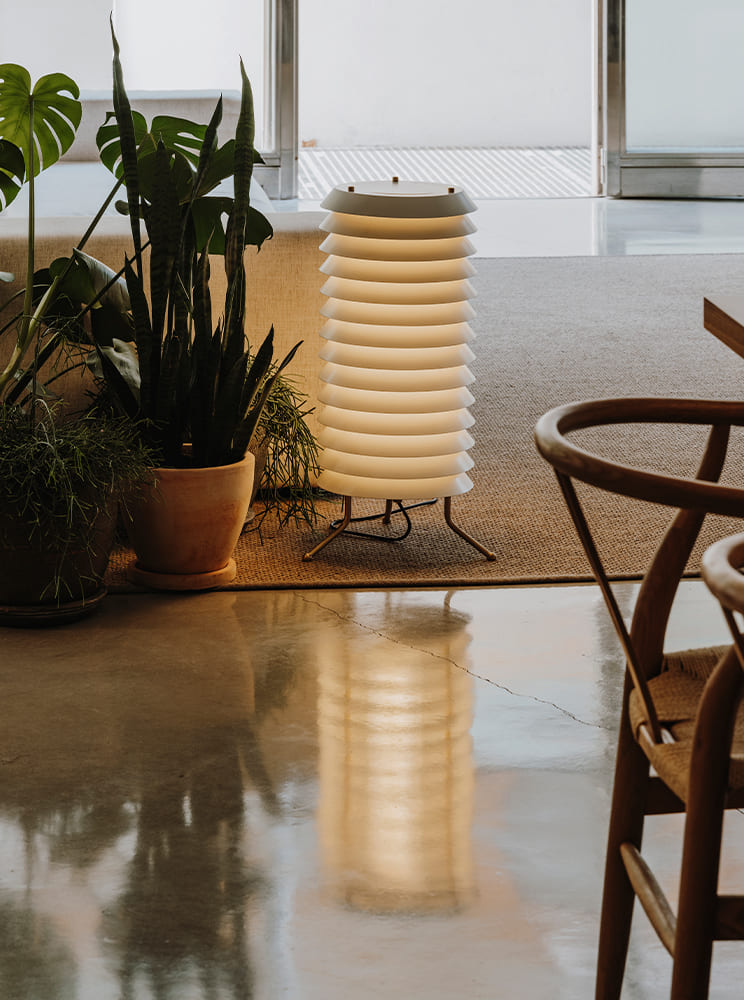 Maija conveys the feeling of light typical of Baltic cities, where the streets are barely illuminated, apart from the light that streams from the windows of homes and shops; from the inside outwards. A tower composed of stacked metal discs through which its inner light filters, vibrant and inviting conversation.