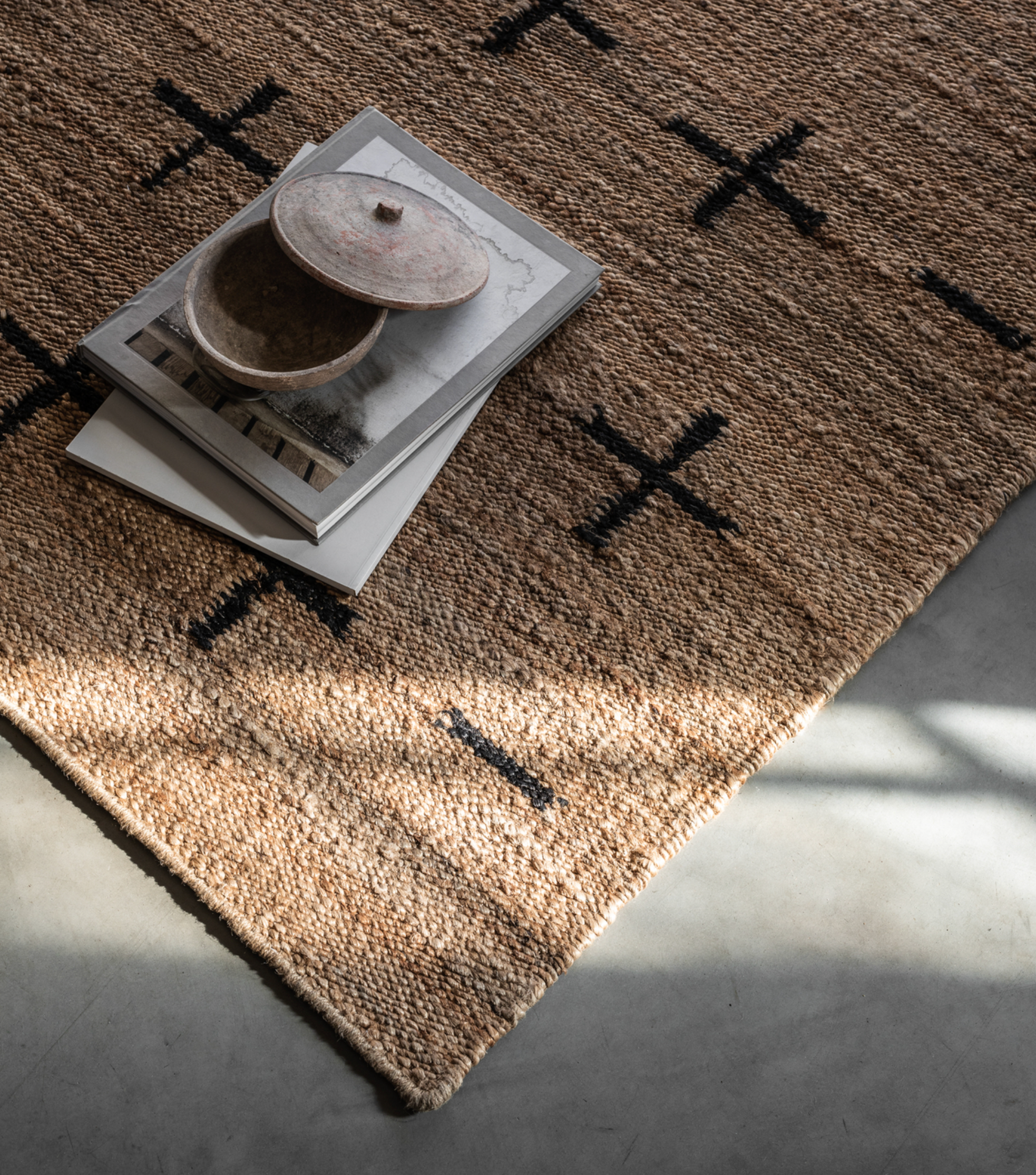 The modern rustic design Jute comes in a range of graphic patterns and uplifting color accents, which have been handcrafted using traditionally woven all-natural plant fibers. The enduring material features a rugged, brown melange with characteristic irregularities, making each piece unique.