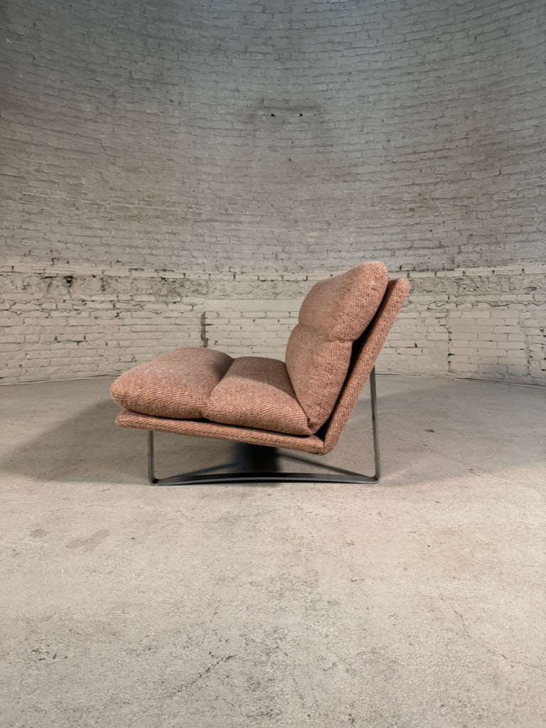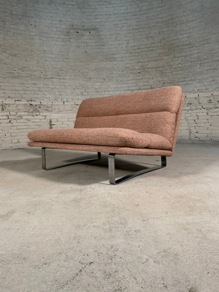 The Artifort two-seater designed by Kho Liang Ie, model C683 stands as a bold statement of mid-century design. Originally conceived in the 1960s, its clean lines and sleek metal base exude timeless sophistication.