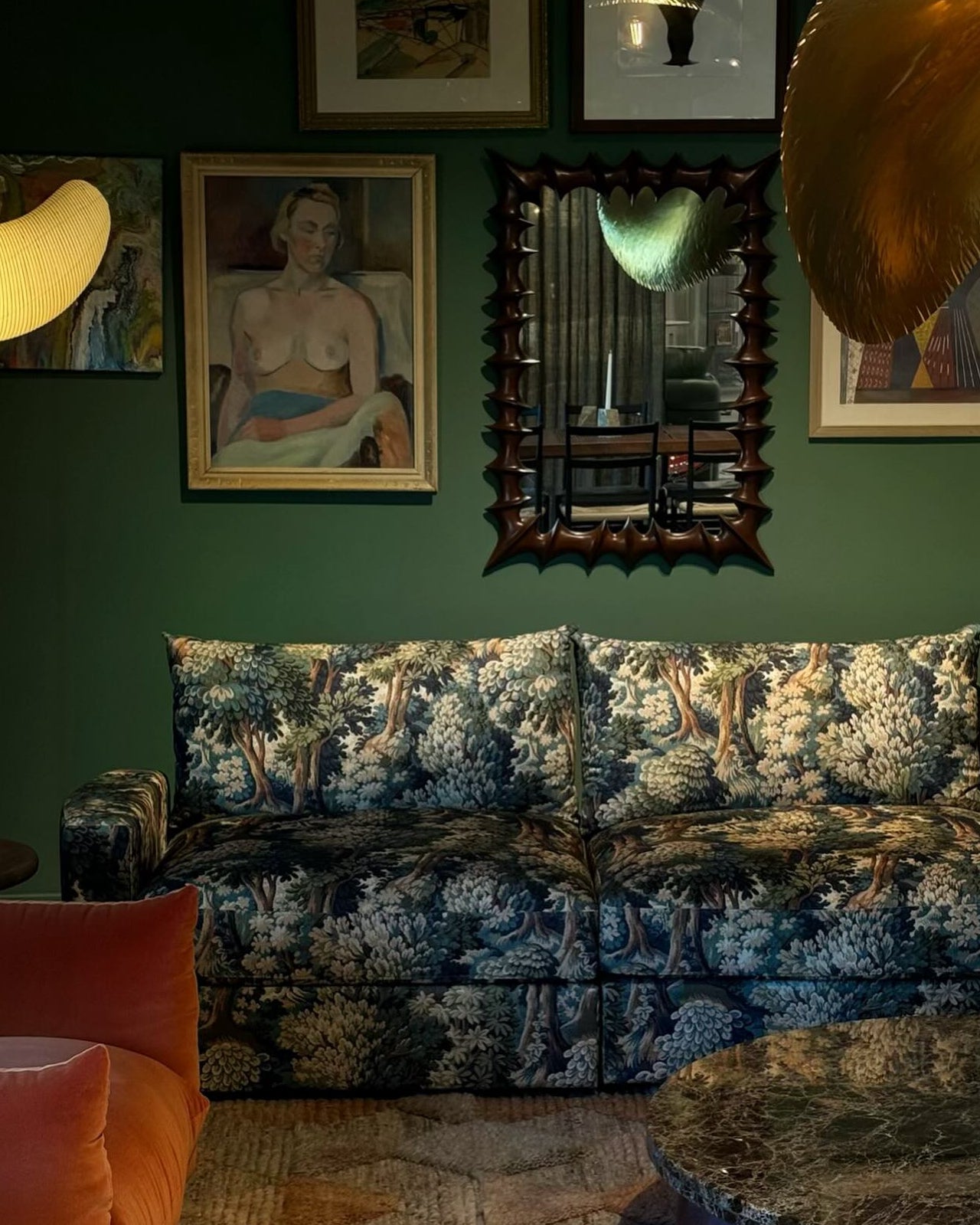 Upholstered in a fabric by Lauritzon with deep green hues and beautiful pattern, making it a standout piece. The elegant design with plush cushions, effortlessly complements both modern and classic interiors. Perfect for living rooms or lounges, this two-seater combines durability with aesthetic appeal, making it a versatile addition to many homes.