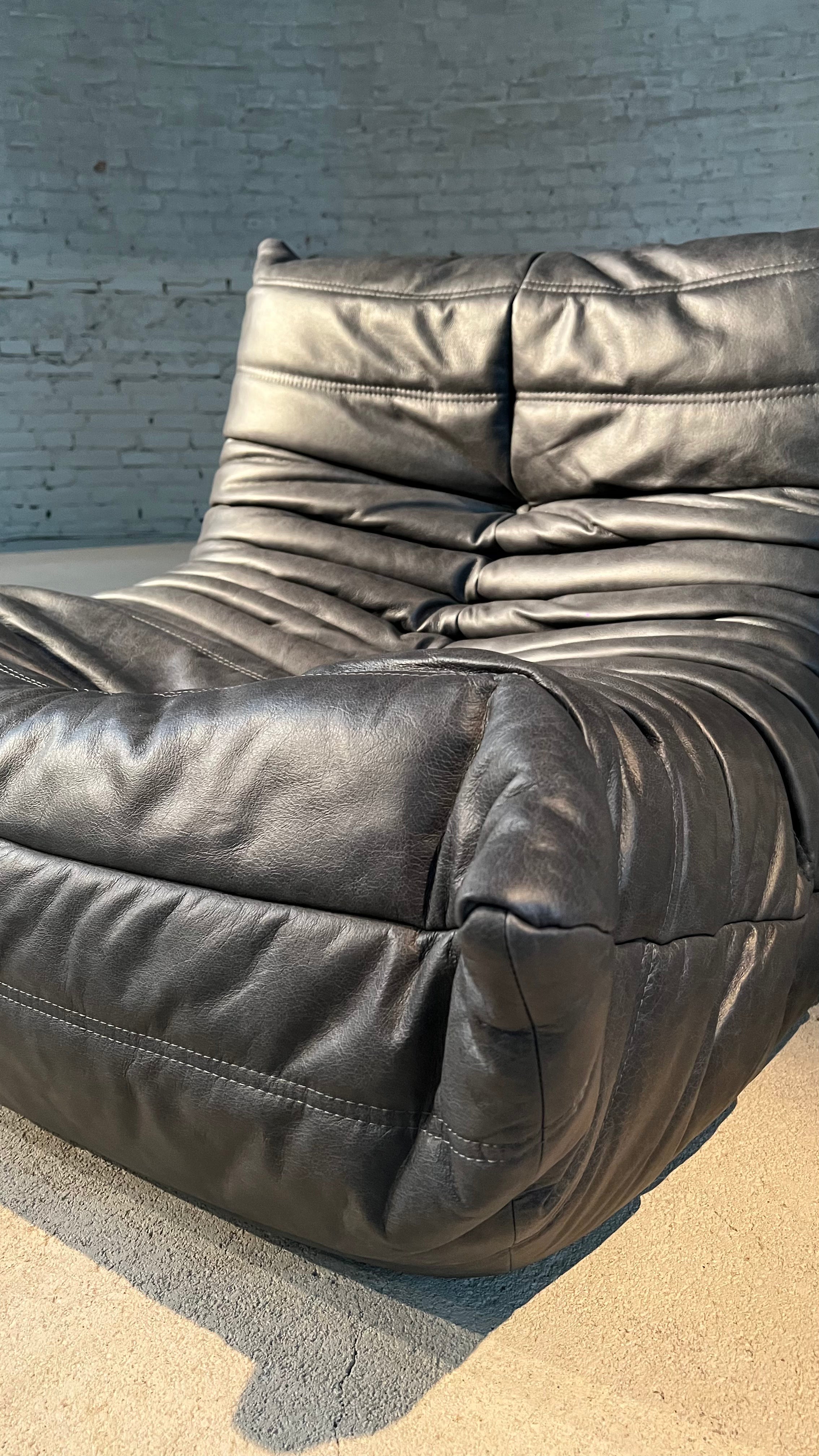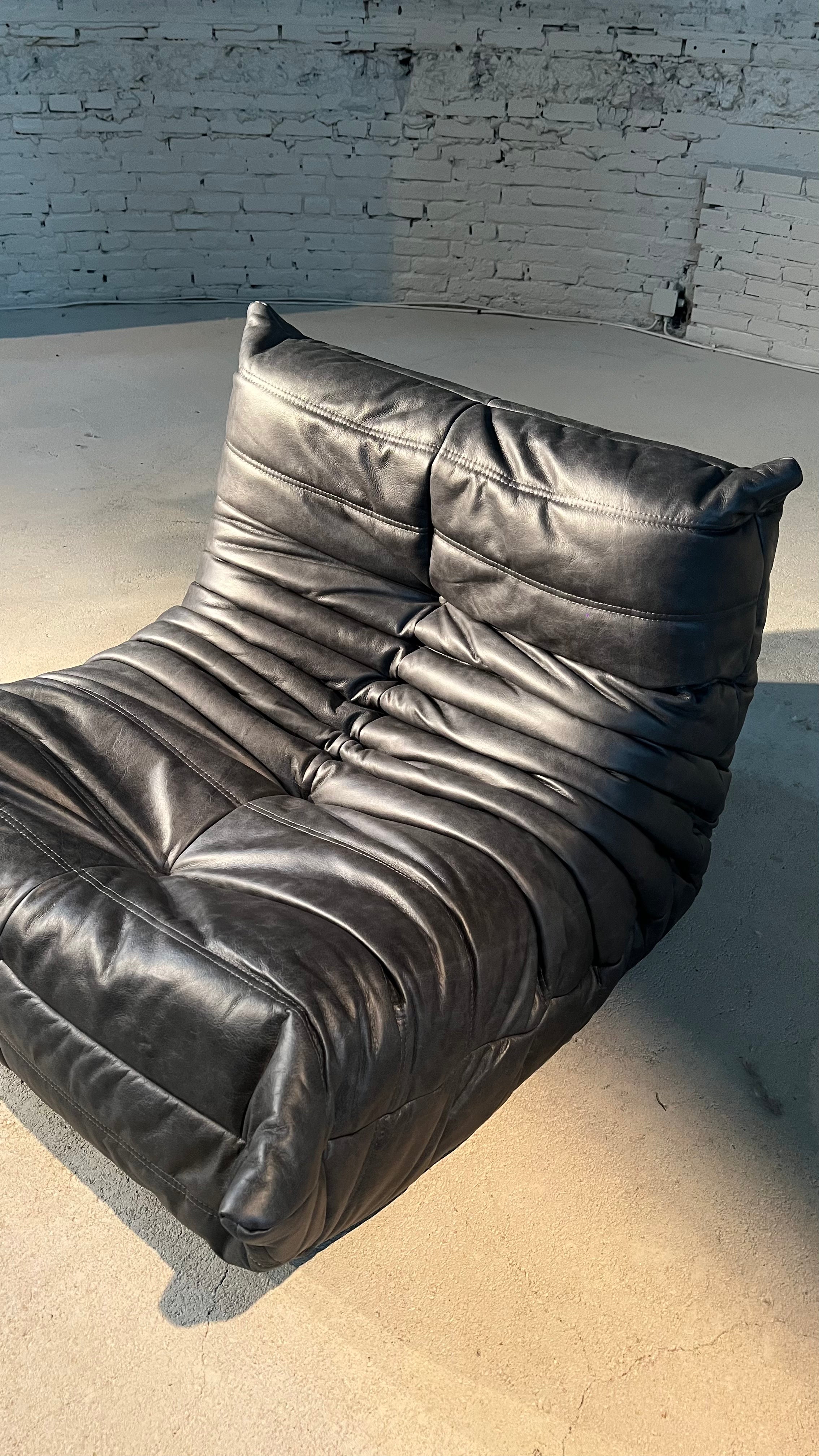 The iconic Togo sofa, designed by Michel Ducaroy for Ligne Roset in 1973, has become a design mid century classic. This 1-seater sofa is incredibly versatile and can be used alone or paired with other pieces from the range. The piece features the instantly recognizable pleated design, which gives the chair its relaxed aesthetic. The sofa has been newly reupholstered in a rugged, supple anthracite leather.