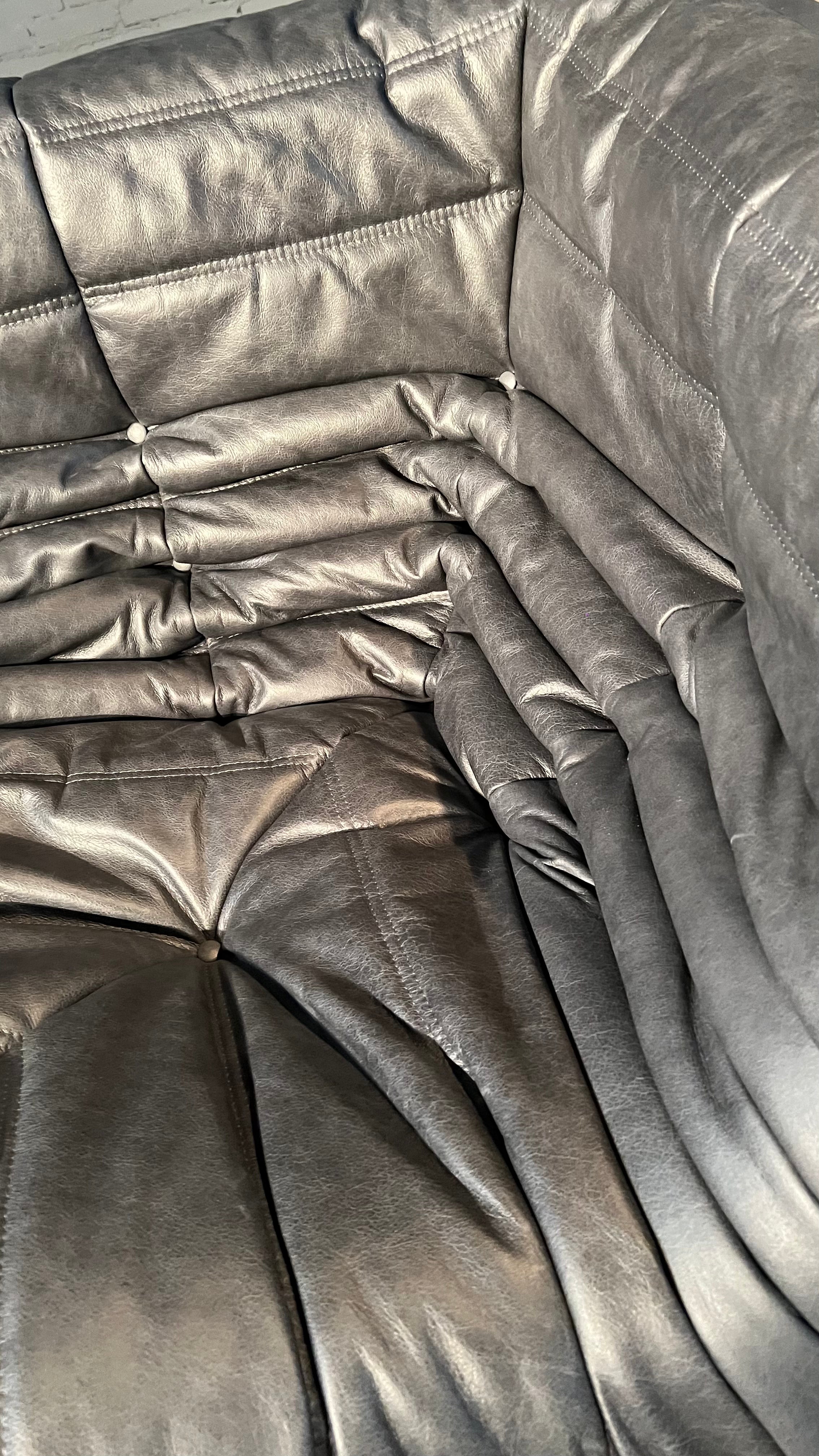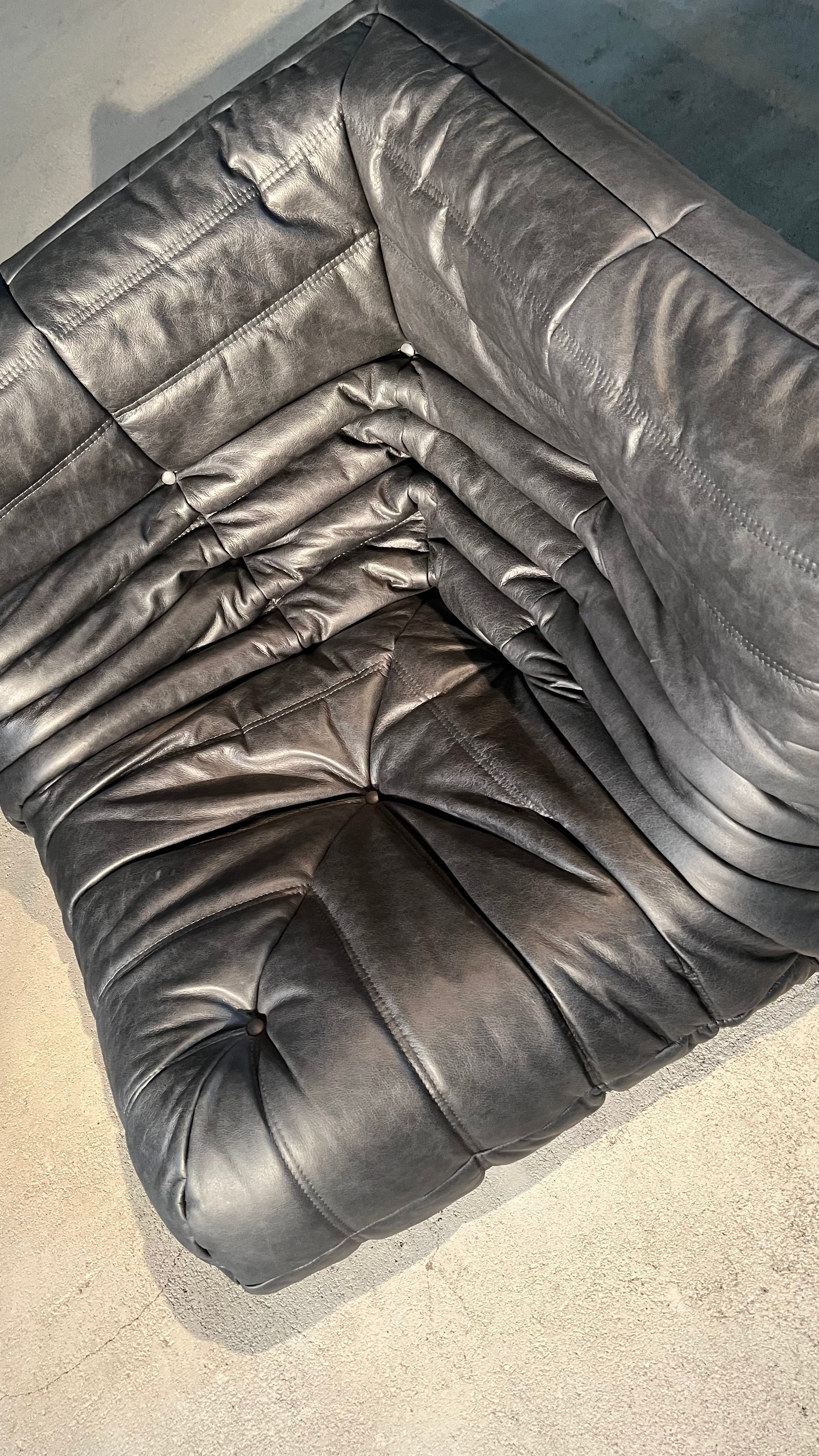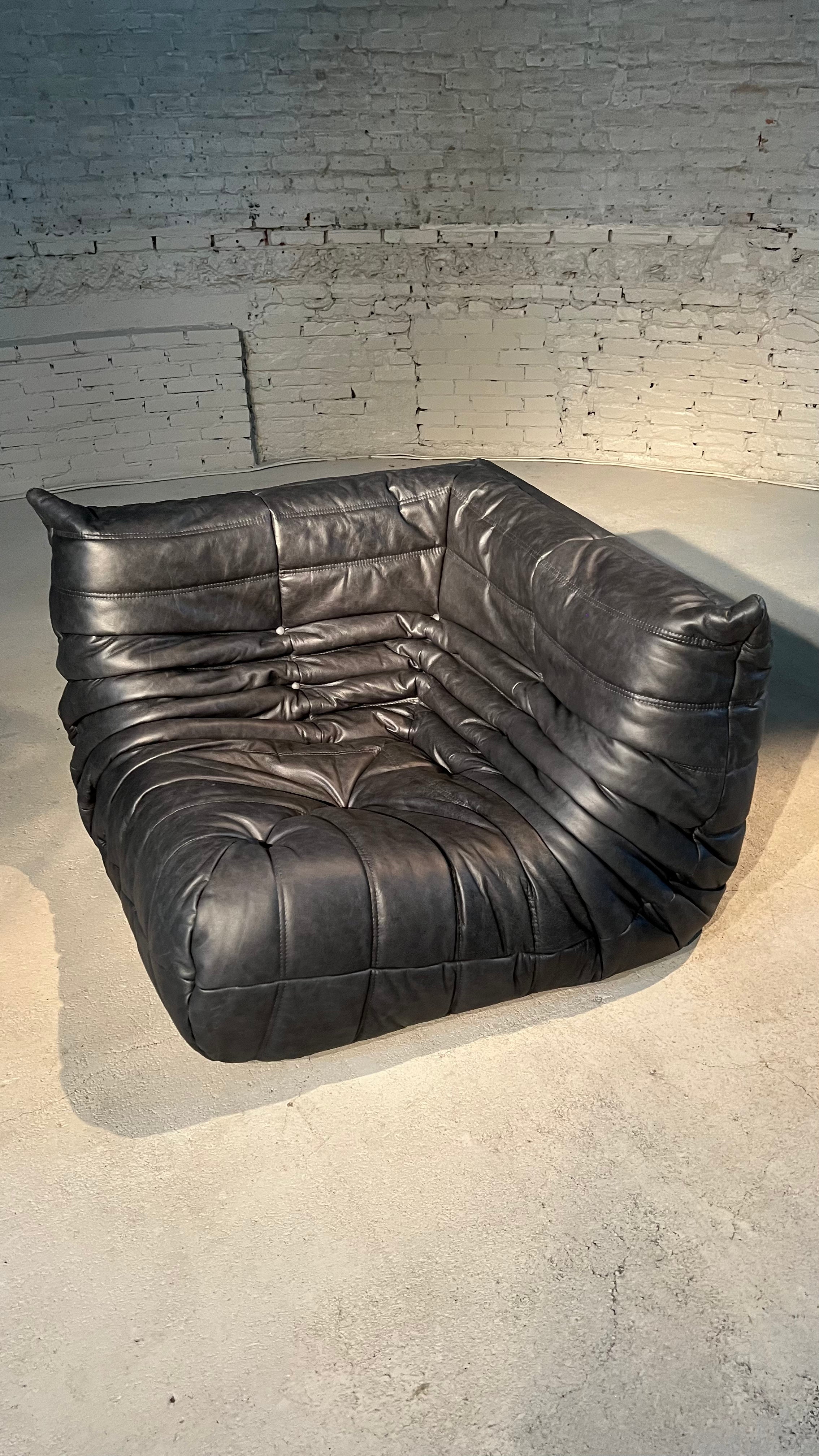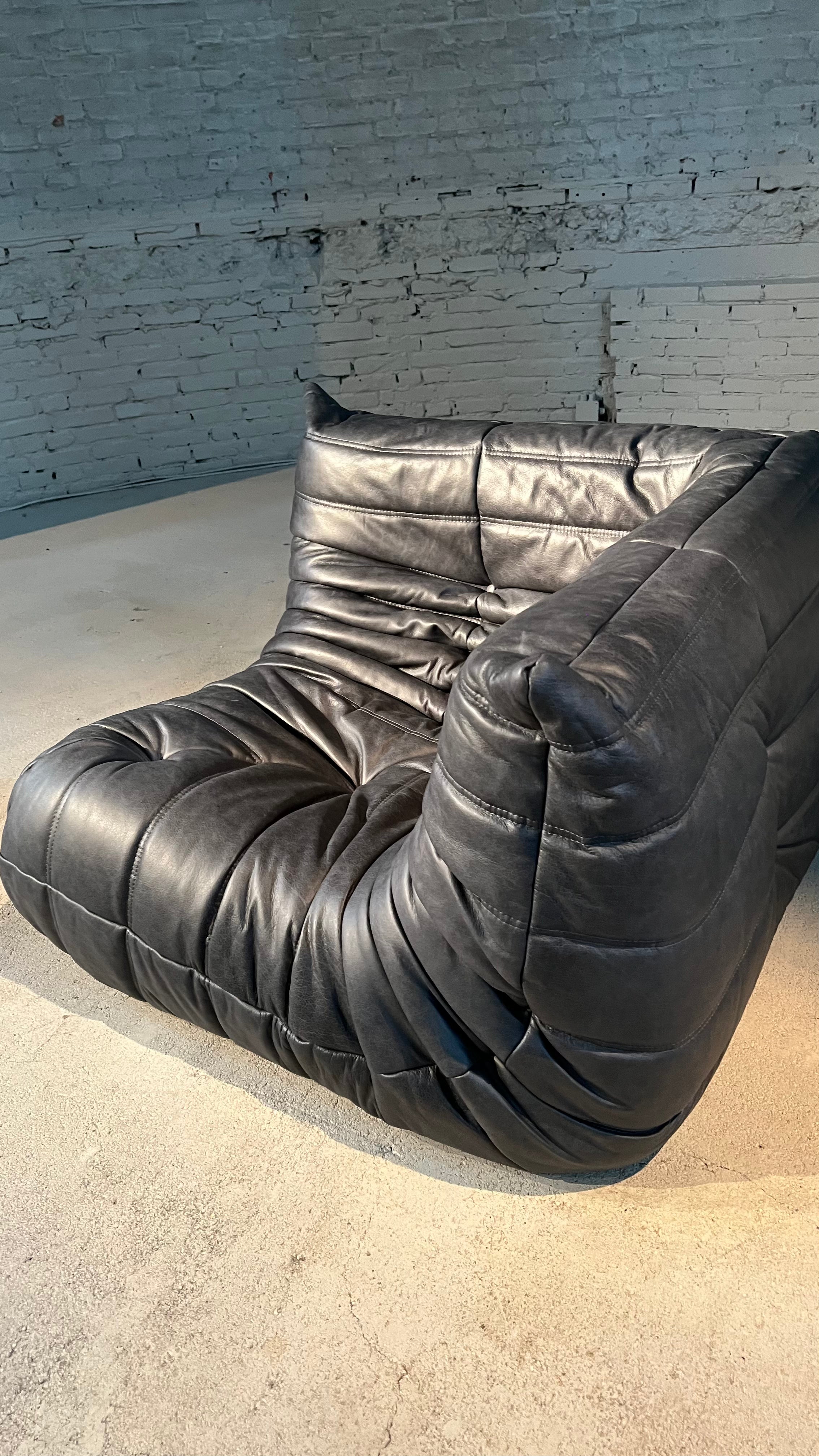 The iconic Togo sofa, designed by Michel Ducaroy for Ligne Roset in 1973, has become a design mid century Classic. This 2 seater sofa is incredibly versatile and can be used alone or paired with other pieces from the range. The piece features the instantly recognizable pleated design, which gives the chair its relaxed aesthetic. The sofa has been newly reupholstered in a rugged, supple anthracite leather.