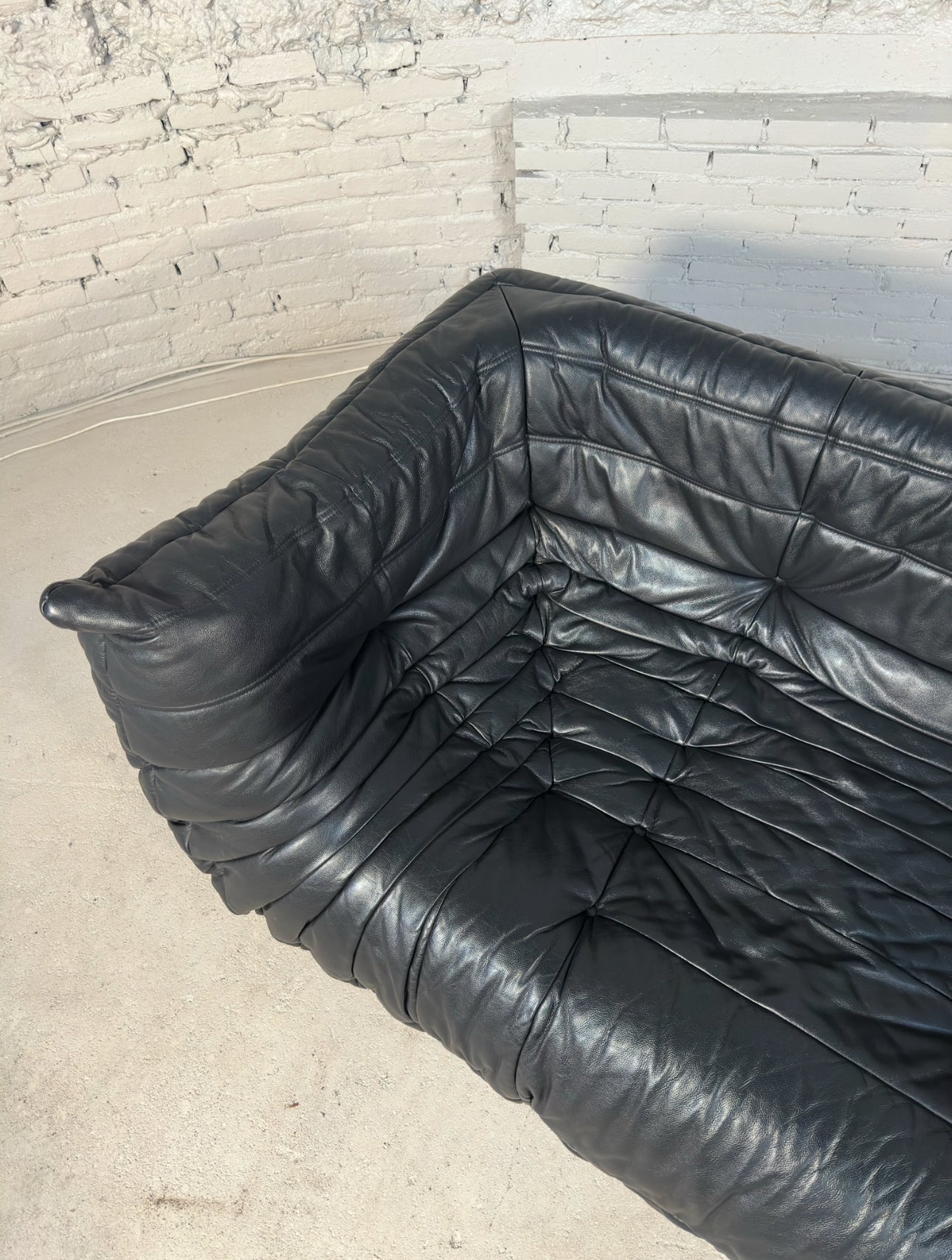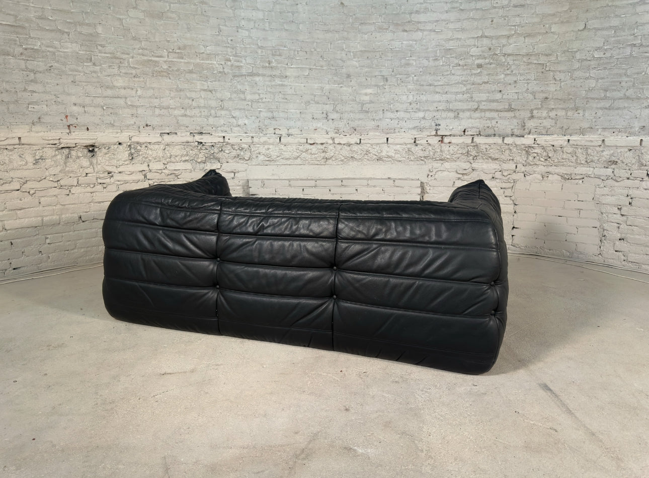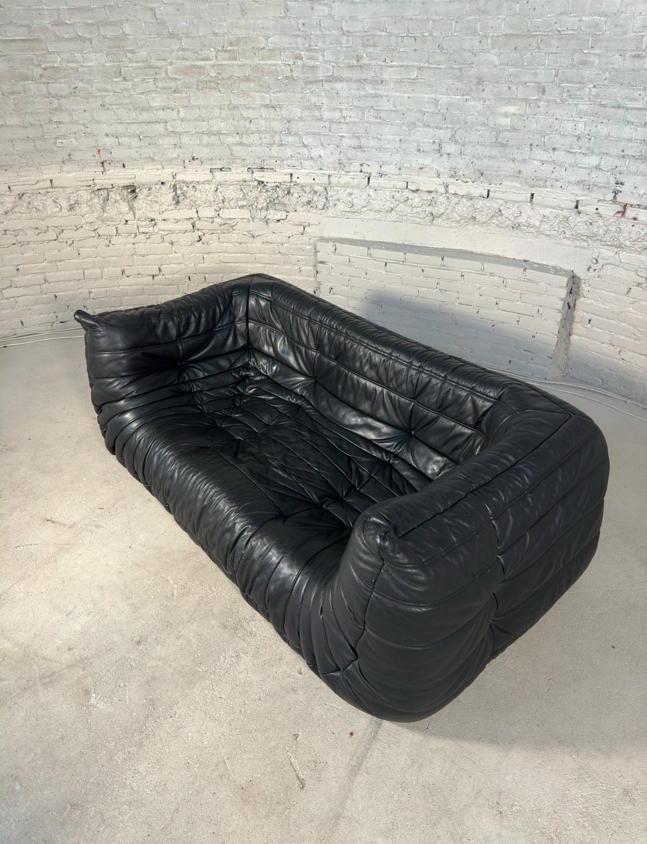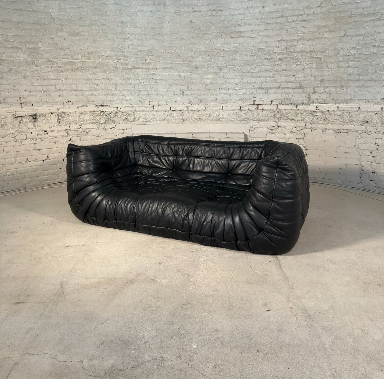 An iconic design classic in mint condition, this authentic vintage Togo two-seater medium sofa by Michel Ducaroy for Ligne Roset is a standout piece of 1970s French design. The rare 2 corner model in grained black leather features the signature pleated detailing that has made the Togo a design icon for decades.