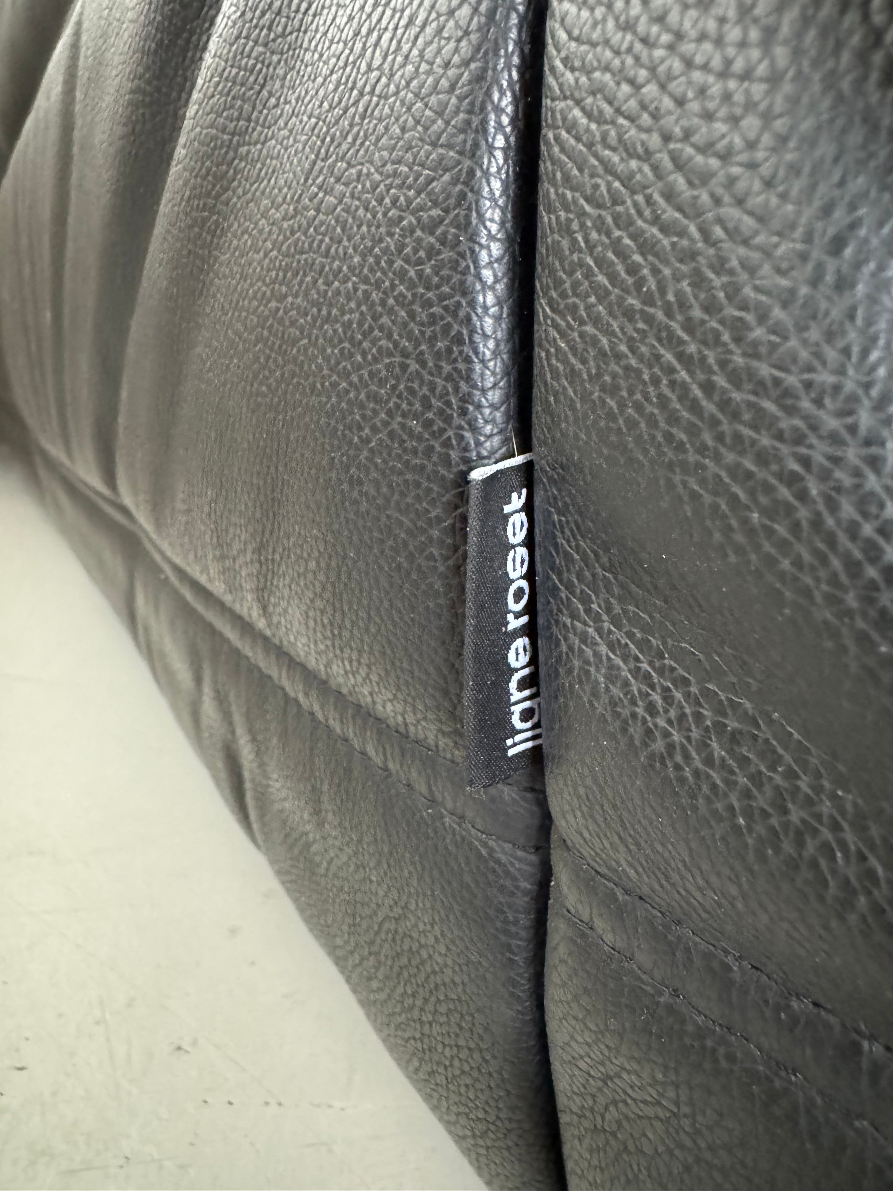 The piece retains its original Ligne Roset logo tab, confirming its authenticity. The supple leather, deep comfort, and low-slung silhouette make it ideal for modern, eclectic, or collector-grade interiors.