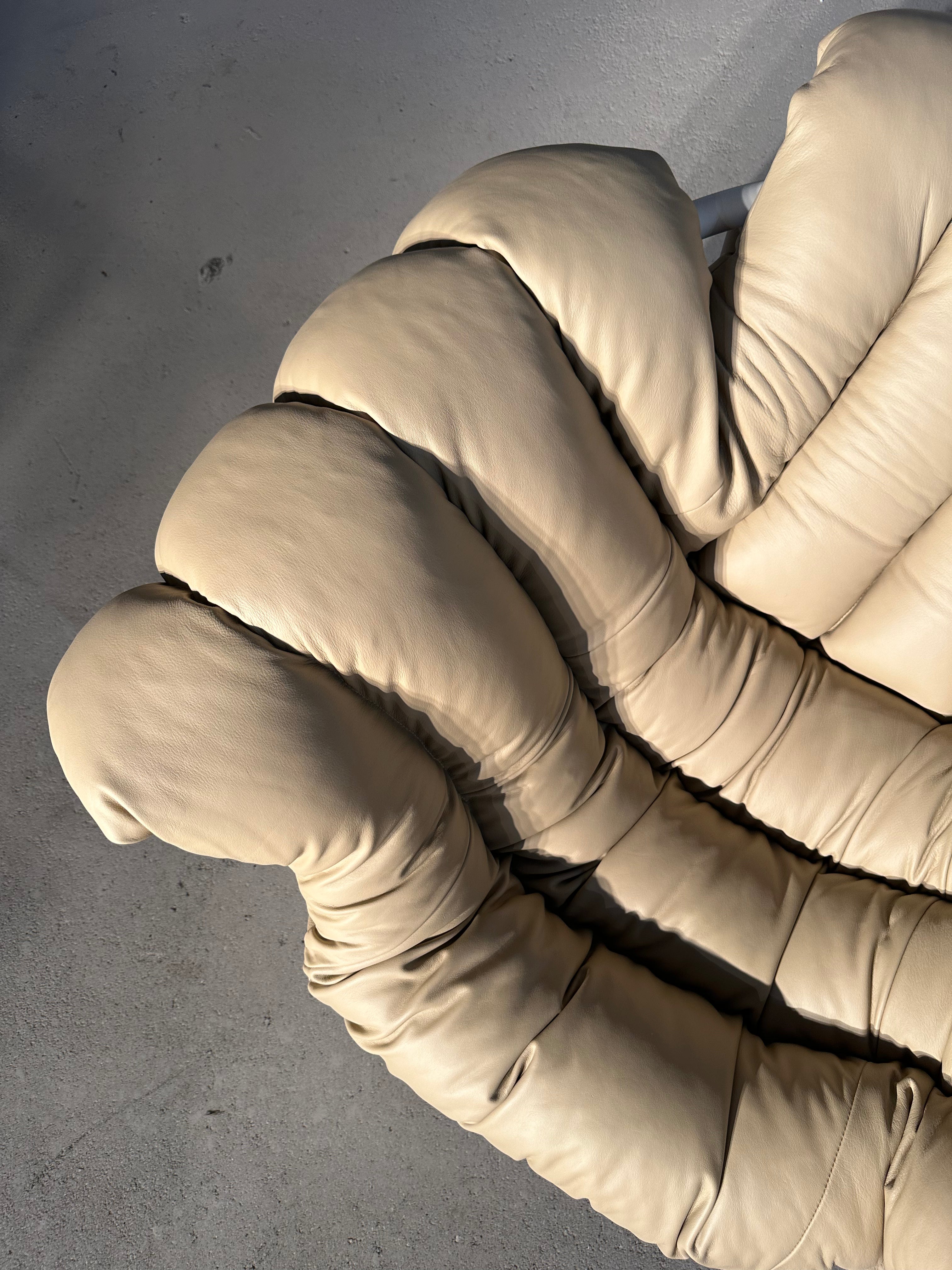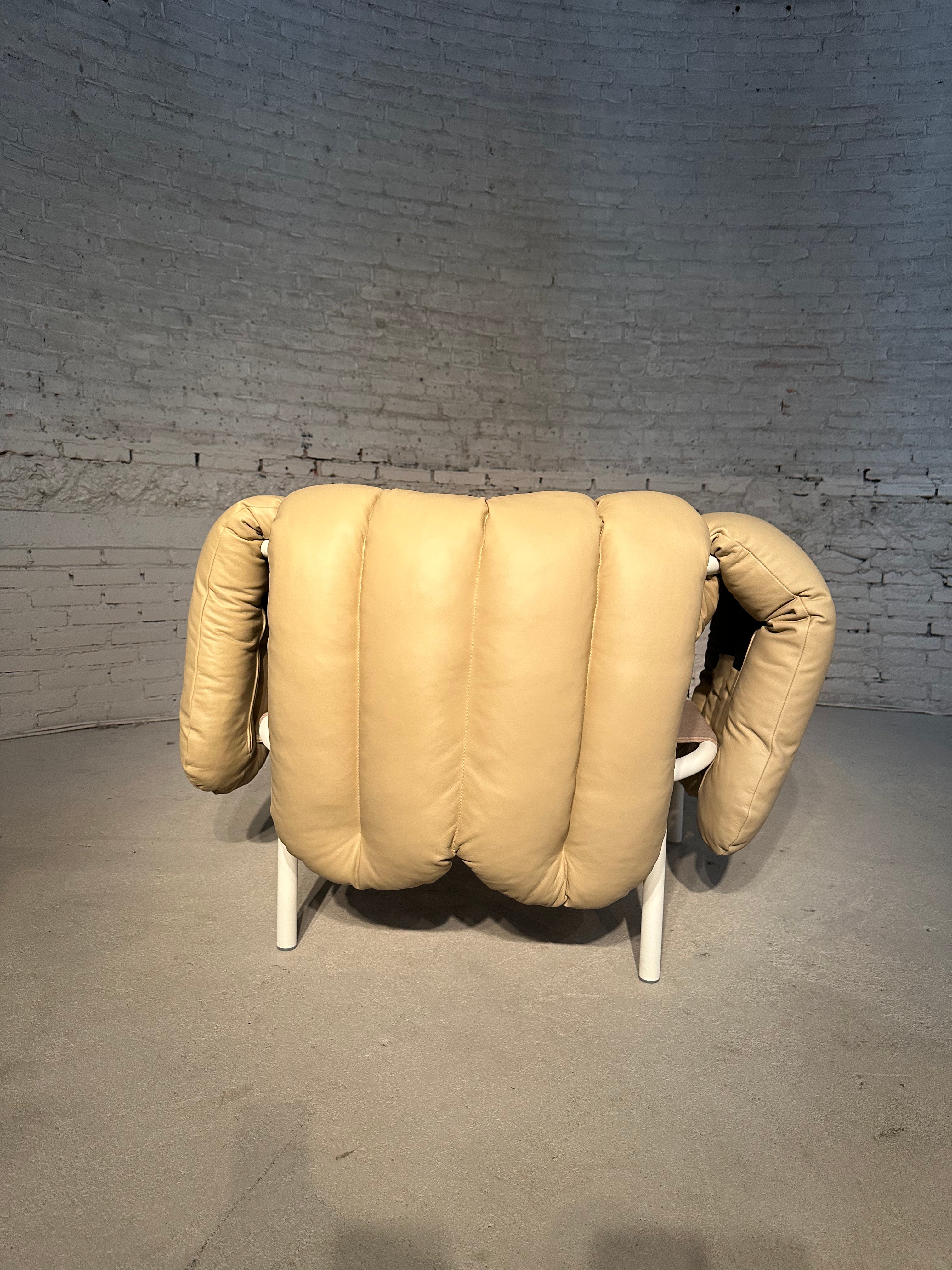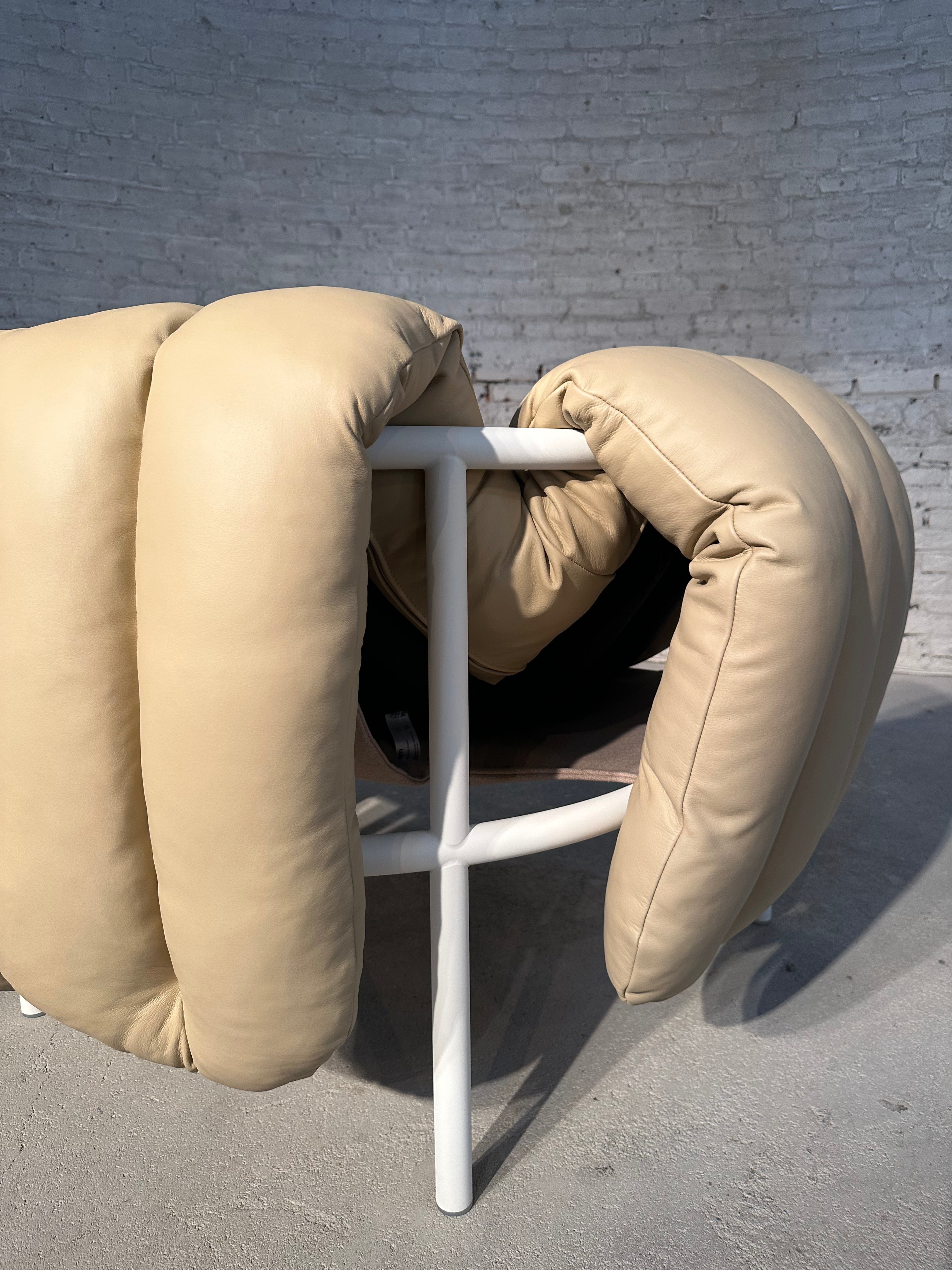 This version with cream base and sand leather is showed in our habitat and also for rent. The Puffy Chair frame is available in powder-coated or sand-blasted steel finishes and a choice of thick canvas, chunky bouclé or luxurious leather upholstery. Please drop us a line if you would need more info about all options.