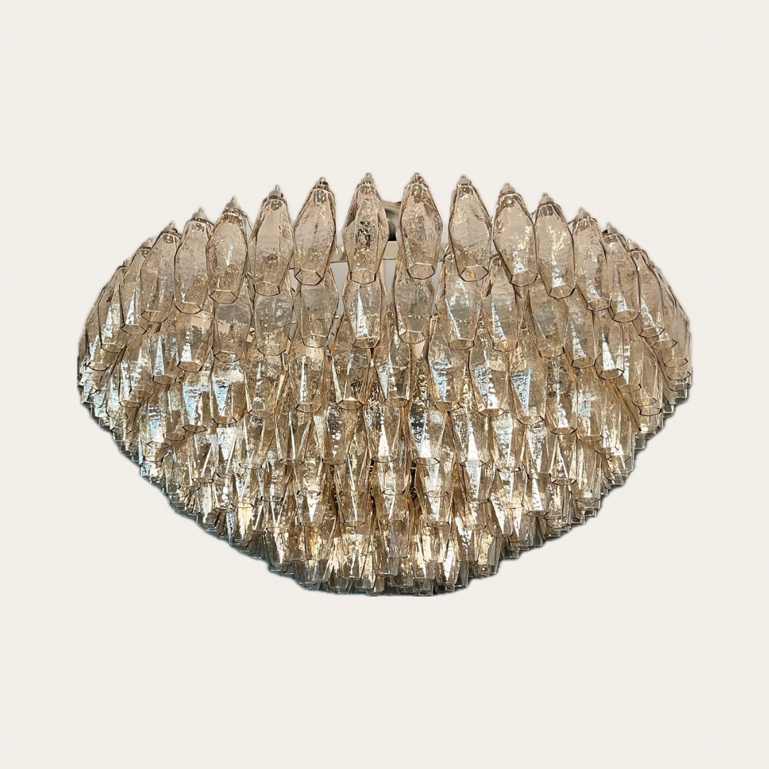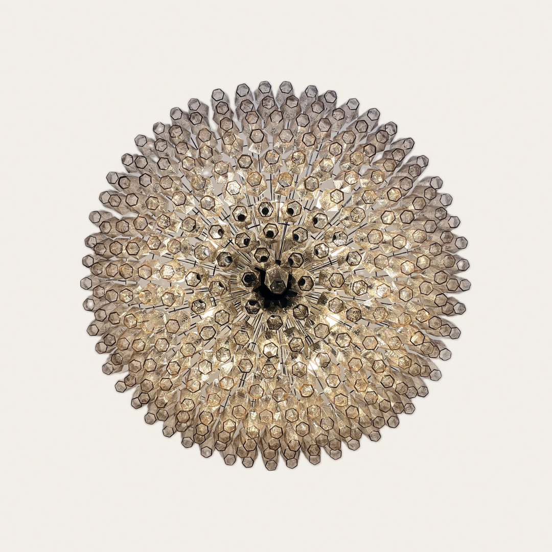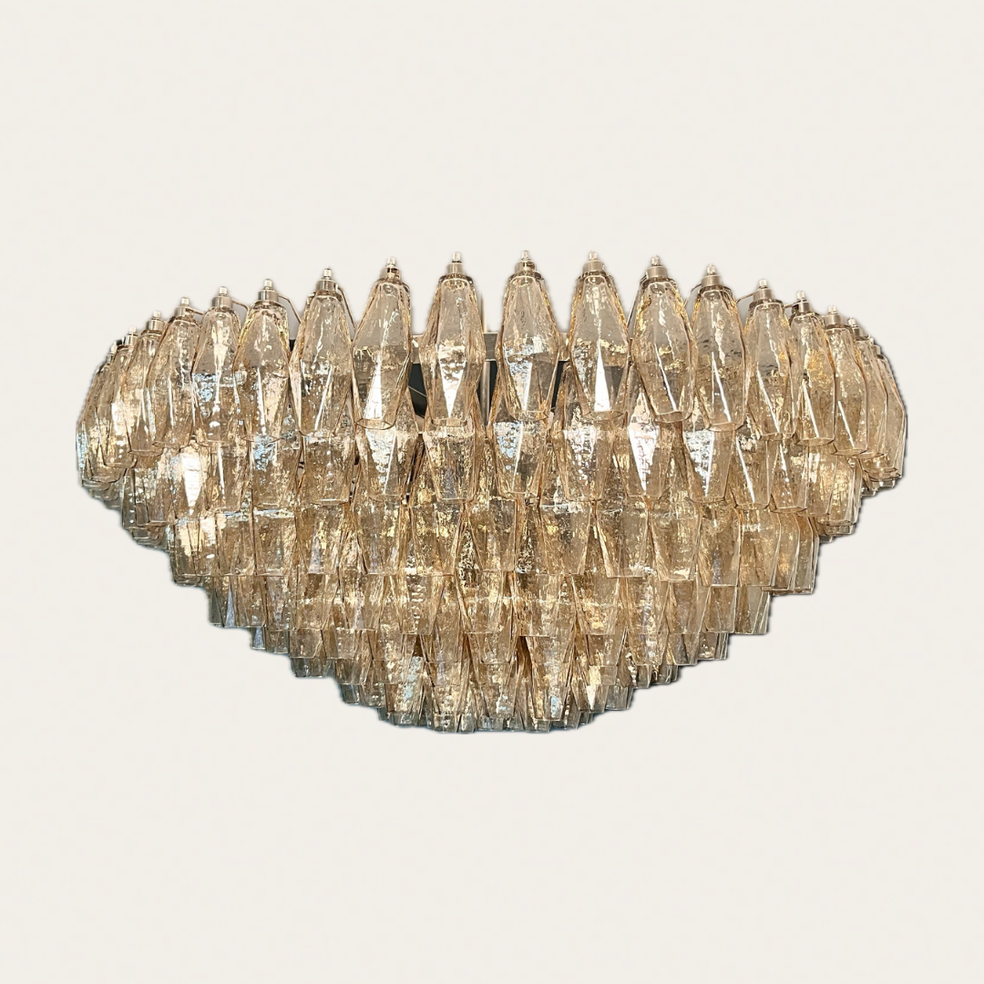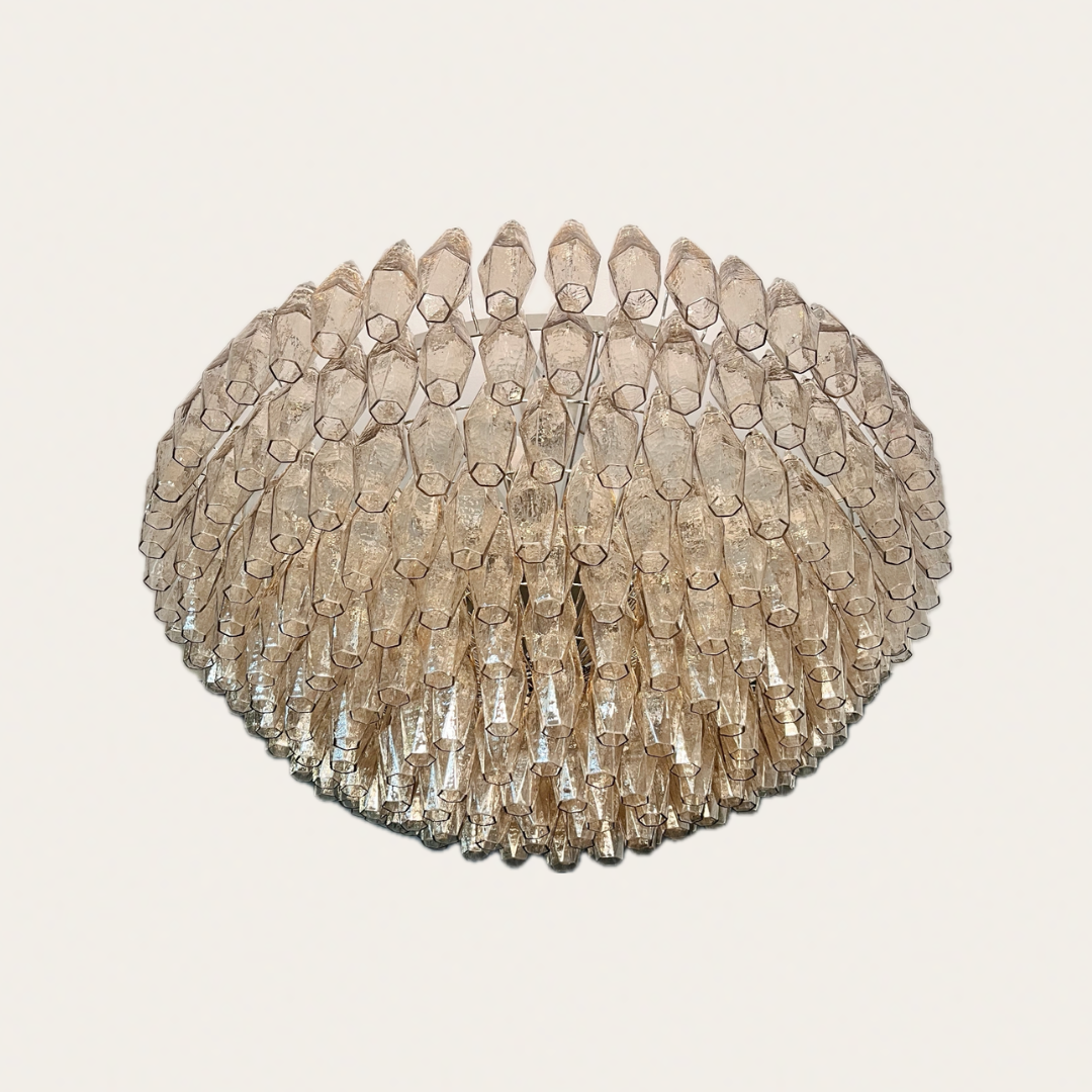 Murano glass, an art form perfected over centuries on the Venetian island of Murano, is renowned for its meticulous craftsmanship. The poliedri design, first introduced in the mid-20th century, embodies both structure and fluidity. The smoked glass variation, with its subtle transparency and depth, adds a sense of mystery—smoky veils of light that soften the sharp edges of its crystalline.