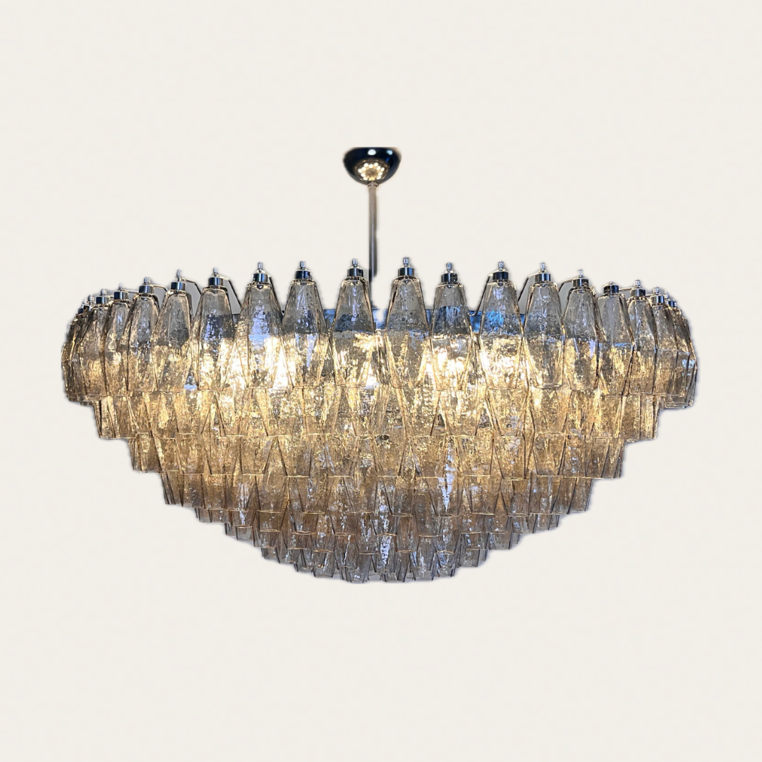 Unlike traditional chandeliers, the Poliedri Murano does not simply illuminate a space; it transforms it. In smoked glass, the interplay between darkness and illumination becomes almost theatrical—shadows dance on the walls, golden glows shimmer on polished surfaces, and the chandelier itself seems to float, ethereal and weightless.