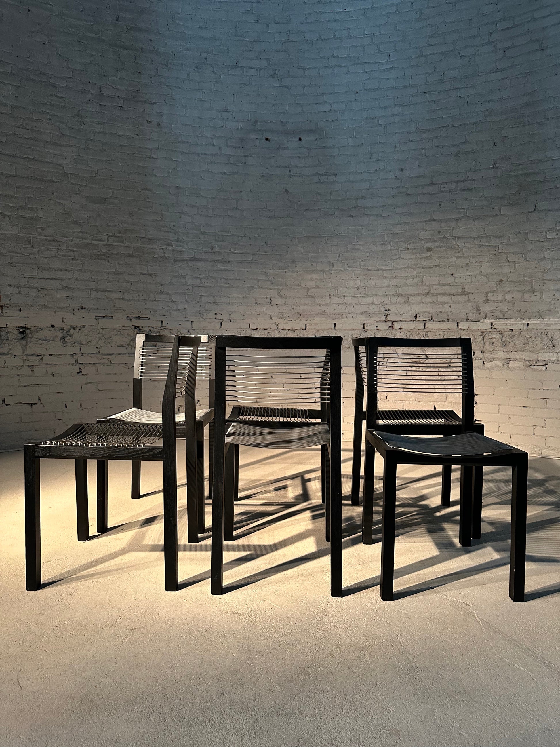 Design your dining space with something truly unique. These vintage-inspired Ligne Roset dining chairs are made with black oakwood and crafted with an atypical retro style, sure to bring personality to your eclectic interiors! Sit comfortably and enjoy dinner in one-of-a-kind style. Will be sold as a set of 6 pieces.