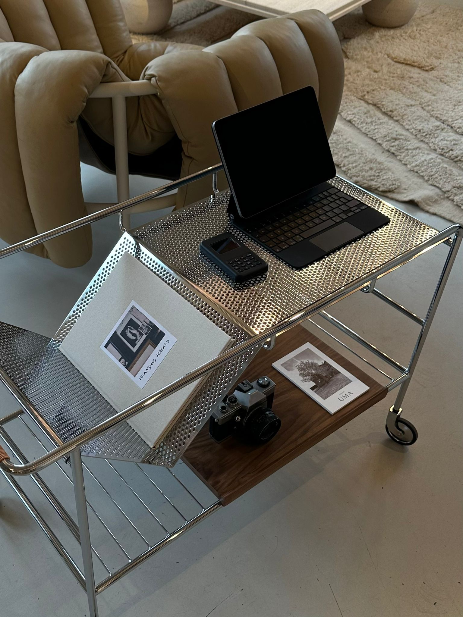 The trolley is made of bent and welded tubes, and the leather cord is carefully webbed around the handle. The wooden tray is made of a veneer plate and milled edges in solid walnut wood.